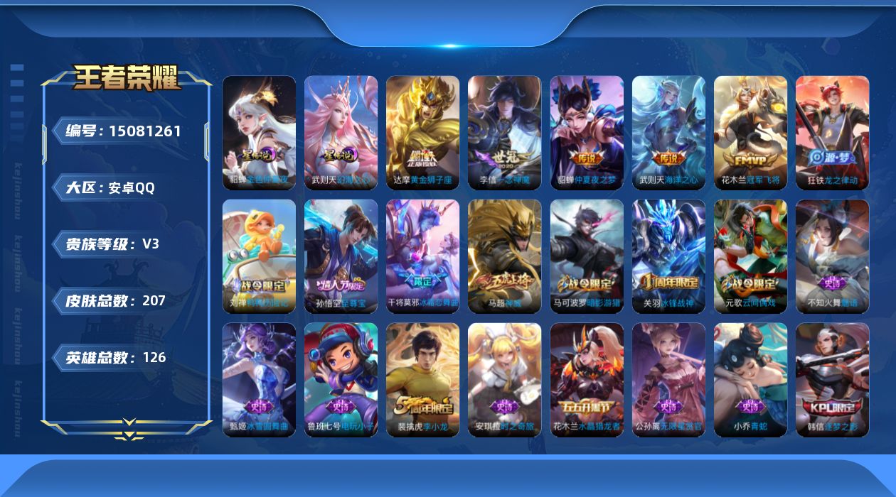 - [11523337]V9 3典藏 18传说 125英雄 332皮肤 典藏英雄武则天 可修改实名 荣耀水晶:鸣剑·曳影,全息碎影(猴子典藏),杀手不太冷 传说皮:黄金狮子座,黄金射手座,仲夏夜之梦(大飞蛾),海洋之心,地狱之眼,一念神魔,久胜战神,云鹰飞将(小将军),炽阳神光,超时空战士-狄仁杰 珍宝阁皮:妄想食味,优雅恋人,玩趣恶龙 限定皮:鸣野蒿,至尊宝,白虎志(电光耗子),凤求凰(白切鸡),太华(伽罗年限),梅西,白晶晶,时雨天司(水龙头),神威(电光马子),遇见飞天,高山流水,五谷丰年,冰锋战神,天狼运算者,游园惊梦,梁祝,御风骁将(吕布年限),祈雪灵祝(雪兔子),李小龙,逐梦之影,辉光之辰,霸王别姬-项羽,纯白花嫁,猪悟能,一生所爱,大圣娶亲,天魔缭乱,青春决赛季,冰霜恋舞曲 史诗皮:鸭鸭历险记-刘禅,龙之律动,百相守梦-黄忠,怒海争锋,百相守梦-周瑜,幻珠鲛人,遇见神鹿,紫霞仙子,苍穹之光,电玩小子(小书包),白龙吟,黄金分割率,特工魅影,千年之狐,永昼,末日机甲-莱西奥,蒙恬荣光圣徽,冰冠公主,偶像歌手,晚萤,魅语,暗夜猫娘,末日机甲-吕布,猫狗日记-孙策,猫狗日记-大乔,乱世虎臣,节奏热浪,修罗,女仆咖啡,摇滚巨星,水果甜心,绅士熊喵,天才门将,星夜王子,心灵骇客,功夫厨神,德古拉伯爵,暗隐猎兽者,幽灵船长,鬼剑武藏,心灵战警,天秀·启明,舞动绿茵,地狱岩魂,纤云弄巧,繁星吟游(呼啦呼啦),拒霜思,缤纷独角兽,乘风破浪,逐浪之夏,水晶猎龙者,曙光守护者,箭羽风息,金属风暴,原初追逐者,圣诞狂欢,圣诞恋歌,鹰眼统帅,暗夜贵公子,魅力维加斯,黎明之约,赏金猎手,奇遇舞章,无心,未来纪元-赵云
