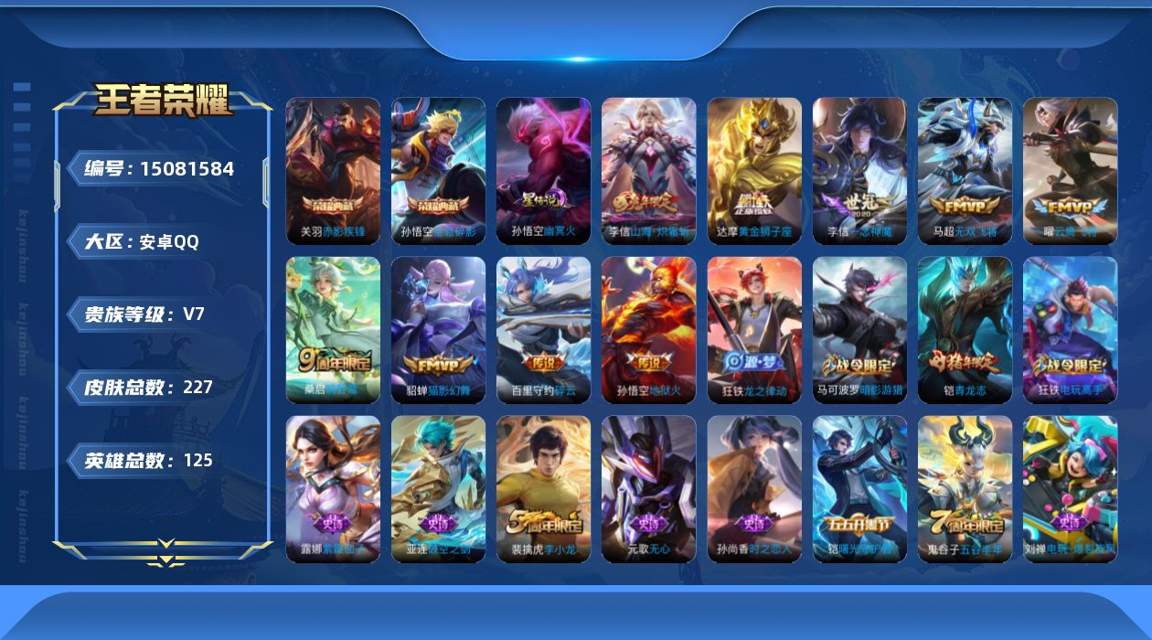 [15081584]【店主推荐捡漏号!可直接换绑】安卓Q-V7-永恒钻石I段位-125英雄-227皮肤-2典藏皮肤-9传说-54史诗