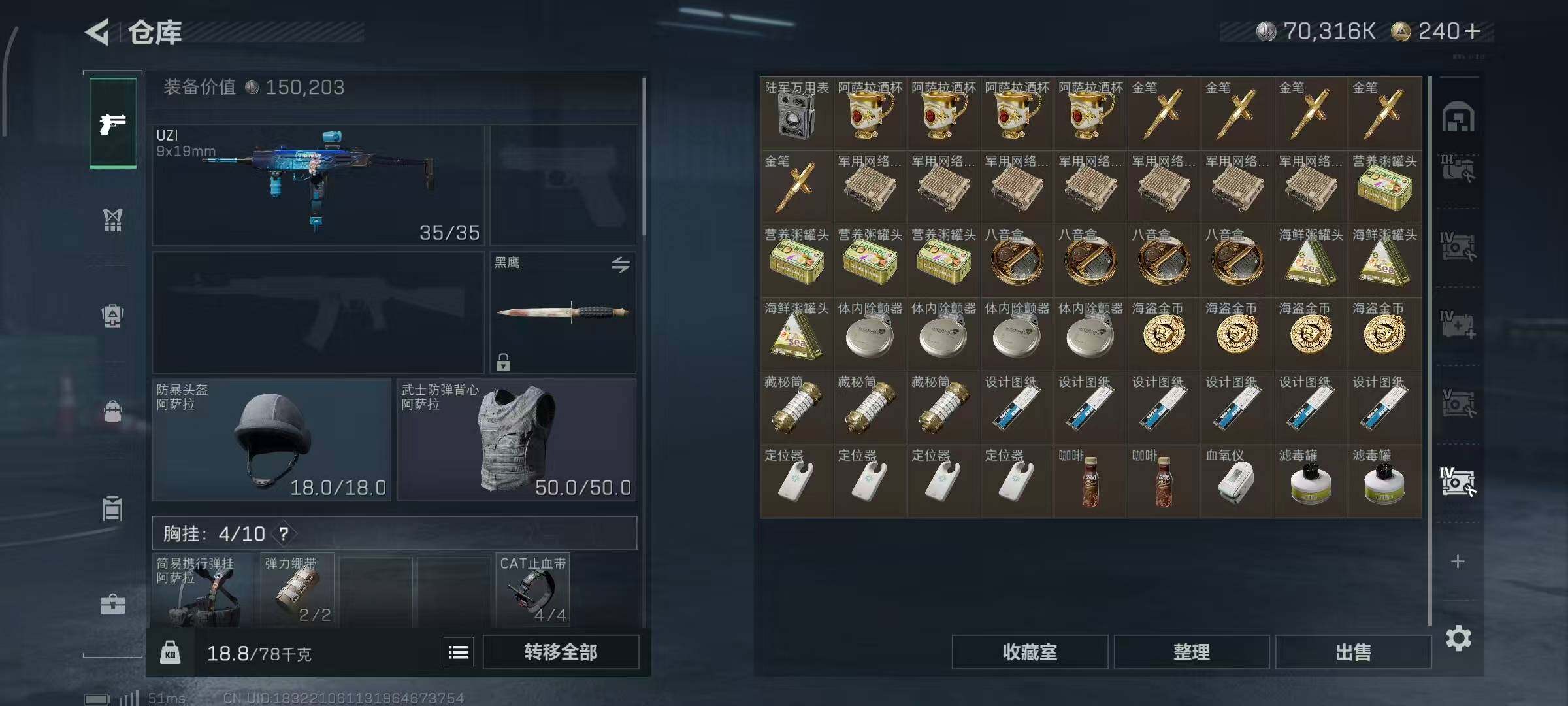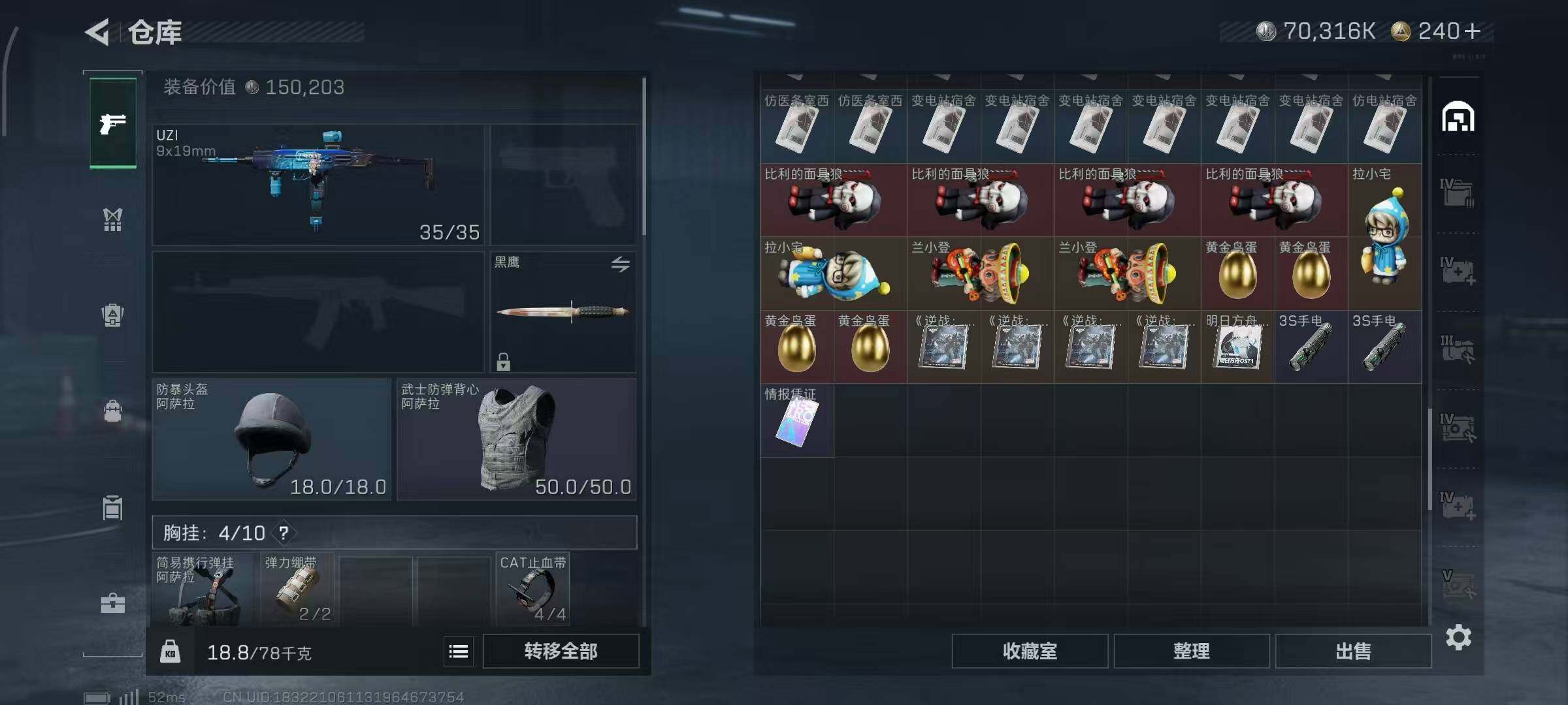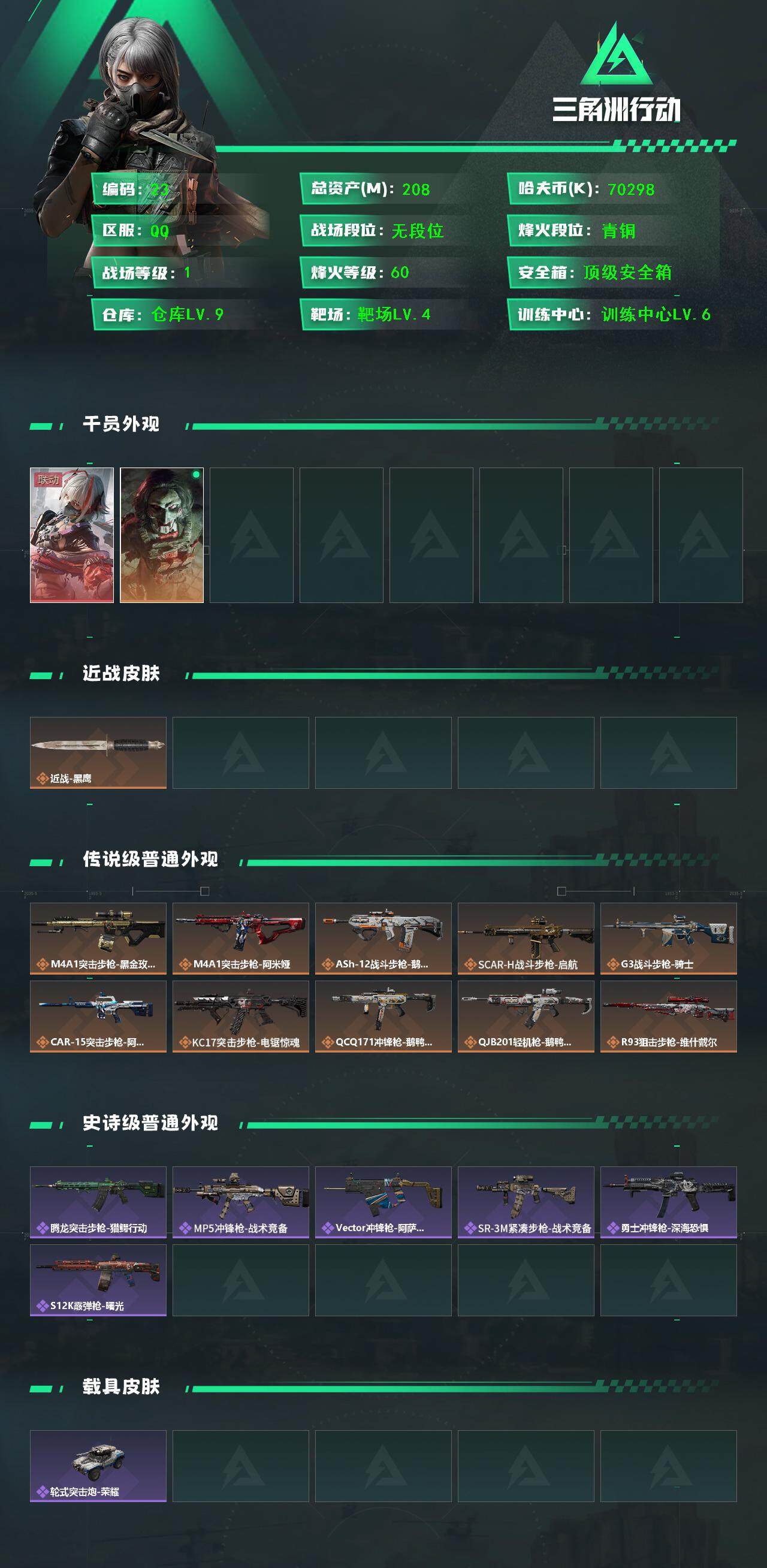[15081708]208m总资产-70298k哈伏币-60烽火等级-青铜-1战场等级-无军衔 【干员外观】:骇爪-维什戴尔,红狼-电锯惊魂 【近战皮肤】:近战-黑鹰 【传说外观】:M4A1突击步枪-蚀金玫瑰,M4A1突击步枪-阿米娅,ASh-12战斗步枪-鹅鸭杀,SCAR-H战斗步枪-启航,G3战斗步枪-骑士,CAR-15突击步枪-阿米娅,KC17突击步枪-电锯惊魂,QCQ171冲锋枪-鹅鸭杀,QJB201轻机枪-鹅鸭杀,R93狙击步枪-维什戴尔 【史诗外观】:腾龙突击步枪-猎鳄行动,MP5冲锋枪-战术竞备,Vector冲锋枪-阿萨拉文明,SR-3M紧凑突击步枪-战术竞备,勇士冲锋枪-深海恐惧,S12K霰弹枪-曙光 【稀有外观】:M870霰弹枪-地平线,M7战斗步枪-捣蛋鬼,SCAR-H战斗步枪-荣耀列队,腾龙突击步枪-冰天雪地,P90冲锋枪-黄昏,P90冲锋枪-捣蛋鬼,Vector冲锋枪-先锋,UZI冲锋枪-亚特兰蒂斯,SMG-45-行动开启,SMG-45冲锋枪-幻影结构,勇士冲锋枪-冰天雪地,M1014霰弹枪-幻影结构,M249轻机枪-毛鲁斯之力,QJB201轻机枪-哈夫克卫队,Mini-14射手步枪-荣耀列队,SKS射手步枪-弄臣,SR-25射手步枪-开拓,SV-98狙击步枪-星链科技,SV-98狙击步枪-哈夫克航天,SV-98狙击步枪-精英联盟 【普通外观】:AK-12突击步枪-旧工业,QBZ95-1突击步枪-高雅黑,QBZ95-1突击步枪-海浪,QBZ95-1突击步枪-海色,K416突击步枪-几何迷彩,K416突击步枪-高雅黑,M16A4突击步枪-高雅黑,SG552突击步枪-浅蓝涂装,SG552突击步枪-海浪,SCAR-H战斗步枪-数码迷彩,PTR-32突击步枪-黄蜂,MP5冲锋枪-海色,MP5冲锋枪-黄蜂,Vector冲锋枪-几何迷彩,UZI冲锋枪-海色,M1014霰弹枪-高雅黑,M1014霰弹枪-海浪,M249轻机枪-黄蜂,M250通用机枪-条纹,SVD狙击步枪-高雅黑,SR-25射手步枪-黄蜂,SV-98狙击步枪-红色涂装,QSZ92G-条纹,沙漠之鹰-海浪,沙漠之鹰-高雅黑 【载具外观】:轮式突击炮-荣耀 【军牌】:军牌-静谧时光,军牌-享受音乐,军牌-永恒,军牌-信誉优秀 【挂饰】:挂饰-维什戴尔,挂饰-诡影狙击兵*2,挂饰-诡影喷火兵,挂饰-暗行哨兵*4,挂饰