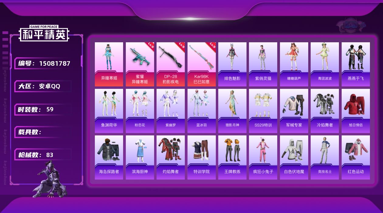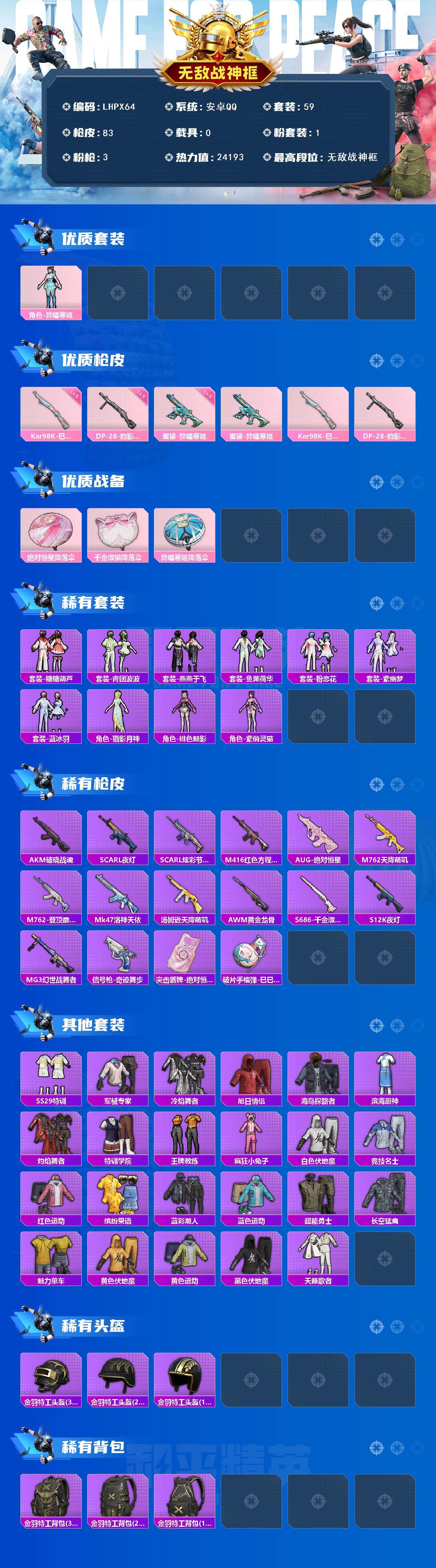 [15081787]【店主推荐捡漏号!可直接换绑】地铁满天赋 安卓 手Q-无敌战神框-1粉装-3特效枪-0载具-1粉色飞行器-24193热力值-8王牌印记-59套装-83枪皮 【粉色套装】:角色-异瞳寒姬 【粉色枪皮等级】:蜜獾-异瞳寒姬(五级),Kar98K-巳巳如意(五级),DP-28-豹影疾电(五级) 【粉色枪皮】:蜜獾-异瞳寒姬,Kar98K-巳巳如意,DP-28-豹影疾电 【粉色降落伞】:绝对恒星降落伞,千金淑猫降落伞,异瞳寒姬降落伞 【稀有套装】:套装-糖糖葫芦,套装-青团波波,套装-燕燕于飞,套装-鱼渊荷华,套装-粉恋花,套装-紫幽梦,套装-蓝冰羽,角色-猎影月神,角色-绯色魅影,角色-紫俏灵猫,套装-炫彩糖果 【稀有枪皮】:AUG-冰晶雪宝,AKM-破晓战魂,SCAR-L-夜灯,SCAR-L-炫彩节奏,M416-红色方程式,AUG-绝对恒星,M762-天降萌叽,M762-登顶巅峰,Mk47-洛神天依,汤姆逊-天降萌叽,AWM-黄金龙骨,S686-千金淑猫,S12K-夜灯,MG3-幻世战舞者,信号枪-奇迹舞步,突击盾牌-绝对恒星,破片手榴弹-巳巳如意 【其他套装】:套装-SS29特训,套装-军械专家,套装-冷焰舞者,套装-旭日情侣,套装-海岛探路者,套装-滨海厨神,套装-灼焰舞者,套装-特训学院,套装-王牌教练,套装-疯狂小兔子,套装-白色伏地魔,套装-竞技名士,套装-红色运动,套装-缤纷果语,套装-蓝彩潮人,套装-蓝色运动,套装-超能勇士,套装-长空猛禽,套装-魅力单车,套装-黄色伏地魔,套装-黄色运动,套装-黑色伏地魔,套装-天籁歌者 【稀有头盔】:金羽特工头盔(3级),金羽特工头盔(2级),金羽特工头盔(1级) 【稀有背包】:金羽特工背包(3级),金羽特工背包(2级),金羽特工背包(1级) 【营地ID】:979343134