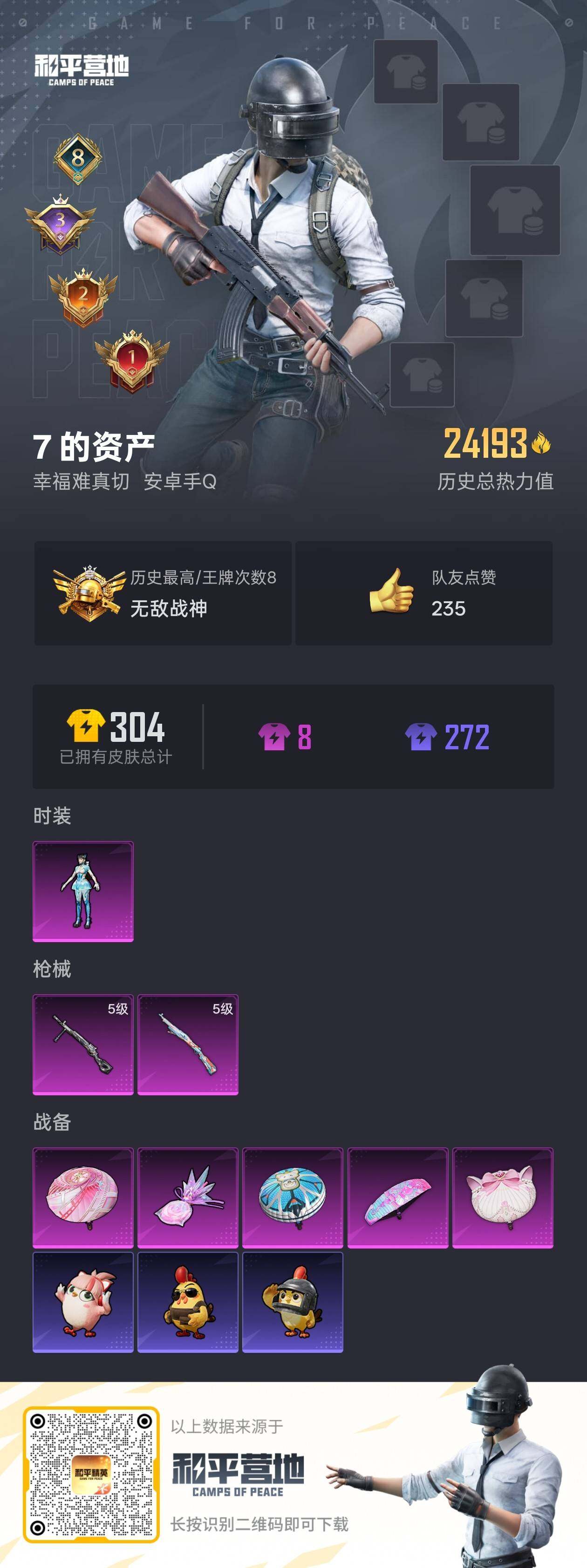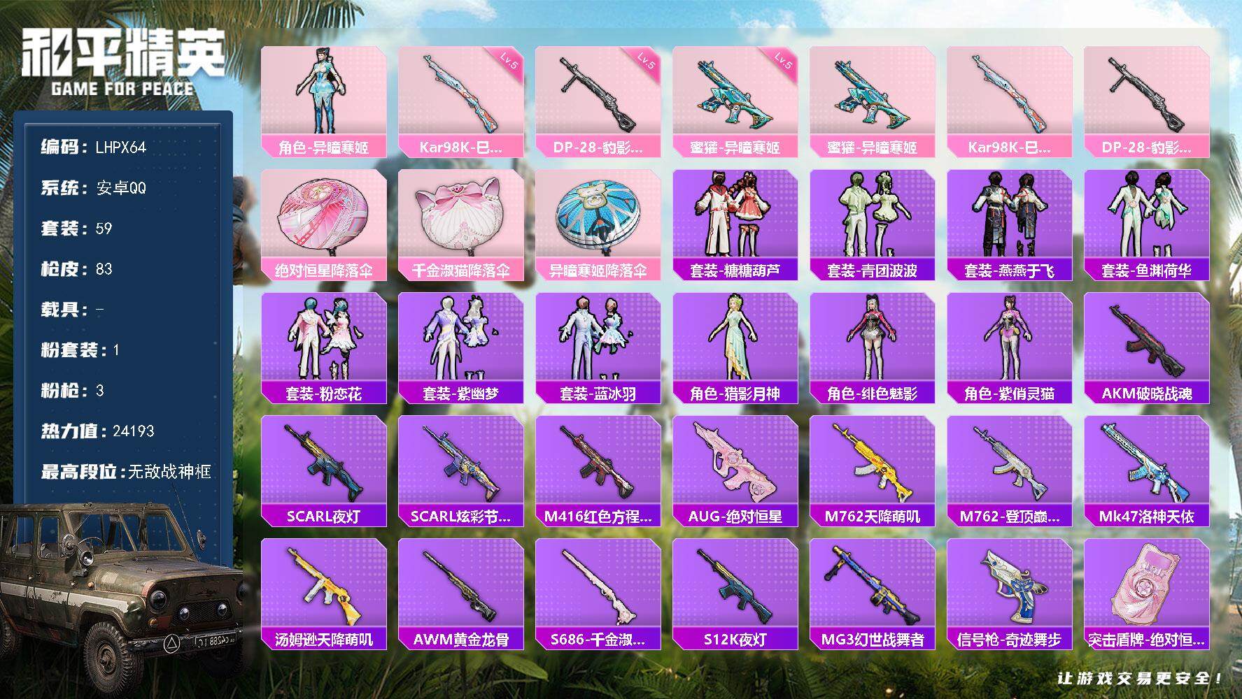 [15081787]【店主推荐捡漏号!可直接换绑】地铁满天赋 安卓 手Q-无敌战神框-1粉装-3特效枪-0载具-1粉色飞行器-24193热力值-8王牌印记-59套装-83枪皮