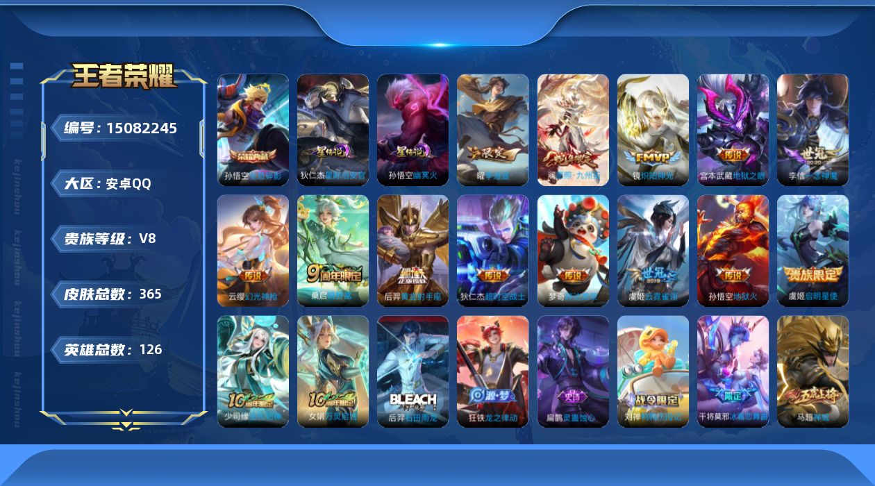 [15082245]【店主推荐捡漏号!可直接换绑】安卓Q-V8-最强王者段位-126英雄-365皮肤-1典藏皮肤-14传说-105史诗