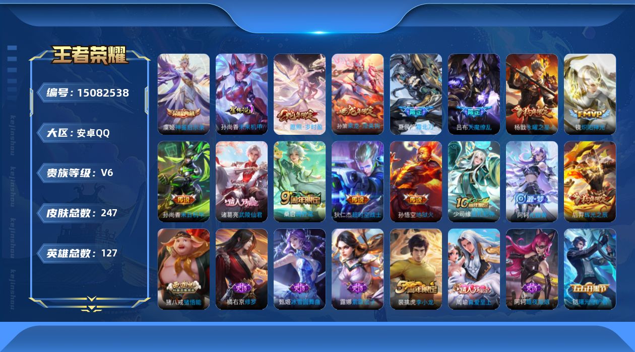 [15082538]可二次【店主推荐捡漏号!可直接换绑/1市标】:安卓Q-V7-尊贵铂金III段位-127英雄-247皮肤-1典藏皮肤-1星元-12传说-64史诗 【荣耀典藏】:虞姬神鉴启示录 【传说皮肤】:后羿神树通天,虞姬愿照岁时盈,桑启鸣野蒿,夏侯惇霜北刀,孙策乘龙淬吴钩,镜炽阳神光,杨戬永曜之星,诸葛亮武陵仙君,孙尚香末日机甲,孙悟空地狱火,吕布天魔缭乱,狄仁杰超时空战士 【限定皮肤】:白起狰,夏侯惇霜北刀,蒙犽顽岩魄,蔡文姬夏日便利店,大乔绒语心约,虞姬夏日便利店,姜子牙天穹之誓,狄仁杰阴阳师,虞姬凯尔特女王,赵云皇家上将,妲己热情桑巴,鲁班七号狮舞东方,庄周蜃楼王,庄周云端筑梦师,庄周高山流水,高渐离死亡摇滚,钟无艳王者之锤,孙膑妖精王,扁鹊炼金王,吕布天魔缭乱,周瑜真爱至上,夏侯惇匿光决锋者,曹操烛龙,狄仁杰魔术师,达摩沙漠行僧,项羽海滩派对,兰陵王金庭之子,亚瑟狮心王,孙悟空美猴王,后羿辉光之辰,后羿圣弓游侠,李元芳云中旅人,钟馗驱傩正仪,杨戬永曜之星,干将莫邪真爱魔法,雅典娜黎明之约,鬼谷子五谷丰年,诸葛亮武陵仙君,苏烈千军破阵,沈梦溪大漠名商,裴擒虎李小龙,裴擒虎擒涛扼浪,猪八戒猪悟能,嫦娥拒霜思,嫦娥暖冬兔眠,鲁班大师探海日志,桑启海盐诗旅,暃星界游侠,艾琳女武神,张良古海寻踪,鬼谷子天穹祈灯,孙策乘龙淬吴钩,鲁班七号蔬乡物语,李元芳蔬乡物语,刘邦剑破天穹,程咬金群星魔术团,镜青焰无极,项羽苍威无极,刘备异域游侠,芈月浮光幕影,周瑜熔金海岸 【年限皮肤】:孙悟空美猴王,杨戬永曜之星,后羿辉光之辰,孙策乘龙淬吴钩 【赛季限定】:庄周蜃楼王,孙膑妖精王,扁鹊炼金王,白起狰,曹操烛龙,达摩沙漠行僧,兰陵王金庭之子,张良古海寻踪,亚瑟狮心王,李元芳云中旅人,虞姬凯尔特女王,钟馗驱傩正仪,雅典娜黎明之约,苏烈千军破阵,沈梦溪大漠名商,裴擒虎擒涛扼浪,鲁班大师探海日志,桑启海盐诗旅,鬼谷子天穹祈灯,刘邦剑破天穹,姜子牙天穹之誓 【战令限定】:蔡文姬夏日便利店,虞姬夏日便利店,鲁班七号狮舞东方,后羿圣弓游侠,干将莫邪真爱魔法,嫦娥暖冬兔眠,暃星界游侠,鲁班七号蔬乡物语,李元芳蔬乡物语,镜青焰无极,项羽苍威无极 【史诗皮肤】:项羽苍穹之光,露娜紫霞仙子,阿轲暗夜猫娘,钟无艳王者之锤,赵云皇家上将,貂蝉圣诞恋歌,甄姬冰雪圆舞曲,王昭君偶像歌手,狄仁杰魔术师,廉颇地狱岩魂,宫本武藏