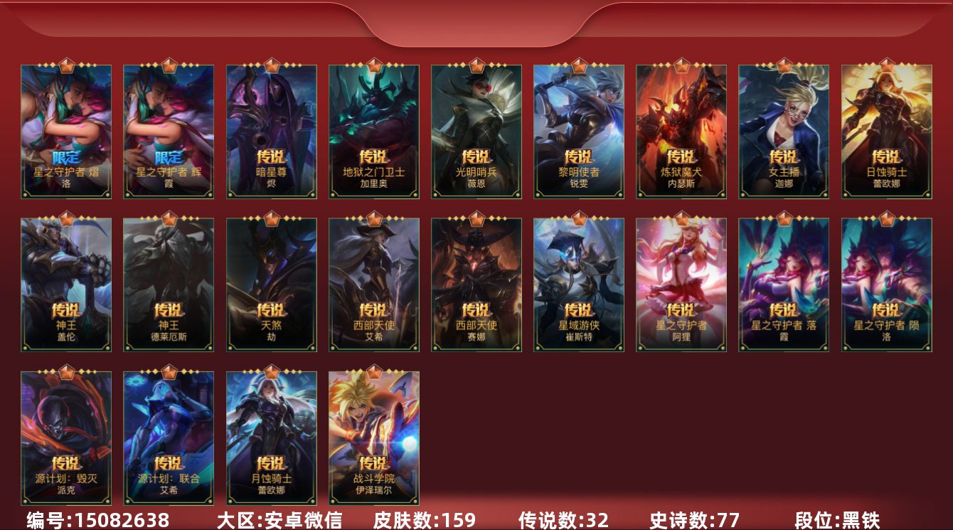 [15082638]159皮肤32传说!龙的传人李青星守霞洛灌篮高手天煞劫神王盖伦洛手,神王 盖伦,星之守护者 阿狸,天煞 劫,星之守护者 辉 霞,星之守护者 落 霞,星之守护者 陨 洛,星之守护者 熠 洛,女主播 迦娜,源计划:联合 艾希,西部天使 艾希,黎明使者 锐雯,战斗学院 伊泽瑞尔,地狱之门卫士 加里奥,西部天使 赛娜,源计划:毁灭 派克,神王 德莱厄斯,炼狱魔犬 内瑟斯,暗星尊 烬,光明哨兵 薇恩,星域游侠 崔斯特,日蚀骑士 蕾欧娜,月蚀骑士 蕾欧娜