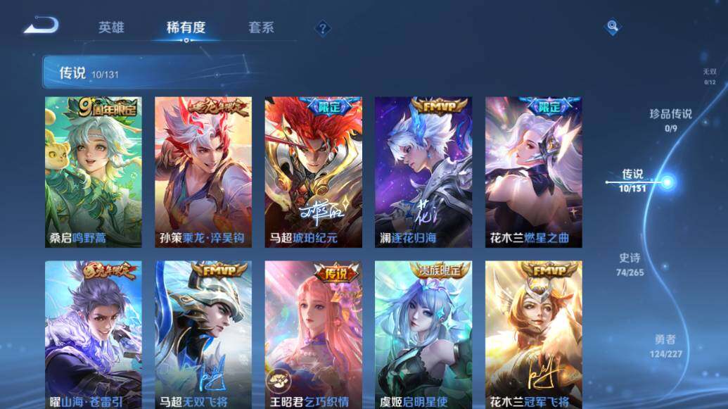【传说皮肤】:桑启鸣野蒿,孙策乘龙淬吴钩,马超琥珀纪元,澜逐花归海,花木兰燃星之曲,曜山海苍雷引,马超无双飞将,王昭君乞巧织情,虞姬启明星使,花木兰冠军飞将