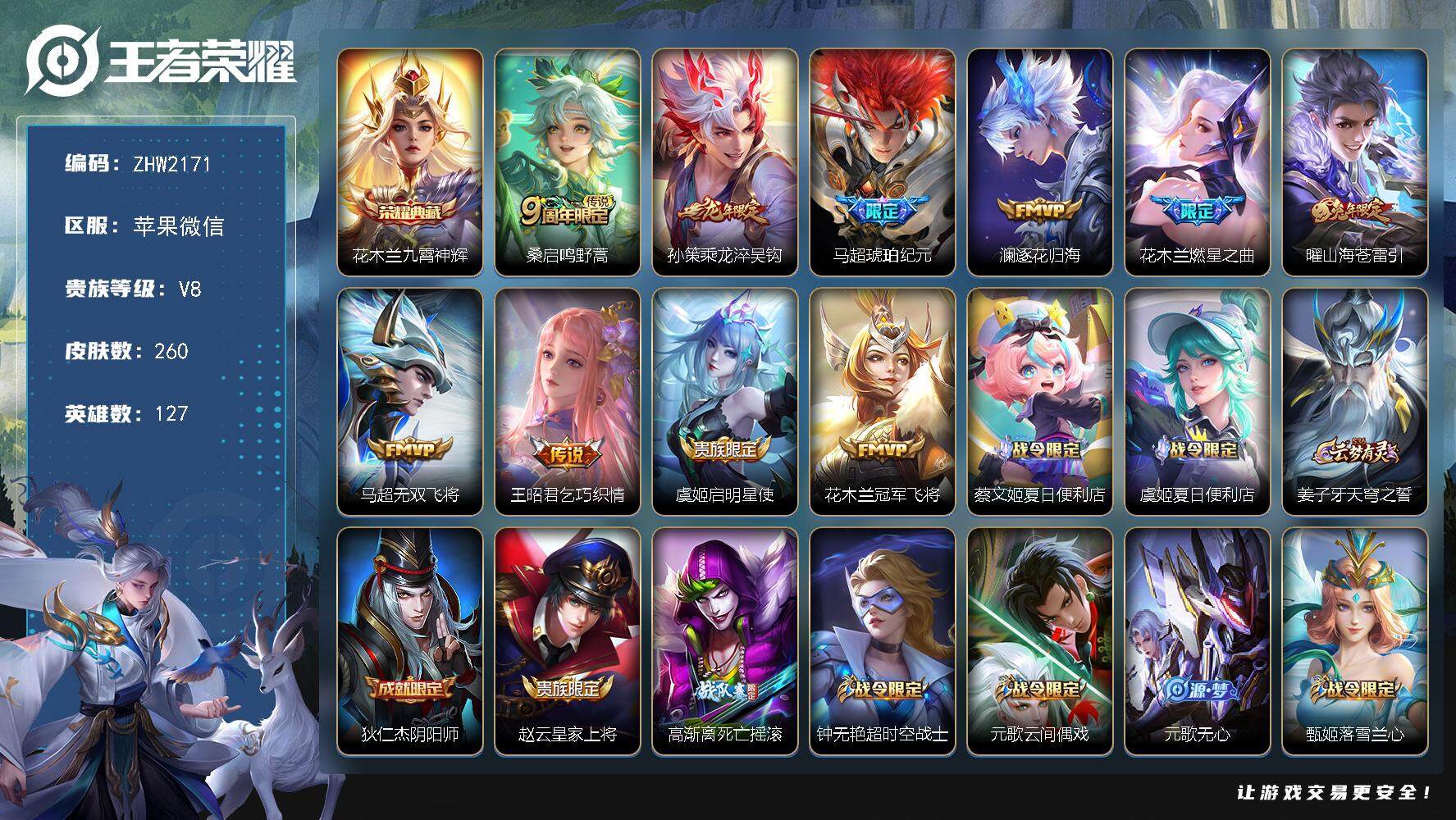 [15082663]苹果WX-V8-最强王者段位-127英雄-260皮肤-1典藏皮肤-10传说-74史诗-小国花木兰-51段对抗路-连体和平精英:3粉2枪,火箭雪国 【英雄全皮】:孙权全皮,花木兰全皮,马超全皮,蒙恬全皮 【荣耀典藏】:花木兰九霄神辉 【传说皮肤】:桑启鸣野蒿,孙策乘龙淬吴钩,马超琥珀纪元,澜逐花归海,花木兰燃星之曲,曜山海苍雷引,马超无双飞将,王昭君乞巧织情,虞姬启明星使,花木兰冠军飞将 【限定皮肤】:蔡文姬夏日便利店,虞姬夏日便利店,姜子牙天穹之誓,狄仁杰阴阳师,赵云皇家上将,高渐离死亡摇滚,钟无艳超时空战士,元歌云间偶戏,元歌无心,甄姬落雪兰心,狄仁杰魔术师,达摩沙漠行僧,项羽海滩派对,关羽百相守梦,兰陵王金庭之子,花木兰青春决赛季,花木兰瑞麟志,花木兰默契交锋,花木兰燃星之曲,李元芳云中旅人,虞姬启明星使,女娲朔望之晖,干将莫邪胡桃夹子,雅典娜黎明之约,鬼谷子五谷丰年,铠青龙志,百里玄策原初追逐者,梦奇顽趣,沈梦溪大漠名商,裴擒虎李小龙,裴擒虎擒涛扼浪,米莱狄胡桃异想国,云中君纤云弄巧,上官婉儿梁祝,曜山海苍雷引,西施玲珑珍味,鲁班大师探海日志,桑启海盐诗旅,戈娅驭风魔法,艾琳流音漫舞,司空震地狱燃心,阿古朵江河有灵,张良古海寻踪,蒙犽百解令,蒙恬荣光圣徽,高渐离燃音魔法,妲己灵卜魔法,鬼谷子天穹祈灯,马超琥珀纪元,姬小满妄想食味,孙策乘龙淬吴钩,沈梦溪龙舞盛年,鲁班七号蔬乡物语,李元芳蔬乡物语,刘邦剑破天穹,程咬金群星魔术团,关羽决胜骁骑,镜青焰无极,项羽苍威无极,芈月浮光幕影,周瑜熔金海岸 【年限皮肤】:花木兰瑞麟志,铠青龙志,马超神威,曜山海苍雷引,孙策乘龙淬吴钩 【赛季限定】:达摩沙漠行僧,兰陵王金庭之子,张良古海寻踪,李元芳云中旅人,雅典娜黎明之约,百里玄策原初追逐者,梦奇顽趣,沈梦溪大漠名商,裴擒虎擒涛扼浪,鲁班大师探海日志,桑启海盐诗旅,鬼谷子天穹祈灯,蒙恬荣光圣徽,刘邦剑破天穹,姜子牙天穹之誓 【战令限定】:蔡文姬夏日便利店,虞姬夏日便利店,钟无艳超时空战士,元歌云间偶戏,甄姬落雪兰心,艾琳流音漫舞,女娲朔望之晖,米莱狄胡桃异想国,西施玲珑珍味,司空震地狱燃心,戈娅驭风魔法,高渐离燃音魔法,妲己灵卜魔法,鲁班七号蔬乡物语,李元芳蔬乡物语,镜青焰无极,项羽苍威无极 【史诗皮肤】:露娜紫霞仙子,阿轲暗夜猫娘,赵云皇家上将,赵云未来纪元,貂蝉圣诞恋歌