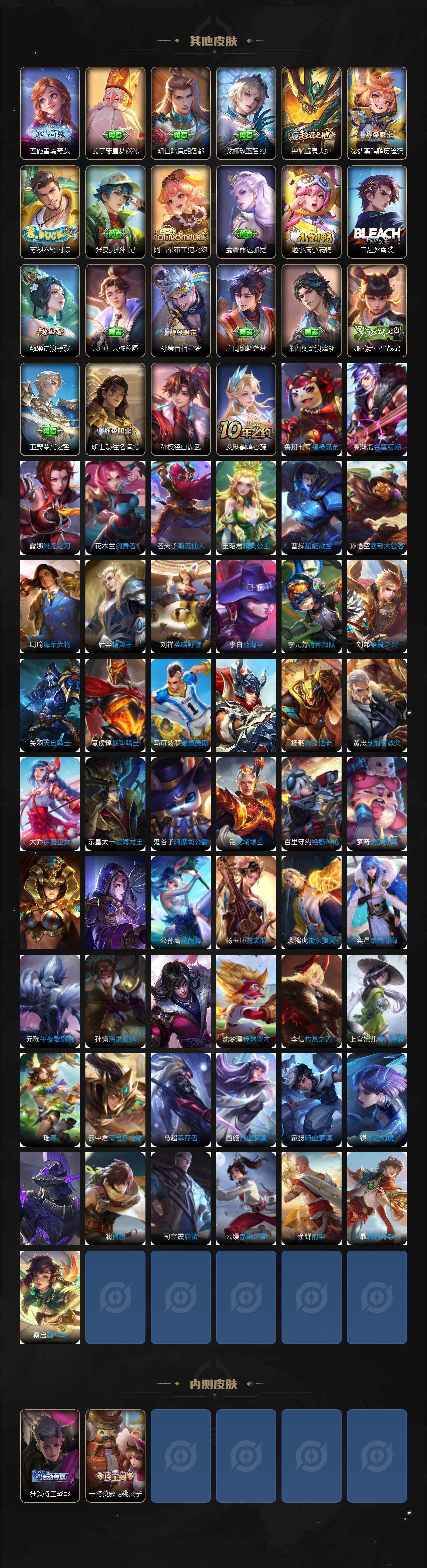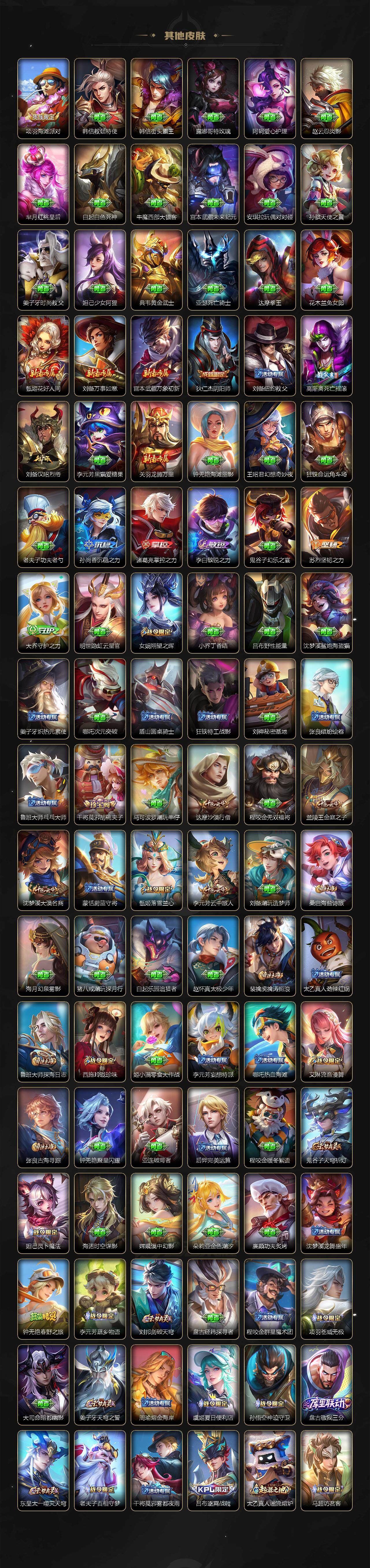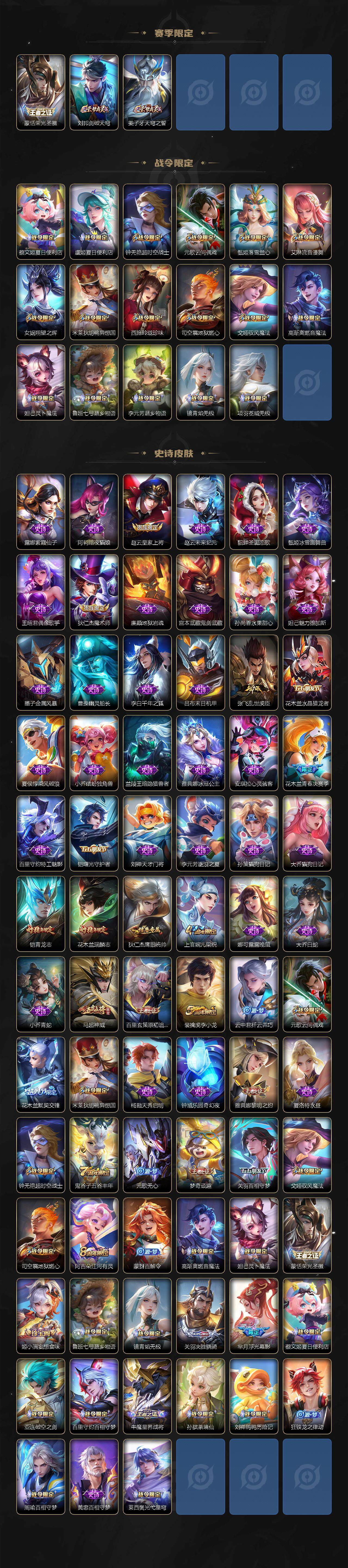 【限定皮肤】:蔡文姬夏日便利店,虞姬夏日便利店,姜子牙天穹之誓,狄仁杰阴阳师,赵云皇家上将,高渐离死亡摇滚,钟无艳超时空战士,元歌云间偶戏,元歌无心,甄姬落雪兰心,狄仁杰魔术师,达摩沙漠行僧,项羽海滩派对,关羽百相守梦,兰陵王金庭之子,花木兰青春决赛季,花木兰瑞麟志,花木兰默契交锋,花木兰燃星之曲,李元芳云中旅人,虞姬启明星使,女娲朔望之晖,干将莫邪胡桃夹子,雅典娜黎明之约,鬼谷子五谷丰年,铠青龙志,百里玄策原初追逐者,梦奇顽趣,沈梦溪大漠名商,裴擒虎李小龙,裴擒虎擒涛扼浪,米莱狄胡桃异想国,云中君纤云弄巧,上官婉儿梁祝,曜山海苍雷引,西施玲珑珍味,鲁班大师探海日志,桑启海盐诗旅,戈娅驭风魔法,艾琳流音漫舞,司空震地狱燃心,阿古朵江河有灵,张良古海寻踪,蒙犽百解令,蒙恬荣光圣徽,高渐离燃音魔法,妲己灵卜魔法,鬼谷子天穹祈灯,马超琥珀纪元,姬小满妄想食味,孙策乘龙淬吴钩,沈梦溪龙舞盛年,鲁班七号蔬乡物语,李元芳蔬乡物语,刘邦剑破天穹,程咬金群星魔术团,关羽决胜骁骑,镜青焰无极,项羽苍威无极,芈月浮光幕影,周瑜熔金海岸
