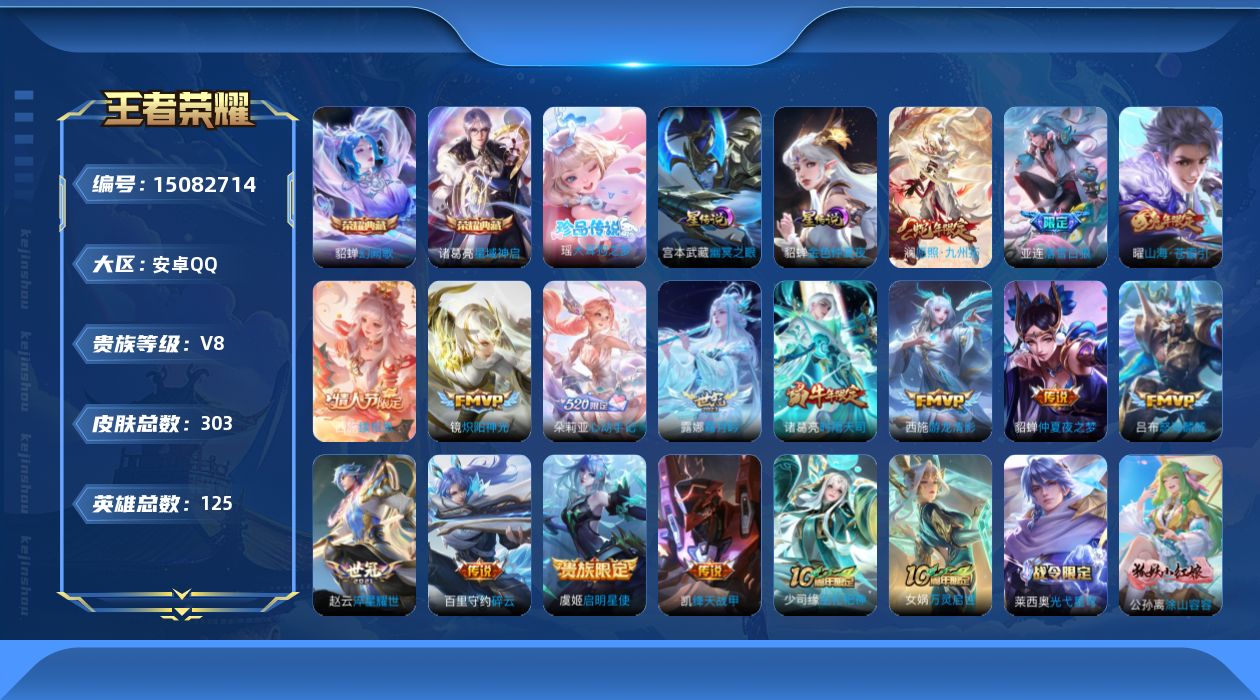 [15082714]【店主推荐捡漏号!可直接换绑】万战橘右京、万战大司马,打野57段,安卓Q-V8-最强王者段位-125英雄-303皮肤-2典藏皮肤-1珍品传说-2星传说-15传说-92史诗 【英雄全皮】:孙权全皮,鬼谷子全皮,空空儿全皮,影全皮 【荣耀典藏】:诸葛亮星域神启,貂蝉幻阙歌 【珍品传说】:瑶大耳狗之梦 【传说皮肤】:西施续相思,澜愿照九州拓,朵莉亚心动手记,亚连落雪白狼,露娜霜月吟,曜山海苍雷引,吕布怒海麟威,百里守约碎云,赵云淬星耀世,西施游龙清影,诸葛亮时雨天司,铠绛天战甲,镜炽阳神光,虞姬启明星使,貂蝉仲夏夜之梦 【限定皮肤】:姜子牙天穹之誓,狄仁杰阴阳师,赵云皇家上将,赵云引擎之心,墨子神迹守卫,孙尚香蔷薇恋人,鲁班七号狮舞东方,庄周高山流水,高渐离死亡摇滚,芈月幻夜卜梦,元歌云间偶戏,元歌无心,夏侯惇朔风刀,典韦穷奇,马可波罗暗影游猎,狄仁杰魔术师,狄仁杰万华元夜,达摩沙漠行僧,项羽海滩派对,老夫子醍醐杖,老夫子航海奇遇记,程咬金演武夺筹,露娜一生所爱,兰陵王金庭之子,孙悟空至尊宝,孙悟空大圣娶亲,牛魔御旌,后羿圣弓游侠,李元芳云中旅人,虞姬启明星使,钟馗神迹守卫,钟馗驱傩正仪,干将莫邪冰霜恋舞曲,干将莫邪真爱魔法,雅典娜黎明之约,太乙真人华丽摇滚,鬼谷子原初探秘者,鬼谷子五谷丰年,诸葛亮时雨天司,黄忠火炮绅士,铠青龙志,苏烈千军破阵,百里玄策原初追逐者,百里守约朱雀志,弈星混沌棋,梦奇顽趣,沈梦溪大漠名商,明世隐疑决卦,裴擒虎李小龙,裴擒虎擒涛扼浪,狂铁御狮,米莱狄御霄,云中君纤云弄巧,盾山御銮,猪八戒西部大镖客,猪八戒猪悟能,上官婉儿梁祝,嫦娥拒霜思,曜山海苍雷引,鲁班大师探海日志,桑启海盐诗旅,艾琳女武神,张良古海寻踪,蒙恬荣光圣徽,高渐离燃音魔法,妲己灵卜魔法,鬼谷子天穹祈灯,亚连落雪白狼,沈梦溪龙舞盛年,刘邦剑破天穹,朵莉亚心动手记,周瑜熔金海岸 【年限皮肤】:百里守约朱雀志,铠青龙志,诸葛亮时雨天司,马超神威,曜山海苍雷引 【赛季限定】:夏侯惇朔风刀,典韦穷奇,狄仁杰万华元夜,达摩沙漠行僧,老夫子醍醐杖,程咬金演武夺筹,兰陵王金庭之子,张良古海寻踪,牛魔御旌,李元芳云中旅人,钟馗驱傩正仪,雅典娜黎明之约,鬼谷子原初探秘者,苏烈千军破阵,百里玄策原初追逐者,弈星混沌棋,梦奇顽趣,沈梦溪大漠名商,明世隐疑决卦,裴擒虎擒涛扼浪,狂铁御狮,米莱狄御霄,盾山
