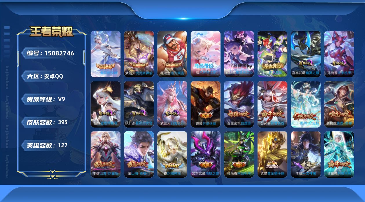 [15082746]【店主推荐捡漏号!可直接换绑】安卓Q-V9-最强王者段位-127英雄-395皮肤-3典藏皮肤-1典藏英雄-3珍品传说-34传说-126史诗