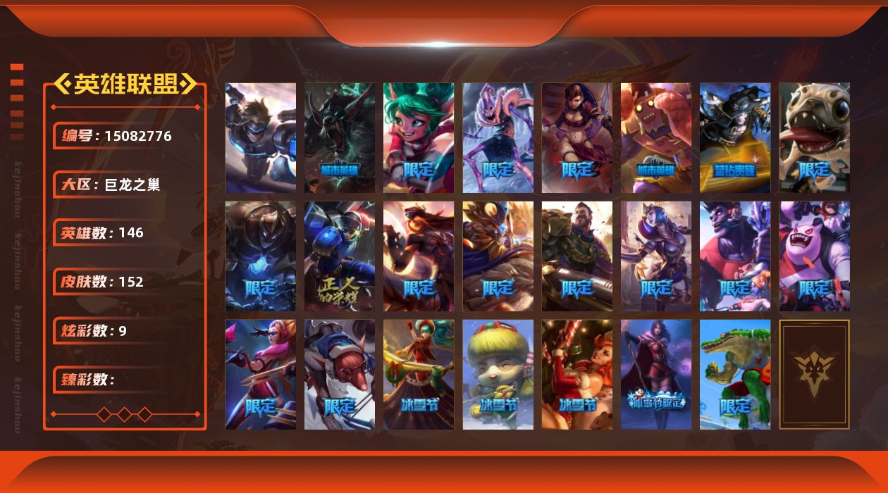 [15082776]青铜段位-146英雄-152皮肤-9炫彩-1终极-0神话-26限定-12传说-45史诗
