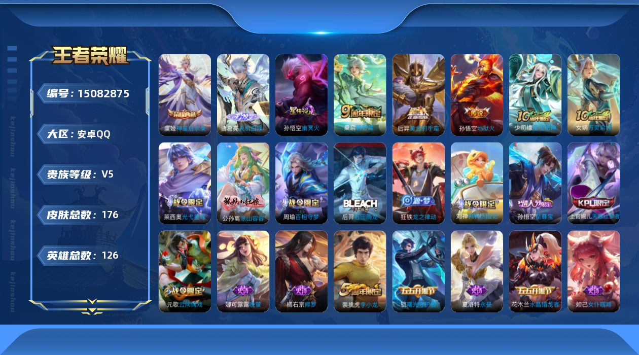 [15082875]【店主推荐捡漏号!可直接换绑】安卓Q-V5-最强王者段位-126英雄-176皮肤-1典藏皮肤-1无双-1星传说-3传说-44史诗