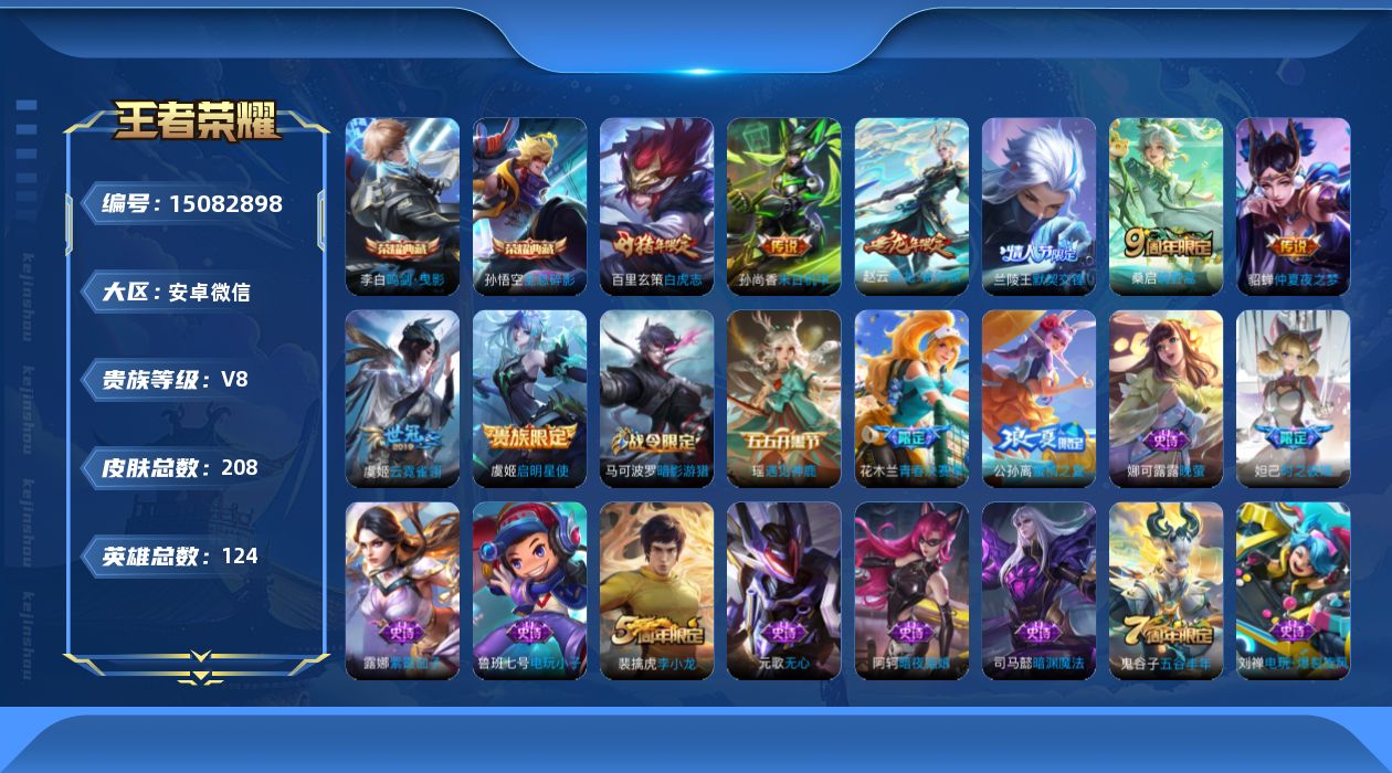 [15082898]安卓WX-V8-荣耀黄金III段位-124英雄-208皮肤-2典藏皮肤-8传说-63史诗