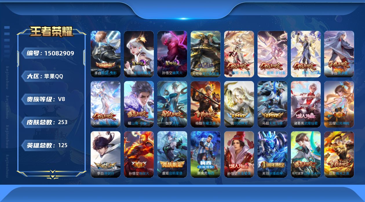 [15082909]可二次【店主推荐捡漏号!可直接换绑】苹果Q-V8-永恒钻石IV段位-125英雄-253皮肤-1典藏皮肤-2星传说-16传说-61史诗 【荣耀典藏】:李白鸣剑曳影 【传说皮肤】:大司命死亡执政官,司空震愿照山河定,女娲愿照千秋盛,澜愿照九州拓,虞姬愿照岁时盈,云缨幻光神枪,曜山海苍雷引,李白诗剑行,马超无双飞将,镜炽阳神光,虞姬启明星使,伽罗太华,杨戬永曜之星,诸葛亮武陵仙君,李白凤求凰,孙悟空地狱火 【限定皮肤】:白起狰,狄仁杰阴阳师,虞姬凯尔特女王,赵云皇家上将,赵云引擎之心,嬴政白昼王子,鲁班七号狮舞东方,庄周高山流水,高渐离死亡摇滚,孙膑妖精王,扁鹊炼金王,芈月重明,吕布猎兽之王,周瑜赤莲之焰,夏侯惇朔风刀,曹操烛龙,典韦穷奇,马可波罗山海玄木吟,狄仁杰魔术师,狄仁杰万华元夜,达摩星际陆战队,达摩沙漠行僧,项羽海滩派对,老夫子醍醐杖,关羽冰锋战神,安琪拉魔法小厨娘,程咬金演武夺筹,韩信逐梦之影,兰陵王驯魔猎人,兰陵王金庭之子,孙悟空大圣娶亲,牛魔御旌,后羿辉光之辰,李元芳云中旅人,虞姬启明星使,钟馗神迹守卫,钟馗驱傩正仪,杨戬永曜之星,雅典娜黎明之约,蔡文姬繁星吟游,太乙真人饕餮,鬼谷子原初探秘者,鬼谷子五谷丰年,诸葛亮武陵仙君,苏烈千军破阵,百里玄策原初追逐者,弈星混沌棋,梦奇顽趣,沈梦溪大漠名商,明世隐疑决卦,裴擒虎李小龙,裴擒虎擒涛扼浪,狂铁御狮,米莱狄御霄,米莱狄胡桃异想国,云中君纤云弄巧,伽罗太华,盾山御銮,猪八戒猪悟能,上官婉儿梁祝,曜山海苍雷引,鲁班大师探海日志,桑启海盐诗旅,艾琳女武神,张良古海寻踪,裴擒虎梅西,蒙恬荣光圣徽,鬼谷子天穹祈灯,姬小满妄想食味,沈梦溪龙舞盛年,刘邦剑破天穹,程咬金群星魔术团 【年限皮肤】:李白凤求凰,杨戬永曜之星,后羿辉光之辰,伽罗太华,马可波罗山海玄木吟,曜山海苍雷引 【赛季限定】:孙膑妖精王,扁鹊炼金王,白起狰,芈月重明,夏侯惇朔风刀,曹操烛龙,典韦穷奇,狄仁杰万华元夜,达摩沙漠行僧,老夫子醍醐杖,程咬金演武夺筹,兰陵王金庭之子,张良古海寻踪,牛魔御旌,李元芳云中旅人,虞姬凯尔特女王,钟馗驱傩正仪,雅典娜黎明之约,太乙真人饕餮,鬼谷子原初探秘者,苏烈千军破阵,百里玄策原初追逐者,弈星混沌棋,梦奇顽趣,沈梦溪大漠名商,明世隐疑决卦,裴擒虎擒涛扼浪,狂铁御狮,米莱狄御霄,盾山御銮,鲁班大师探海日志,桑启海盐诗旅,