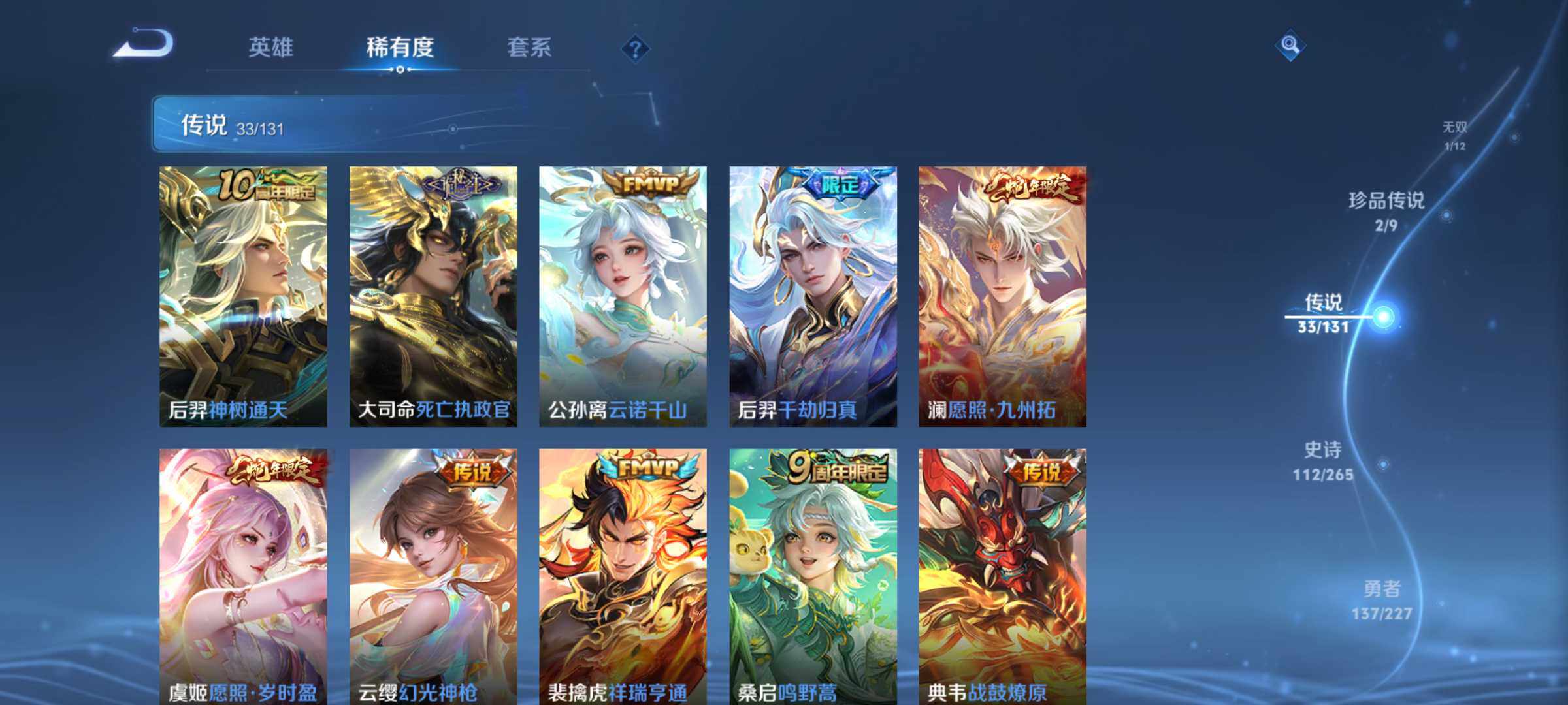 【传说皮肤】:后羿神树通天,大司命死亡执政官,公孙离云诺千山,后羿千劫归真,澜愿照九州拓,虞姬愿照岁时盈,云缨幻光神枪,裴擒虎祥瑞亨通,桑启鸣野蒿,典韦战鼓燎原,孙尚香乘龙问璇玑,赵云乘龙铭钟鼎,澜逐花归海,露娜霜月吟,狄仁杰夜礼服假面,鲁班七号时之奇旅,马可波罗妄想实况,诸葛亮鹤羽星尊,伽罗炽翼辉光,吕布怒海麟威,李白诗剑行,裴擒虎寅虎赤拳,鲁班七号寅虎瑞焰,李元芳飞鸢探春,公孙离祈雪灵祝,镜炽阳神光,虞姬启明星使,刘备时之恋人,梦奇胖达荣荣,后羿黄金射手座,貂蝉仲夏夜之梦,孙尚香末日机甲,宫本武藏地狱之眼