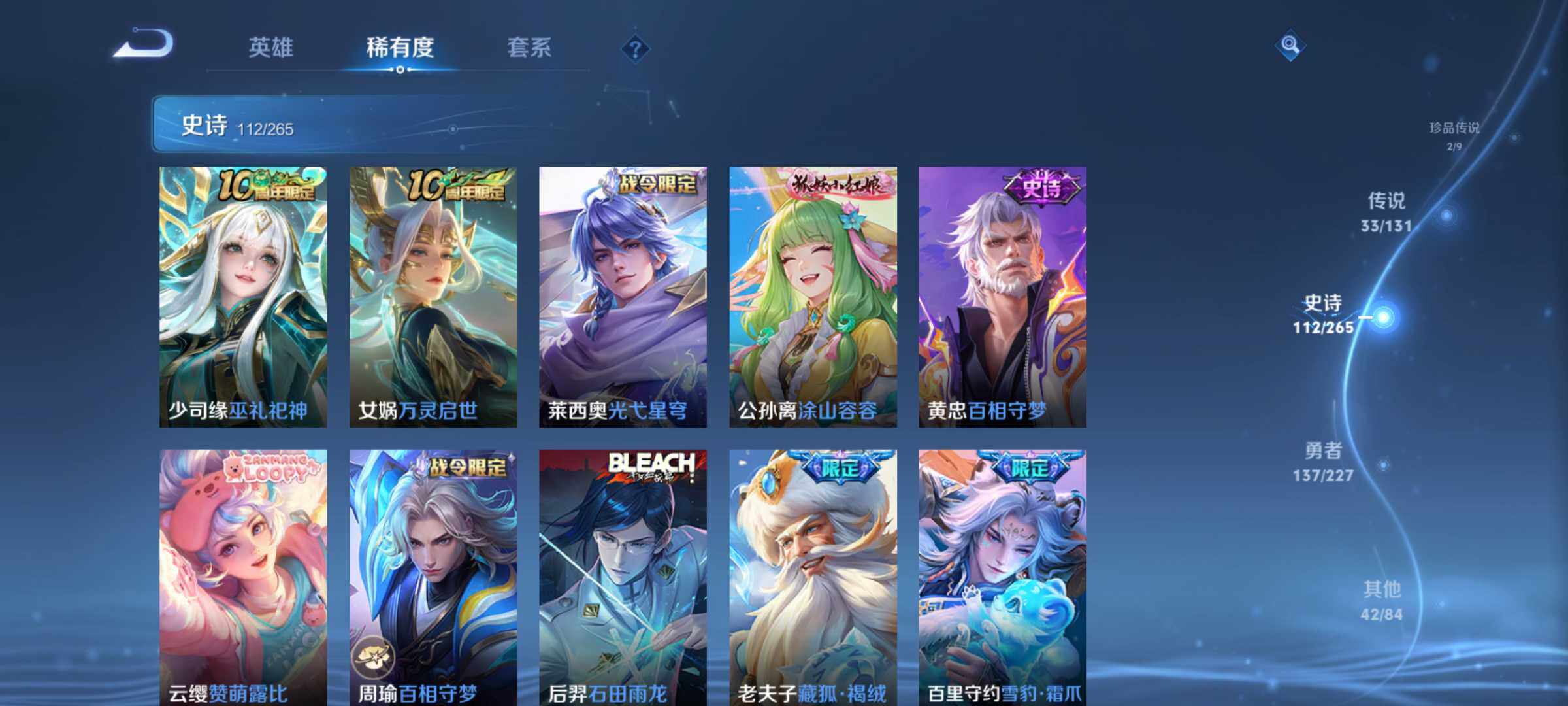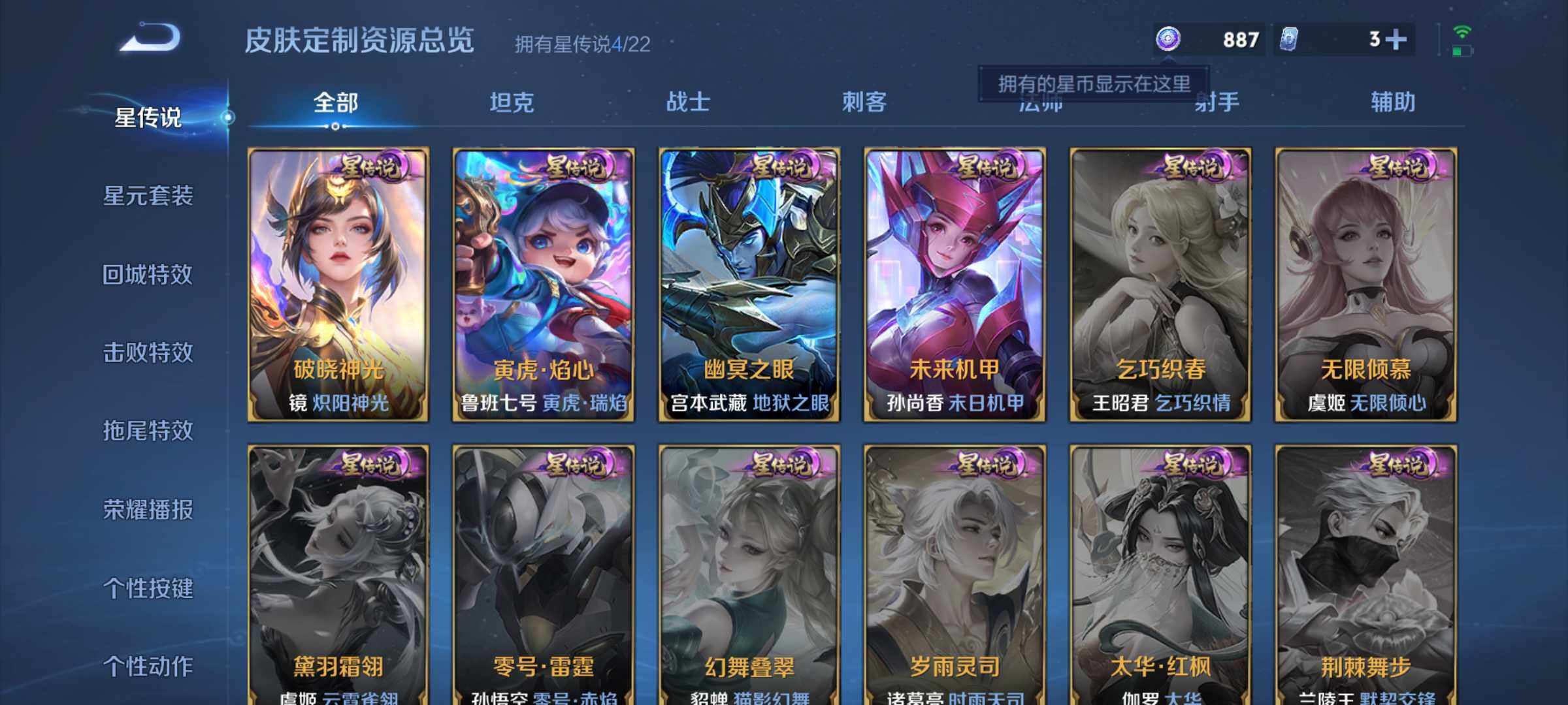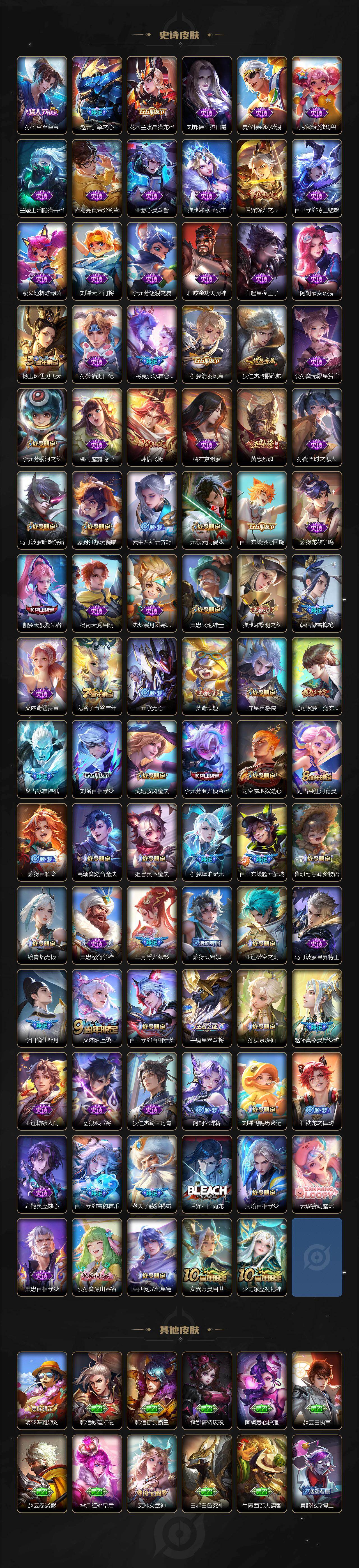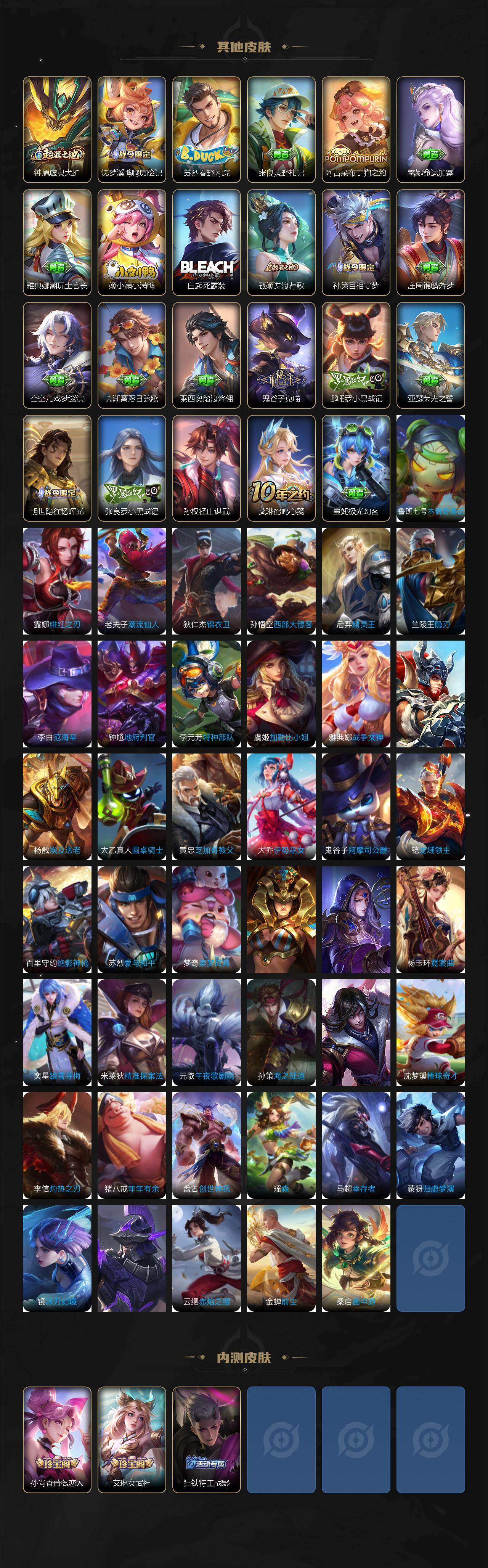 【限定皮肤】:蒙犽顽岩魄,虞姬夏日便利店,姜子牙天穹之誓,李白谪仙醉月,狄仁杰阴阳师,赵云皇家上将,赵云引擎之心,孙尚香蔷薇恋人,鲁班七号寅虎瑞焰,鲁班七号时之奇旅,元歌云间偶戏,元歌无心,马可波罗暗影游猎,马可波罗山海玄木吟,马可波罗妄想实况,狄仁杰魔术师,项羽海滩派对,韩信飞衡,韩信傲雪梅枪,孙悟空至尊宝,后羿辉光之辰,刘备百相守梦,李元芳银河之约,李元芳匿光侦查者,李元芳云中旅人,虞姬启明星使,杨玉环遇见飞天,干将莫邪冰霜恋舞曲,雅典娜黎明之约,鬼谷子五谷丰年,诸葛亮鹤羽星尊,黄忠烈魂,黄忠火炮绅士,梦奇顽趣,公孙离祈雪灵祝,沈梦溪大漠名商,裴擒虎寅虎赤拳,裴擒虎擒涛扼浪,云中君纤云弄巧,伽罗天狼溯光者,伽罗炽翼辉光,嫦娥暖冬兔眠,西施玲珑珍味,蒙犽狂想玩偶喵,鲁班大师探海日志,盘古冰霜神祇,桑启海盐诗旅,暃星界游侠,戈娅驭风魔法,艾琳女武神,艾琳流音漫舞,司空震地狱燃心,阿古朵江河有灵,张良古海寻踪,狄仁杰夜礼服假面,蒙犽百解令,高渐离燃音魔法,妲己灵卜魔法,鬼谷子天穹祈灯,伽罗琥珀纪元,孙尚香乘龙问璇玑,赵云乘龙铭钟鼎,百里玄策超元猎域,沈梦溪龙舞盛年,鲁班七号蔬乡物语,李元芳蔬乡物语,刘邦剑破天穹,程咬金群星魔术团,镜青焰无极,项羽苍威无极,刘备异域游侠,芈月浮光幕影,周瑜熔金海岸