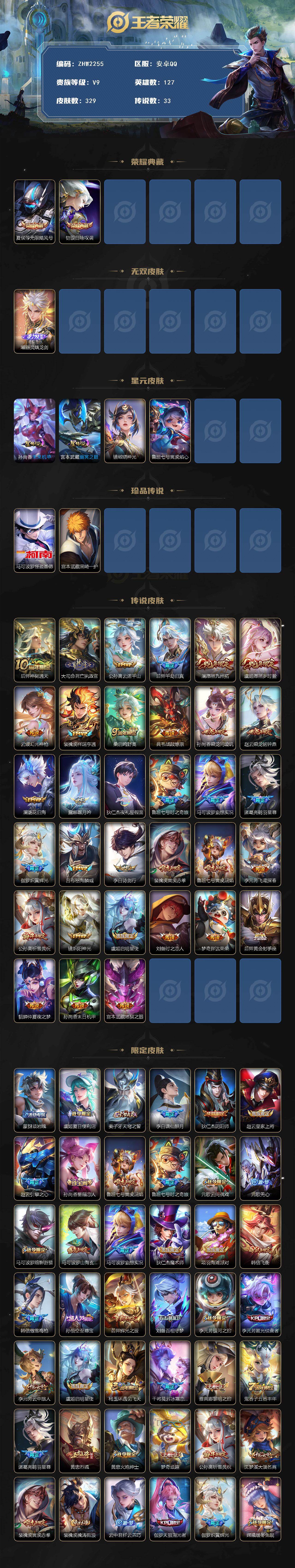 [15083043]【店主推荐捡漏号!可直接换绑】发育路38段,安卓Q-V9-最强王者段位-127英雄-329皮肤-2典藏皮肤-1无双-2珍品传说-4星传说-33传说-112史诗 【英雄全皮】:孙权全皮,苍全皮,黄忠全皮,蒙犽全皮,戈娅全皮,空空儿全皮,影全皮 【荣耀典藏】:夏侯惇无限飓风号,铠银白咏叹调 【无双皮肤】:曜器灵螭龙剑 【珍品传说】:马可波罗怪盗基德,宫本武藏黑崎一护 【传说皮肤】:后羿神树通天,大司命死亡执政官,公孙离云诺千山,后羿千劫归真,澜愿照九州拓,虞姬愿照岁时盈,云缨幻光神枪,裴擒虎祥瑞亨通,桑启鸣野蒿,典韦战鼓燎原,孙尚香乘龙问璇玑,赵云乘龙铭钟鼎,澜逐花归海,露娜霜月吟,狄仁杰夜礼服假面,鲁班七号时之奇旅,马可波罗妄想实况,诸葛亮鹤羽星尊,伽罗炽翼辉光,吕布怒海麟威,李白诗剑行,裴擒虎寅虎赤拳,鲁班七号寅虎瑞焰,李元芳飞鸢探春,公孙离祈雪灵祝,镜炽阳神光,虞姬启明星使,刘备时之恋人,梦奇胖达荣荣,后羿黄金射手座,貂蝉仲夏夜之梦,孙尚香末日机甲,宫本武藏地狱之眼 【限定皮肤】:蒙犽顽岩魄,虞姬夏日便利店,姜子牙天穹之誓,李白谪仙醉月,狄仁杰阴阳师,赵云皇家上将,赵云引擎之心,孙尚香蔷薇恋人,鲁班七号寅虎瑞焰,鲁班七号时之奇旅,元歌云间偶戏,元歌无心,马可波罗暗影游猎,马可波罗山海玄木吟,马可波罗妄想实况,狄仁杰魔术师,项羽海滩派对,韩信飞衡,韩信傲雪梅枪,孙悟空至尊宝,后羿辉光之辰,刘备百相守梦,李元芳银河之约,李元芳匿光侦查者,李元芳云中旅人,虞姬启明星使,杨玉环遇见飞天,干将莫邪冰霜恋舞曲,雅典娜黎明之约,鬼谷子五谷丰年,诸葛亮鹤羽星尊,黄忠烈魂,黄忠火炮绅士,梦奇顽趣,公孙离祈雪灵祝,沈梦溪大漠名商,裴擒虎寅虎赤拳,裴擒虎擒涛扼浪,云中君纤云弄巧,伽罗天狼溯光者,伽罗炽翼辉光,嫦娥暖冬兔眠,西施玲珑珍味,蒙犽狂想玩偶喵,鲁班大师探海日志,盘古冰霜神祇,桑启海盐诗旅,暃星界游侠,戈娅驭风魔法,艾琳女武神,艾琳流音漫舞,司空震地狱燃心,阿古朵江河有灵,张良古海寻踪,狄仁杰夜礼服假面,蒙犽百解令,高渐离燃音魔法,妲己灵卜魔法,鬼谷子天穹祈灯,伽罗琥珀纪元,孙尚香乘龙问璇玑,赵云乘龙铭钟鼎,百里玄策超元猎域,沈梦溪龙舞盛年,鲁班七号蔬乡物语,李元芳蔬乡物语,刘邦剑破天穹,程咬金群星魔术团,镜青焰无极,项羽苍威无极,刘备异域游侠,芈月浮光幕影,周瑜熔金海岸 【年