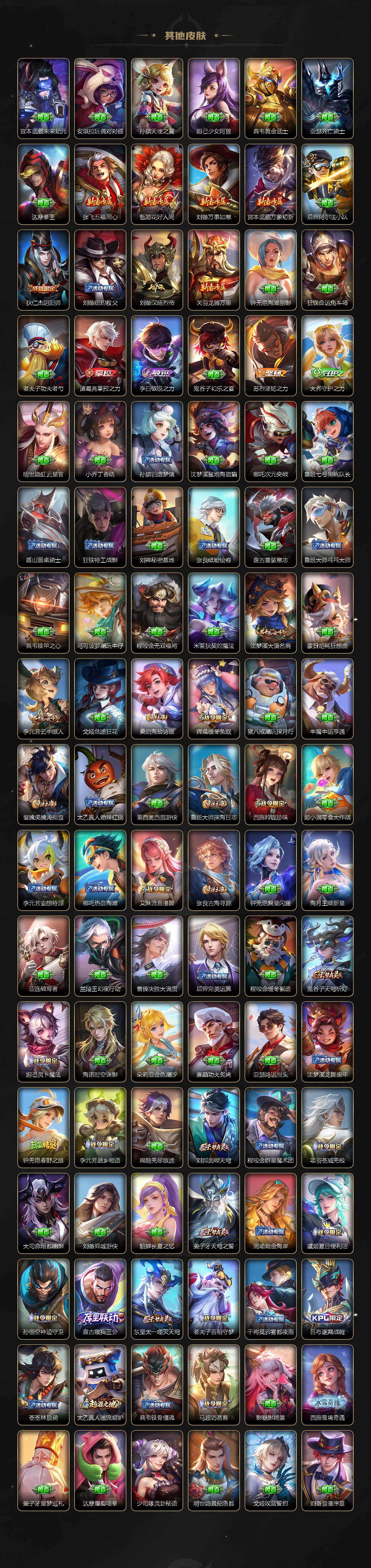 娜可露露晚萤,伽罗箭羽风息,李元芳逐浪之夏,公孙离无限星赏官,孙策猫狗日记,阿轲节奏热浪,露娜紫霞仙子,诸葛亮黄金分割率,王昭君偶像歌手,项羽苍穹之光,孙尚香时之恋人,阿轲暗夜猫娘,雅典娜冰冠公主,吕布末日机甲,鲁班七号电玩小子,蒙犽龙鼓争鸣,橘右京修罗,墨子龙骑士,嬴政摇滚巨星,刘禅绅士熊喵,刘禅天才门将,白起星夜王子,程咬金功夫厨神,刘邦德古拉伯爵,兰陵王暗隐猎兽者,曹操幽灵船长,宫本武藏鬼剑武藏,亚瑟心灵战警,杨戬天秀·启明,蔡文姬舞动绿茵,廉颇地狱岩魂,小乔缤纷独角兽,夏侯惇乘风破浪,花木兰水晶猎龙者,百里玄策热力回旋,墨子金属风暴,吕布圣诞狂欢,貂蝉圣诞恋歌,百里守约特工魅影,雅典娜黎明之约,李白千年之狐,艾琳奇遇舞章,刘备百相守梦,李元芳匿光侦查者,蒙犽百解令,高渐离燃音魔法,伽罗琥珀纪元,李白谪仙醉月,赵怀真器灵·浮梦炉,亚连糖绘人间,苍狼魂孤将,狄仁杰绮世丹青