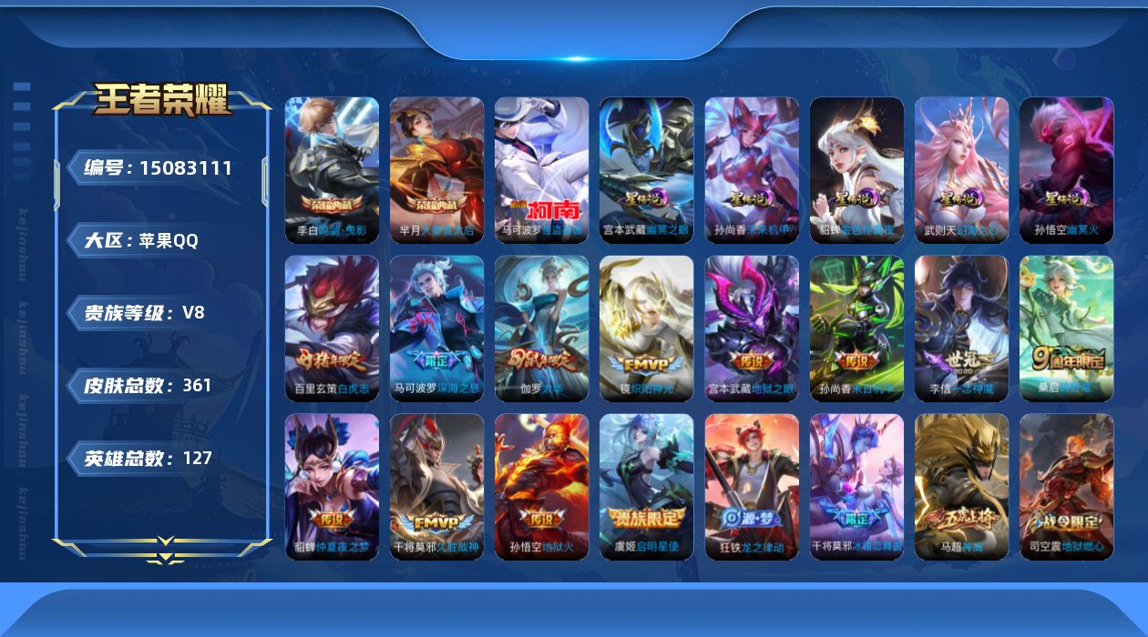 [15083111]可二次【店主推荐捡漏号!可直接换绑/40段发育路/37段对抗路/1省标/2市标/】:苹果Q-V8-最强王者段位-127英雄-361皮肤-2典藏皮肤-1典藏英雄-1珍品传说-5星元-12传说-107史诗 【英雄全皮】:孙权全皮,钟馗全皮,蒙恬全皮,影全皮 【荣耀典藏】:武则天英雄,芈月大秦宣太后,李白鸣剑曳影 【珍品传说】:马可波罗怪盗基德 【传说皮肤】:桑启鸣野蒿,马可波罗深海之息,镜炽阳神光,虞姬启明星使,李信一念神魔,伽罗太华,干将莫邪久胜战神,百里玄策白虎志,貂蝉仲夏夜之梦,孙尚香末日机甲,宫本武藏地狱之眼,孙悟空地狱火 【限定皮肤】:大乔绒语心约,姜子牙天穹之誓,狄仁杰阴阳师,小乔纯白花嫁,赵云皇家上将,赵云百木心枪,墨子神迹守卫,嬴政优雅恋人,鲁班七号狮舞东方,庄周云端筑梦师,庄周高山流水,高渐离死亡摇滚,高渐离玩趣恶龙,钟无艳超时空战士,孙膑天狼运算者,白起夜都怪侠,芈月幻夜卜梦,吕布御风骁将,周瑜赤莲之焰,元歌云间偶戏,元歌无心,夏侯惇朔风刀,甄姬游园惊梦,甄姬落雪兰心,马可波罗暗影游猎,马可波罗深海之息,马可波罗山海玄木吟,狄仁杰魔术师,狄仁杰万华元夜,达摩星际陆战队,达摩沙漠行僧,项羽海滩派对,老夫子醍醐杖,老夫子航海奇遇记,关羽冰锋战神,程咬金演武夺筹,韩信逐梦之影,王昭君午后时光,兰陵王驯魔猎人,兰陵王金庭之子,亚瑟潮玩骑士王,孙悟空大圣娶亲,牛魔御旌,后羿如梦令,李元芳银河之约,李元芳云中旅人,虞姬启明星使,钟馗神迹守卫,钟馗驱傩正仪,杨玉环遇见飞天,干将莫邪冰霜恋舞曲,雅典娜单词大作战,雅典娜黎明之约,蔡文姬繁星吟游,太乙真人华丽摇滚,鬼谷子原初探秘者,鬼谷子五谷丰年,黄忠火炮绅士,苏烈千军破阵,百里玄策白虎志,百里玄策原初追逐者,弈星混沌棋,梦奇顽趣,公孙离蜜橘之夏,沈梦溪星空之诺,沈梦溪大漠名商,明世隐疑决卦,明世隐吟游魔法,裴擒虎李小龙,裴擒虎擒涛扼浪,狂铁电玩高手,米莱狄胡桃异想国,云中君纤云弄巧,伽罗太华,盾山御銮,猪八戒西部大镖客,上官婉儿梁祝,嫦娥拒霜思,嫦娥暖冬兔眠,西施玲珑珍味,蒙犽狂想玩偶喵,鲁班大师探海日志,桑启海盐诗旅,暃星界游侠,戈娅驭风魔法,艾琳女武神,艾琳流音漫舞,司空震地狱燃心,阿古朵江河有灵,张良古海寻踪,蒙犽百解令,蒙恬荣光圣徽,鬼谷子天穹祈灯,沈梦溪龙舞盛年,刘邦剑破天穹,刘备异域游侠,芈月浮光幕影