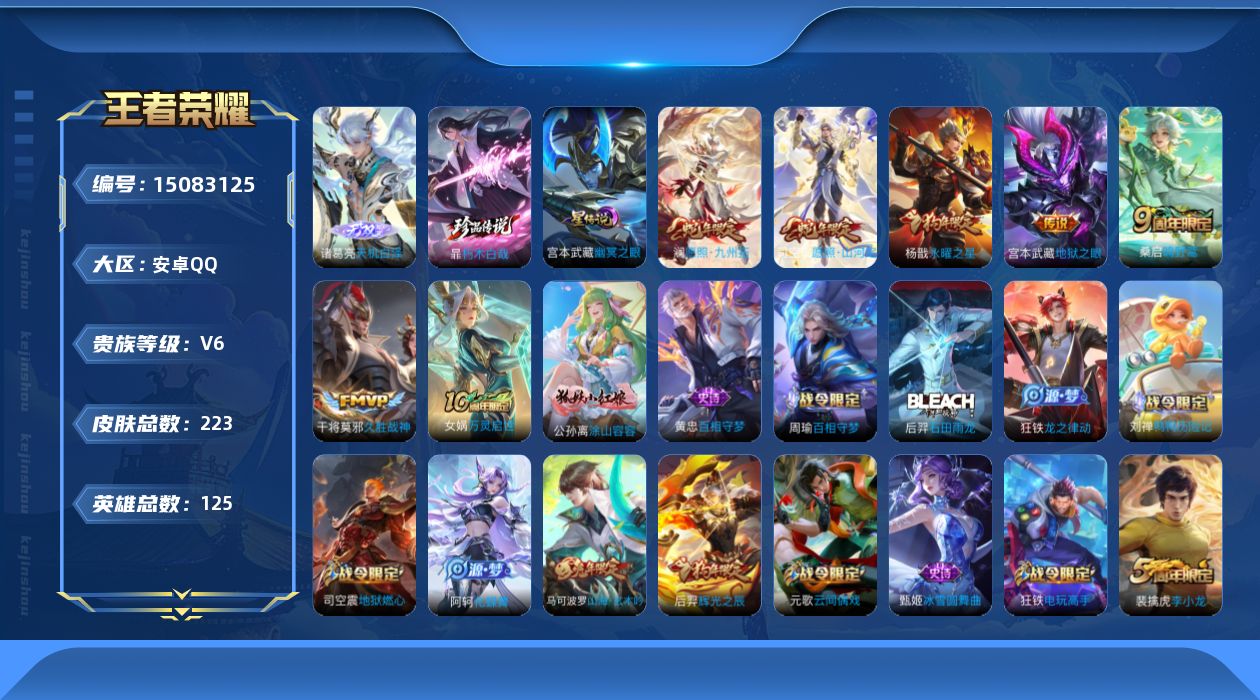 [15083125]可二次【店主推荐捡漏号!可直接换绑/1市标】:安卓Q-V7-最强王者段位-125英雄-223皮肤-1无双-1珍品传说-1星元-7传说-57史诗 【英雄全皮】:孙权全皮,司空震全皮,戈娅全皮 【无双皮肤】:诸葛亮天机白泽 【珍品传说】:暃朽木白哉 【传说皮肤】:后羿神树通天,司空震愿照山河定,澜愿照九州拓,桑启鸣野蒿,干将莫邪久胜战神,杨戬永曜之星,宫本武藏地狱之眼 【限定皮肤】:姜子牙天穹之誓,杨戬破阵退雄兵,狄仁杰阴阳师,赵云皇家上将,孙尚香蔷薇恋人,庄周高山流水,高渐离玩趣恶龙,元歌云间偶戏,元歌无心,夏侯惇朔风刀,马可波罗山海玄木吟,狄仁杰魔术师,狄仁杰万华元夜,达摩沙漠行僧,项羽海滩派对,老夫子醍醐杖,程咬金演武夺筹,王昭君午后时光,兰陵王金庭之子,牛魔御旌,后羿辉光之辰,李元芳云中旅人,钟馗驱傩正仪,杨戬永曜之星,干将莫邪胡桃夹子,鬼谷子原初探秘者,鬼谷子五谷丰年,苏烈千军破阵,弈星混沌棋,梦奇顽趣,沈梦溪大漠名商,明世隐疑决卦,裴擒虎李小龙,裴擒虎擒涛扼浪,狂铁电玩高手,米莱狄御霄,上官婉儿梁祝,嫦娥拒霜思,西施玲珑珍味,蒙犽狂想玩偶喵,鲁班大师探海日志,桑启海盐诗旅,戈娅驭风魔法,艾琳流音漫舞,司空震地狱燃心,阿古朵江河有灵,张良古海寻踪,蒙恬荣光圣徽,鬼谷子天穹祈灯,沈梦溪龙舞盛年,刘邦剑破天穹,程咬金群星魔术团,镜青焰无极,周瑜熔金海岸 【年限皮肤】:杨戬永曜之星,后羿辉光之辰,马可波罗山海玄木吟 【赛季限定】:夏侯惇朔风刀,狄仁杰万华元夜,达摩沙漠行僧,老夫子醍醐杖,程咬金演武夺筹,兰陵王金庭之子,张良古海寻踪,牛魔御旌,李元芳云中旅人,钟馗驱傩正仪,鬼谷子原初探秘者,苏烈千军破阵,弈星混沌棋,梦奇顽趣,沈梦溪大漠名商,明世隐疑决卦,裴擒虎擒涛扼浪,米莱狄御霄,鲁班大师探海日志,桑启海盐诗旅,鬼谷子天穹祈灯,蒙恬荣光圣徽,刘邦剑破天穹,姜子牙天穹之誓 【战令限定】:元歌云间偶戏,王昭君午后时光,艾琳流音漫舞,狂铁电玩高手,西施玲珑珍味,蒙犽狂想玩偶喵,司空震地狱燃心,戈娅驭风魔法,镜青焰无极 【史诗皮肤】:赵云皇家上将,赵云未来纪元,貂蝉圣诞恋歌,甄姬冰雪圆舞曲,狄仁杰魔术师,廉颇地狱岩魂,宫本武藏鬼剑武藏,孙尚香蔷薇恋人,孙尚香水果甜心,妲己女仆咖啡,墨子金属风暴,吕布圣诞狂欢,曹操幽灵船长,李白千年之狐,吕布末日机甲,花木兰水晶猎龙者,刘邦