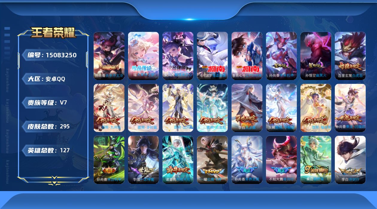 [15083250]【店主推荐捡漏号!可直接换绑/30段发育/3市标】:安卓Q-V8-最强王者段位-127英雄-295皮肤-1典藏皮肤-2星元-4珍品传说-22传说-78史诗