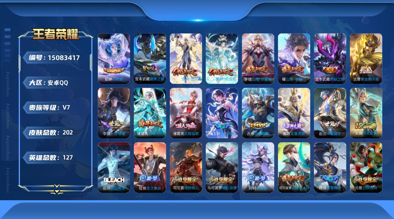 [15083417]可二次,【店主推荐捡漏号!可直接换绑】,安卓Q-V7-最强王者段位-127英雄-202皮肤-1典藏皮肤-14传说-47史诗