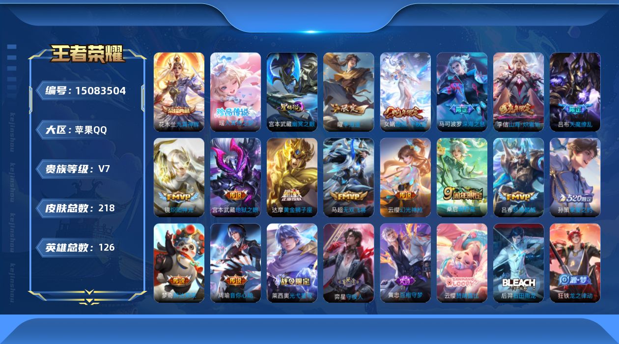 [15083504]【店主推荐捡漏号!可直接换绑】对抗路30段,苹果Q-V7-最强王者段位-126英雄-218皮肤-1典藏皮肤-1珍品传说-1星传说-15传说-63史诗