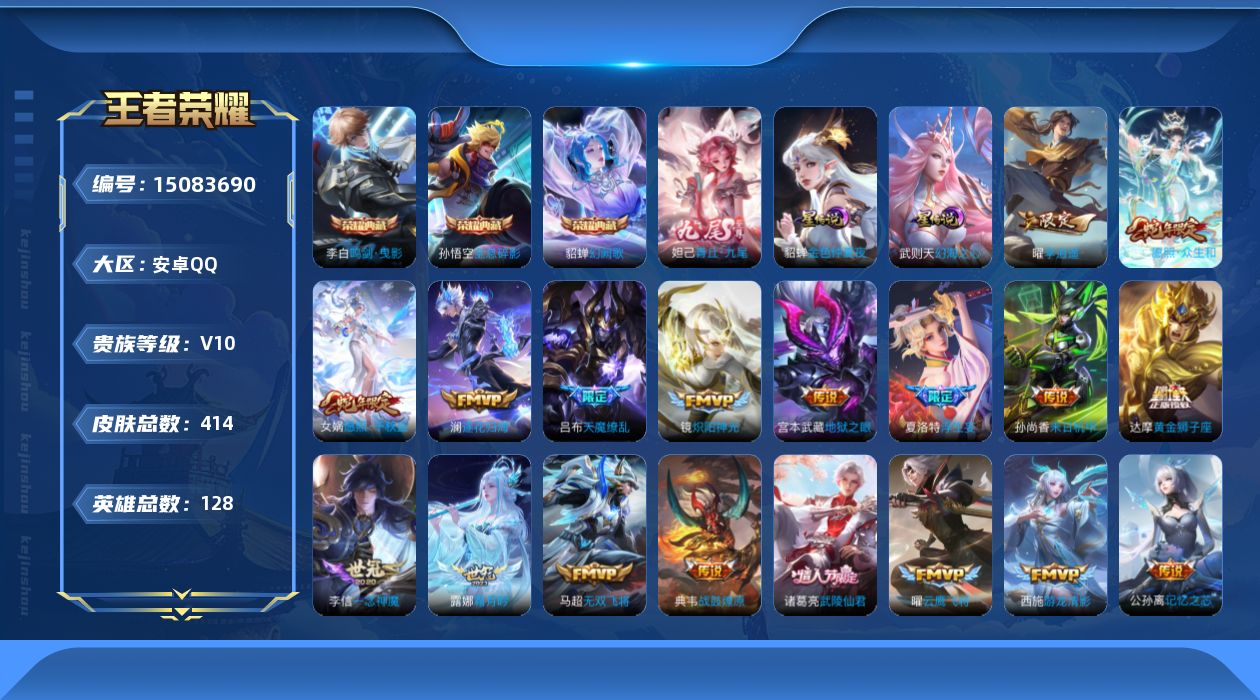 [15083690]可二次,【店主推荐捡漏号!可直接换绑】安卓Q-V10-最强王者段位-128英雄-414皮肤-3典藏皮肤-1典藏英雄-1无双-54传说-137史诗