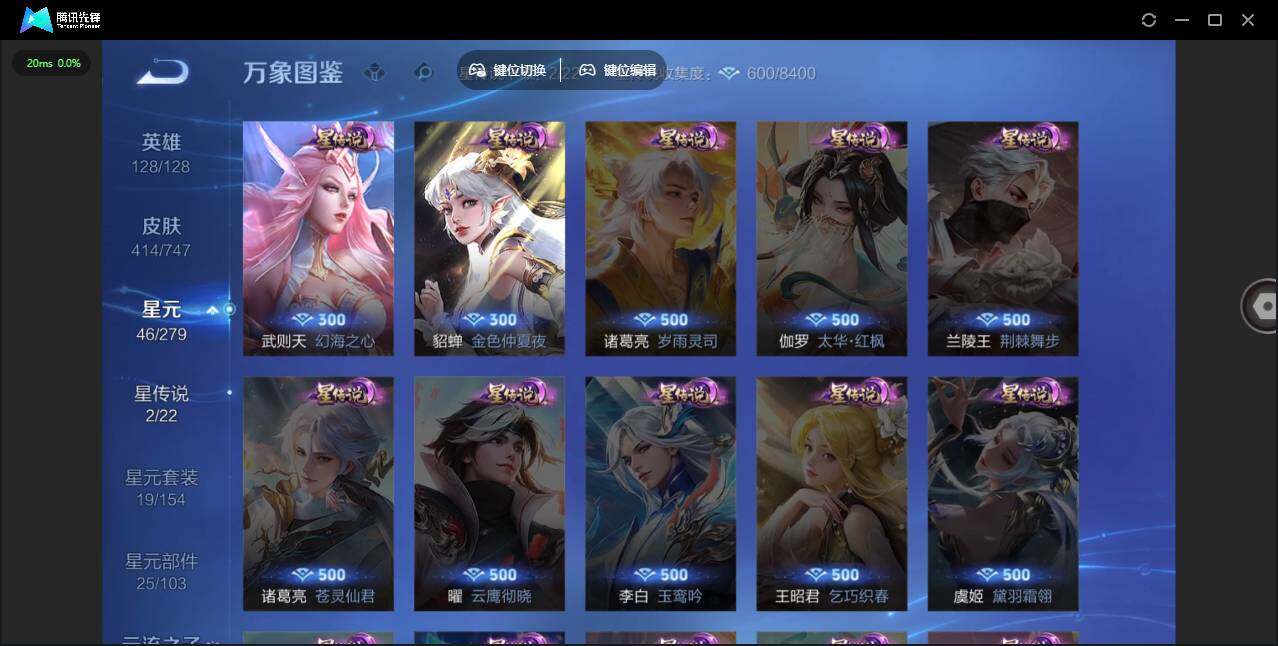 【传说皮肤】:后羿神树通天,女娲愿照千秋盛,妲己愿照众生和,嬴政玄雷天君,桑启鸣野蒿,典韦战鼓燎原,澜逐花归海,艾琳觅芳踪,露娜霜月吟,孙膑小动物乐团,宫本武藏惊梅引,东皇太一灼幽烈阳,澜电玩雷克斯,公孙离记忆之芯,夏洛特浮生妄,伽罗炽翼辉光,吕布怒海麟威,李白诗剑行,百里守约碎云,孙尚香音你闪耀,马超无双飞将,孙策挚爱之约,蔡文姬花朝如约,孙策末日机甲,赵云淬星耀世,王昭君乞巧织情,西施游龙清影,曜李逍遥 ,周瑜音你心动,小乔音你心动,李元芳飞鸢探春,铠绛天战甲,镜炽阳神光,虞姬启明星使,孙悟空零号赤焰,曜云鹰飞将,李信一念神魔,刘备时之恋人,貂蝉猫影幻舞,张良黄金白羊座,干将莫邪久胜战神,虞姬云霓雀翎,达摩黄金狮子座,花木兰冠军飞将,梦奇胖达荣荣,后羿黄金射手座,诸葛亮武陵仙君,貂蝉仲夏夜之梦,孙尚香末日机甲,宫本武藏地狱之眼,孙悟空地狱火,吕布天魔缭乱,武则天海洋之心,狄仁杰超时空战士