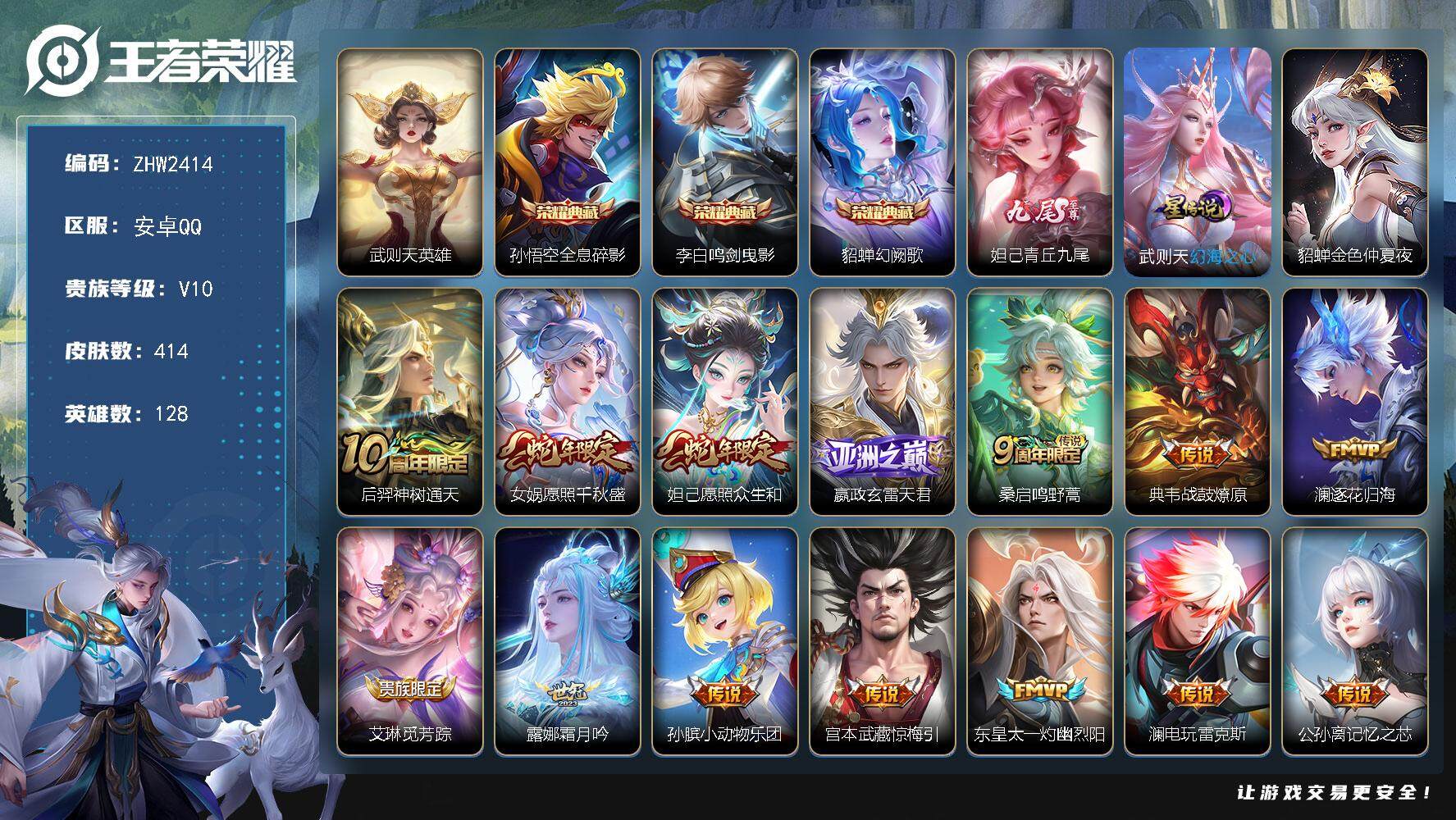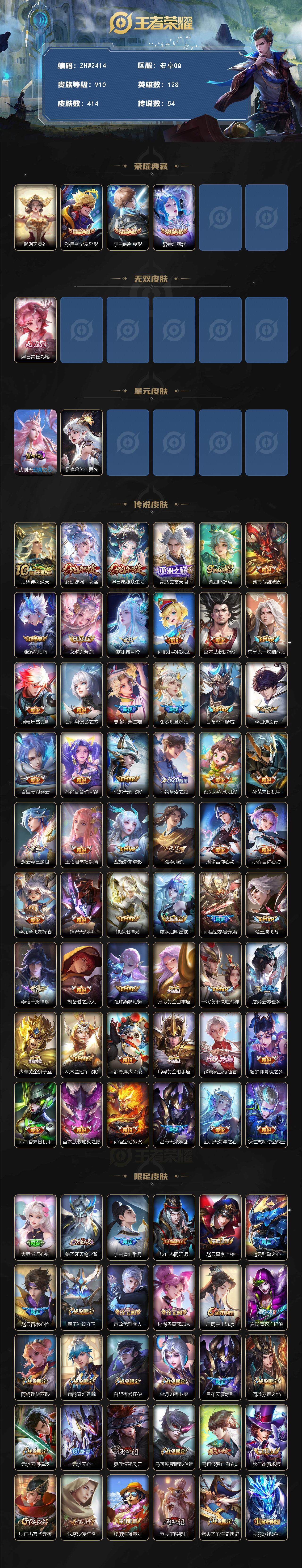 [15083690]可二次,【店主推荐捡漏号!可直接换绑】安卓Q-V10-最强王者段位-128英雄-414皮肤-3典藏皮肤-1典藏英雄-1无双-54传说-137史诗 【英雄全皮】:刘邦全皮,鬼谷子全皮,夏洛特全皮,影全皮 【荣耀典藏】:武则天英雄,孙悟空全息碎影,李白鸣剑曳影,貂蝉幻阙歌 【无双皮肤】:妲己青丘九尾 【传说皮肤】:后羿神树通天,女娲愿照千秋盛,妲己愿照众生和,嬴政玄雷天君,桑启鸣野蒿,典韦战鼓燎原,澜逐花归海,艾琳觅芳踪,露娜霜月吟,孙膑小动物乐团,宫本武藏惊梅引,东皇太一灼幽烈阳,澜电玩雷克斯,公孙离记忆之芯,夏洛特浮生妄,伽罗炽翼辉光,吕布怒海麟威,李白诗剑行,百里守约碎云,孙尚香音你闪耀,马超无双飞将,孙策挚爱之约,蔡文姬花朝如约,孙策末日机甲,赵云淬星耀世,王昭君乞巧织情,西施游龙清影,曜李逍遥 ,周瑜音你心动,小乔音你心动,李元芳飞鸢探春,铠绛天战甲,镜炽阳神光,虞姬启明星使,孙悟空零号赤焰,曜云鹰飞将,李信一念神魔,刘备时之恋人,貂蝉猫影幻舞,张良黄金白羊座,干将莫邪久胜战神,虞姬云霓雀翎,达摩黄金狮子座,花木兰冠军飞将,梦奇胖达荣荣,后羿黄金射手座,诸葛亮武陵仙君,貂蝉仲夏夜之梦,孙尚香末日机甲,宫本武藏地狱之眼,孙悟空地狱火,吕布天魔缭乱,武则天海洋之心,狄仁杰超时空战士 【限定皮肤】:大乔绒语心约,姜子牙天穹之誓,李白谪仙醉月,狄仁杰阴阳师,赵云皇家上将,赵云引擎之心,赵云百木心枪,墨子神迹守卫,嬴政优雅恋人,孙尚香蔷薇恋人,庄周高山流水,高渐离死亡摇滚,阿轲迷踪丽影,扁鹊奇幻香踪,白起夜都怪侠,芈月幻夜卜梦,吕布天魔缭乱,周瑜赤莲之焰,元歌云间偶戏,元歌无心,夏侯惇朔风刀,马可波罗暗影游猎,马可波罗山海玄木吟,狄仁杰魔术师,狄仁杰万华元夜,达摩沙漠行僧,项羽海滩派对,老夫子醍醐杖,老夫子航海奇遇记,关羽冰锋战神,程咬金演武夺筹,刘邦夺宝奇兵,韩信逐梦之影,韩信飞衡,王昭君午后时光,兰陵王驯魔猎人,兰陵王金庭之子,亚瑟潮玩骑士王,孙悟空至尊宝,孙悟空大圣娶亲,孙悟空零号赤焰,牛魔御旌,后羿圣弓游侠,李元芳银河之约,李元芳云中旅人,虞姬启明星使,钟馗驱傩正仪,杨戬潮玩骑兵,干将莫邪冰霜恋舞曲,干将莫邪真爱魔法,雅典娜单词大作战,雅典娜黎明之约,鬼谷子原初探秘者,鬼谷子五谷丰年,诸葛亮武陵仙君,黄忠火炮绅士,苏烈千军破阵,百里玄策原初追逐者,百里守约朱雀