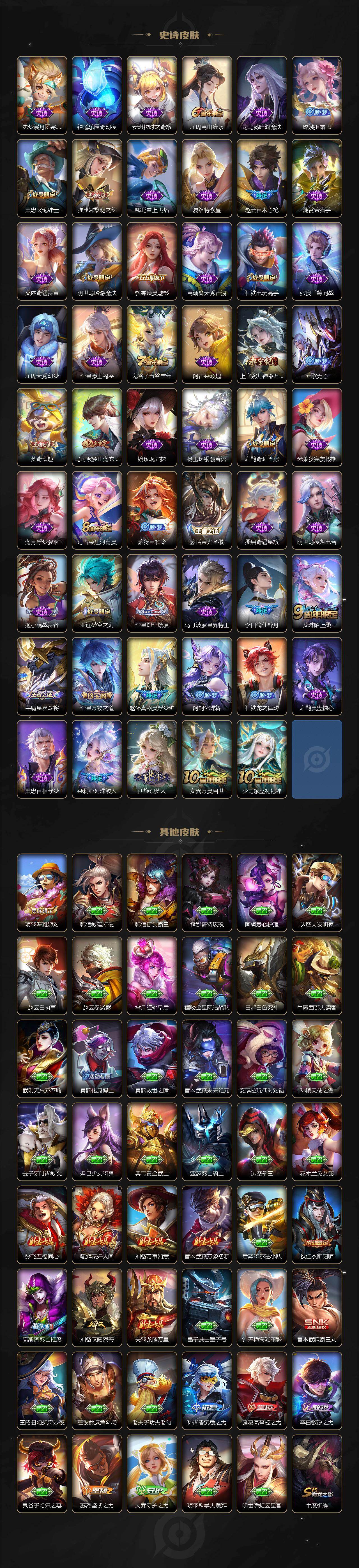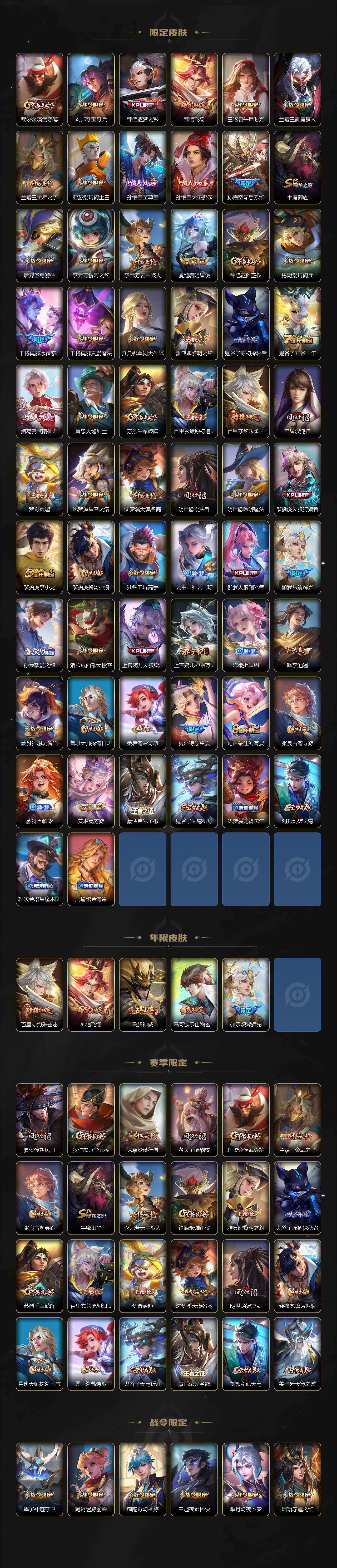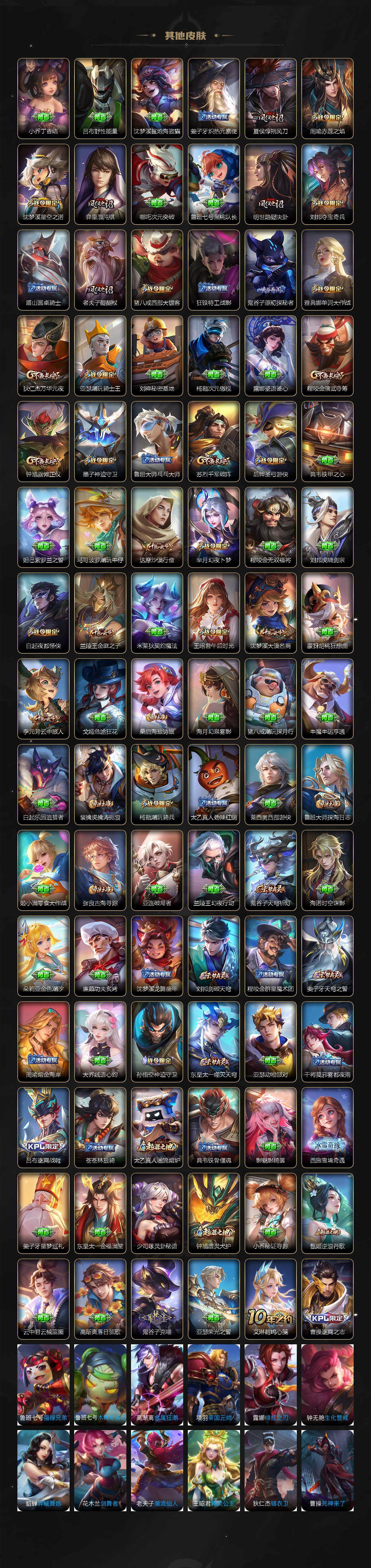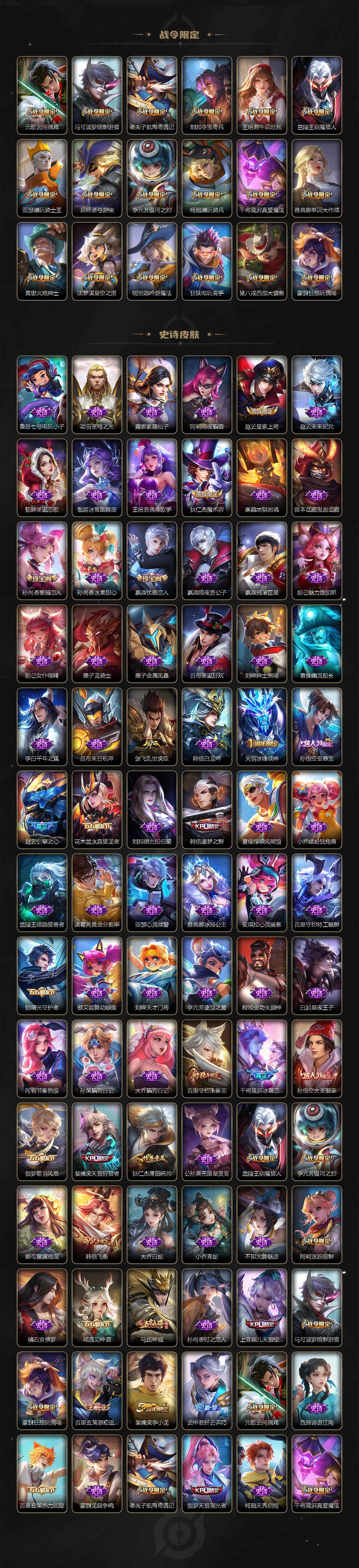 【限定皮肤】:大乔绒语心约,姜子牙天穹之誓,李白谪仙醉月,狄仁杰阴阳师,赵云皇家上将,赵云引擎之心,赵云百木心枪,墨子神迹守卫,嬴政优雅恋人,孙尚香蔷薇恋人,庄周高山流水,高渐离死亡摇滚,阿轲迷踪丽影,扁鹊奇幻香踪,白起夜都怪侠,芈月幻夜卜梦,吕布天魔缭乱,周瑜赤莲之焰,元歌云间偶戏,元歌无心,夏侯惇朔风刀,马可波罗暗影游猎,马可波罗山海玄木吟,狄仁杰魔术师,狄仁杰万华元夜,达摩沙漠行僧,项羽海滩派对,老夫子醍醐杖,老夫子航海奇遇记,关羽冰锋战神,程咬金演武夺筹,刘邦夺宝奇兵,韩信逐梦之影,韩信飞衡,王昭君午后时光,兰陵王驯魔猎人,兰陵王金庭之子,亚瑟潮玩骑士王,孙悟空至尊宝,孙悟空大圣娶亲,孙悟空零号赤焰,牛魔御旌,后羿圣弓游侠,李元芳银河之约,李元芳云中旅人,虞姬启明星使,钟馗驱傩正仪,杨戬潮玩骑兵,干将莫邪冰霜恋舞曲,干将莫邪真爱魔法,雅典娜单词大作战,雅典娜黎明之约,鬼谷子原初探秘者,鬼谷子五谷丰年,诸葛亮武陵仙君,黄忠火炮绅士,苏烈千军破阵,百里玄策原初追逐者,百里守约朱雀