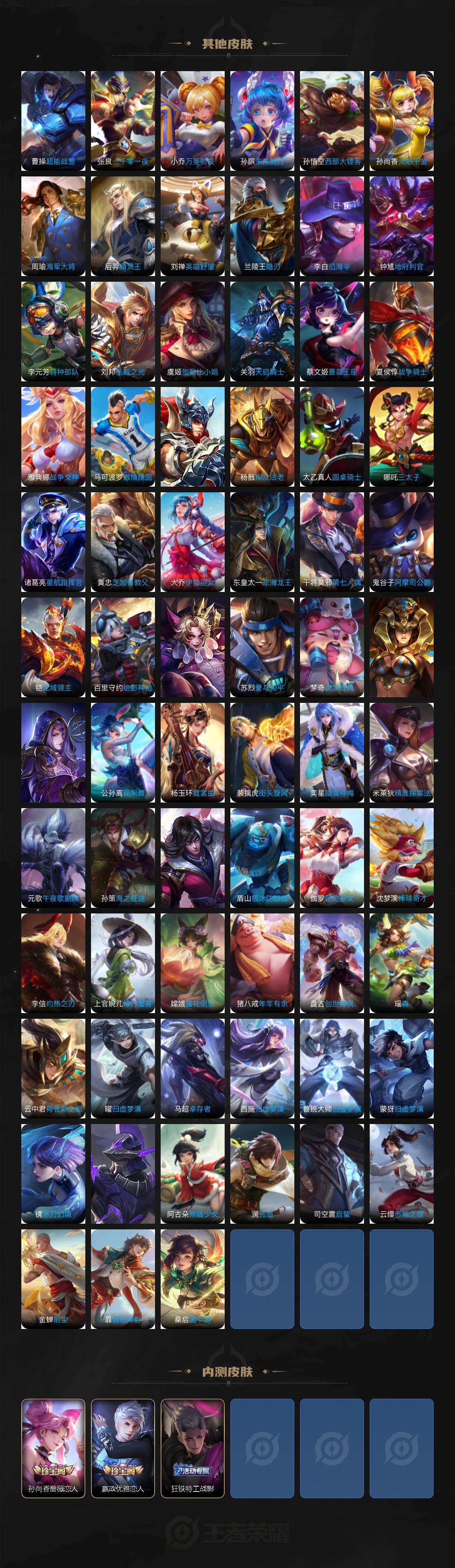 关羽冰锋战神,裴擒虎李小龙,马超神威,韩信飞衡,裴擒虎天狼狩猎者,上官婉儿天狼绘梦者,伽罗天狼溯光者,韩信逐梦之影,百里守约朱雀志,孙悟空大圣娶亲,孙悟空至尊宝,干将莫邪冰霜恋舞曲,赵云引擎之心,赵云百木心枪,上官婉儿神器·万象笔,李白诗剑行,马可波罗山海·玄木吟,桑启鸣野蒿,艾琳陌上桑,妲己愿照·众生和,女娲愿照·千秋盛