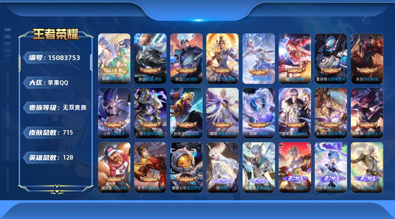 [15083753]荣耀水晶6!!!小国号!!背包点券7785【店主推荐捡漏号!可直接换绑】苹果Q-V11-最强王者段位-128英雄-715皮肤-18典藏皮肤-1典藏英雄-1珍品无双-7无双-7珍品传说-124传说-253史诗 【英雄全皮】:廉颇全皮,小乔全皮,赵云全皮,墨子全皮,妲己全皮,孙尚香全皮,庄周全皮,刘禅全皮,阿轲全皮,扁鹊全皮,白起全皮,芈月全皮,吕布全皮,周瑜全皮,元歌全皮,夏侯惇全皮,曹操全皮,典韦全皮,宫本武藏全皮,李白全皮,狄仁杰全皮,达摩全皮,项羽全皮,司马懿全皮,关羽全皮,安琪拉全皮,程咬金全皮,露娜全皮,姜子牙全皮,刘邦全皮,韩信全皮,孙权全皮,兰陵王全皮,花木兰全皮,张良全皮,朵莉亚全皮,娜可露露全皮,橘右京全皮,亚瑟全皮,孙悟空全皮,牛魔全皮,刘备全皮,张飞全皮,李元芳全皮,虞姬全皮,钟馗全皮,苍全皮,干将莫邪全皮,雅典娜全皮,太乙真人全皮,东皇太一全皮,鬼谷子全皮,诸葛亮全皮,大乔全皮,黄忠全皮,铠全皮,百里玄策全皮,百里守约全皮,梦奇全皮,沈梦溪全皮,明世隐全皮,狂铁全皮,米莱狄全皮,云中君全皮,李信全皮,伽罗全皮,盾山全皮,孙策全皮,猪八戒全皮,上官婉儿全皮,亚连全皮,嫦娥全皮,大司命全皮,马超全皮,海月全皮,西施全皮,鲁班大师全皮,蒙恬全皮,澜全皮,镜全皮,阿古朵全皮,桑启全皮,夏洛特全皮,司空震全皮,云缨全皮,金蝉全皮,暃全皮,莱西奥全皮,戈娅全皮,空空儿全皮,影全皮,海诺全皮,少司缘全皮 【荣耀典藏】:武则天英雄,孙悟空全息碎影,武则天倪克斯神谕,夏侯惇无限飓风号,小乔天鹅之梦,孙尚香杀手不太冷,鲁班七号星空梦想,芈月大秦宣太后,程咬金活力突击,李白鸣剑曳影,诸葛亮星域神启,花木兰九霄神辉,关羽赤影疾锋,铠银白咏叹调,貂蝉幻阙歌,韩信弑枪猎影,虞姬神鉴启示录,瑶拾光映像,伽罗最初的交响 【珍品无双】:貂蝉馥梦繁花 【无双皮肤】:妲己青丘九尾,李白碎月剑心,小乔时之魔女,韩信群星魔术团,不知火舞花合斗,诸葛亮天机白泽,铠神罪 【珍品传说】:孙策时之奇旅,嫦娥器灵落星盏,张飞兔狲蓬尾,瑶大耳狗之梦,安琪拉酷洛米之心,暃朽木白哉,宫本武藏黑崎一护 【传说皮肤】:杨戬纵目迁山,后羿神树通天,曹操万灵伏威,干将莫邪千山共赴,元歌诡秘之主,大司命死亡执政官,司马懿九山相柳,公孙离云诺千山,西施续相思,司空震愿照山河定,妲己愿照众生和,澜愿照九州拓,虞姬