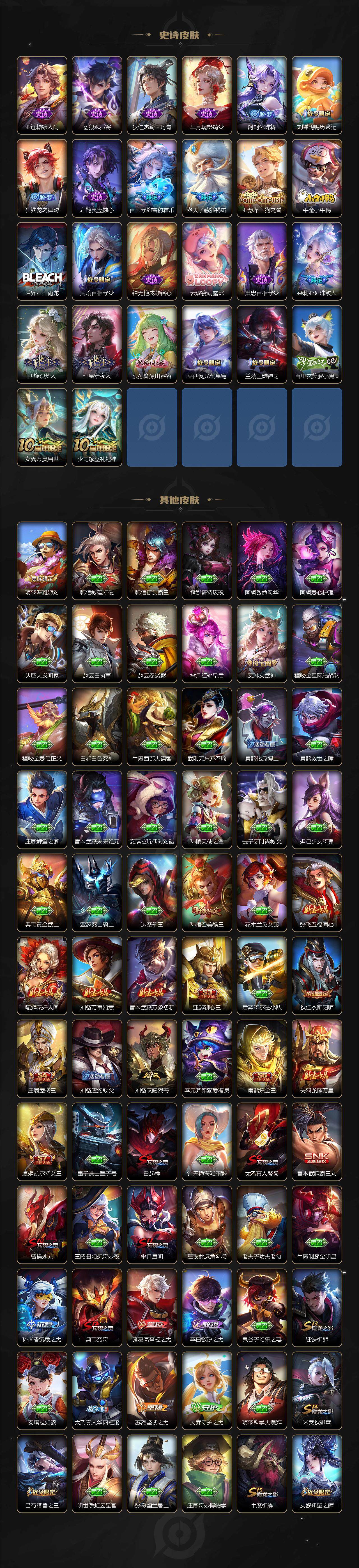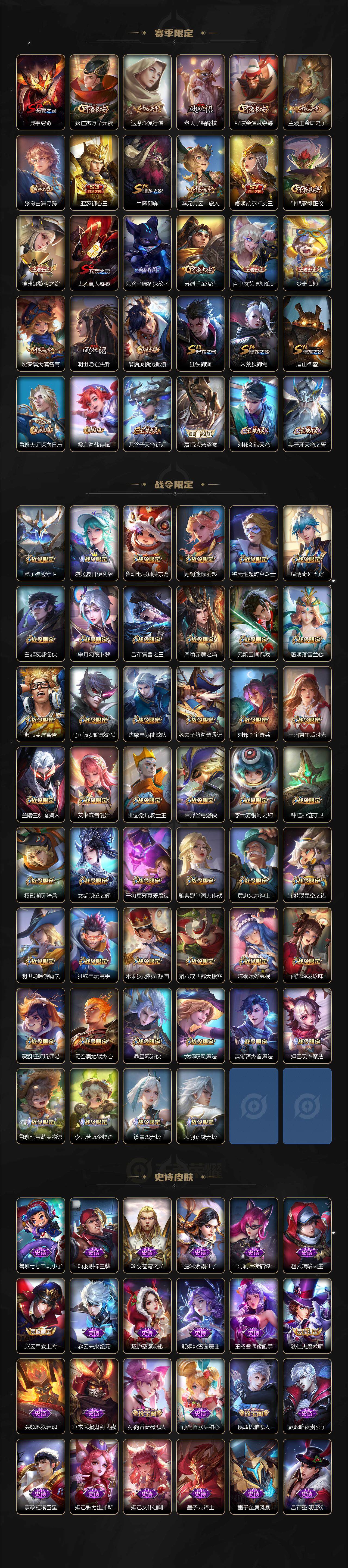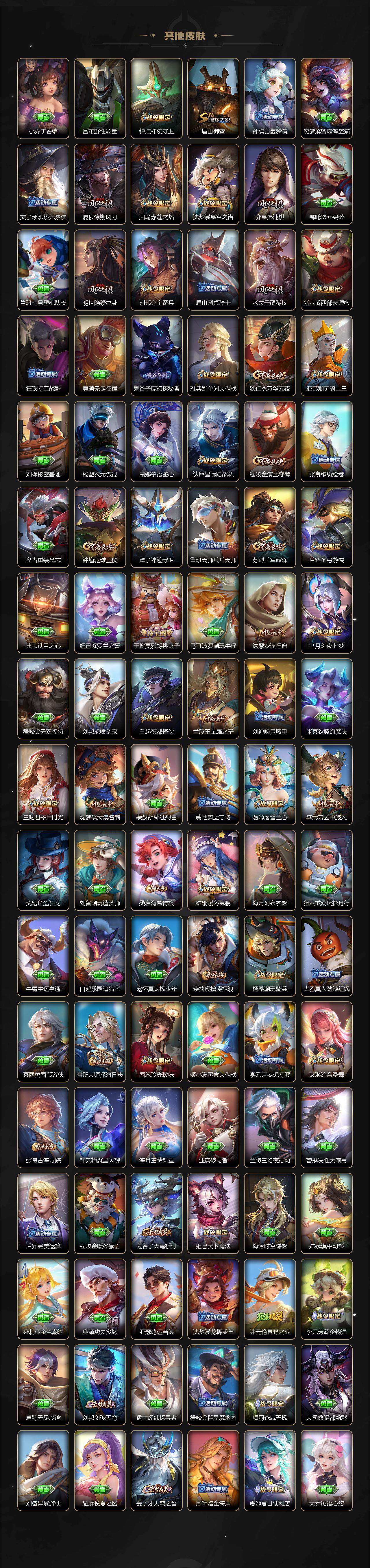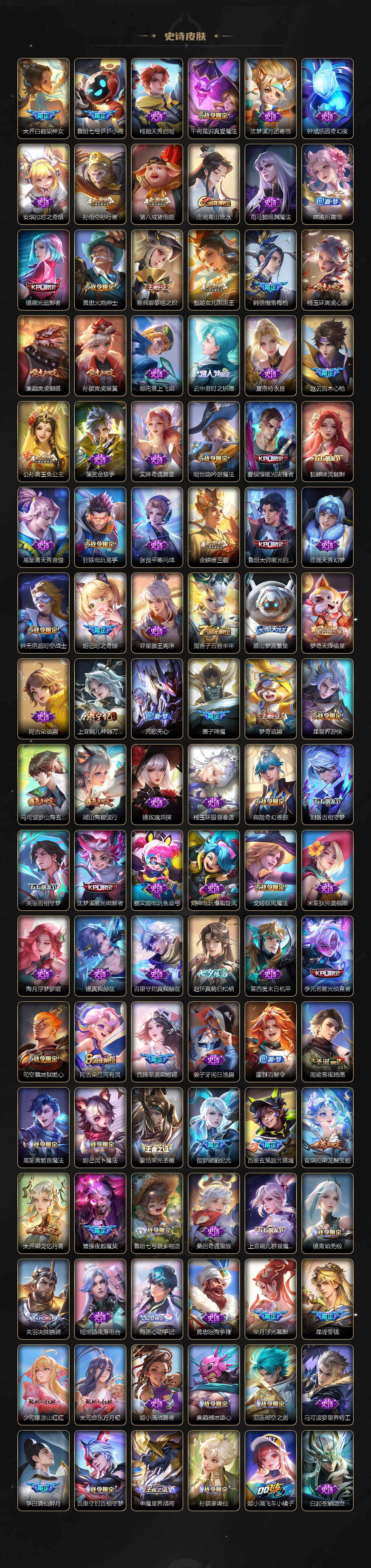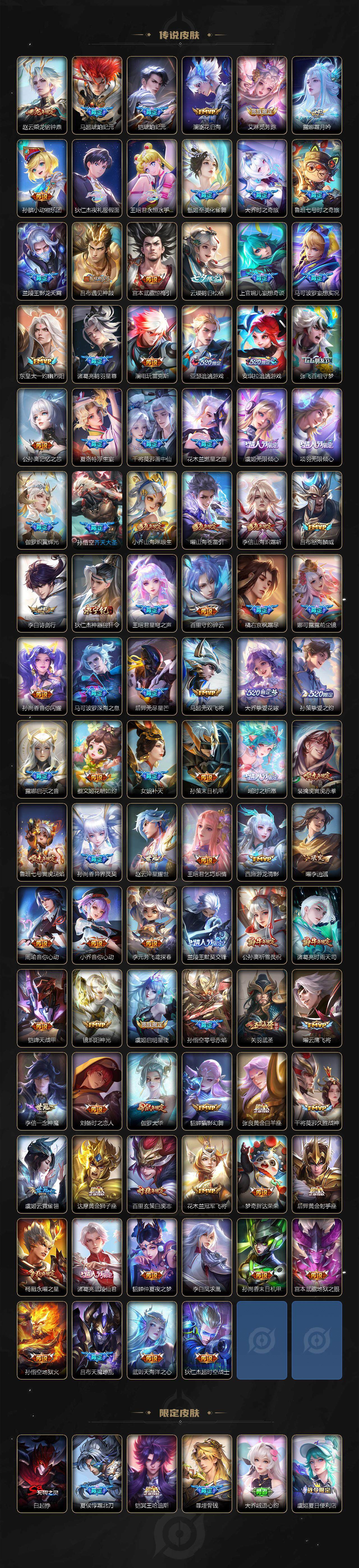亚瑟狮心王,庄周蜃楼王,扁鹊炼金王,虞姬凯尔特女王,白起狰,太乙真人饕餮,曹操烛龙,芈月重明,典韦穷奇,狂铁御狮,米莱狄御霄,牛魔御旌,盾山御銮,夏侯惇朔风刀,明世隐疑决卦,老夫子醍醐杖,鬼谷子原初探秘者,狄仁杰万华元夜,程咬金演武夺筹,钟馗驱傩正仪,苏烈千军破阵,吕布猎兽之王,女娲朔望之晖,典韦蓝屏警告,钟馗神迹守卫,鲁班七号狮舞东方,沈梦溪星空之诺,李元芳银河之约,刘邦夺宝奇兵,马可波罗暗影游猎,蒙犽狂想玩偶喵,元歌云间偶戏,弈星混沌棋,达摩沙漠行僧,兰陵王金庭之子,沈梦溪大漠名商,李元芳云中旅人,桑启海盐诗旅,裴擒虎擒涛扼浪,鲁班大师探海日志,张良古海寻踪,项羽苍威无极,镜青焰无极