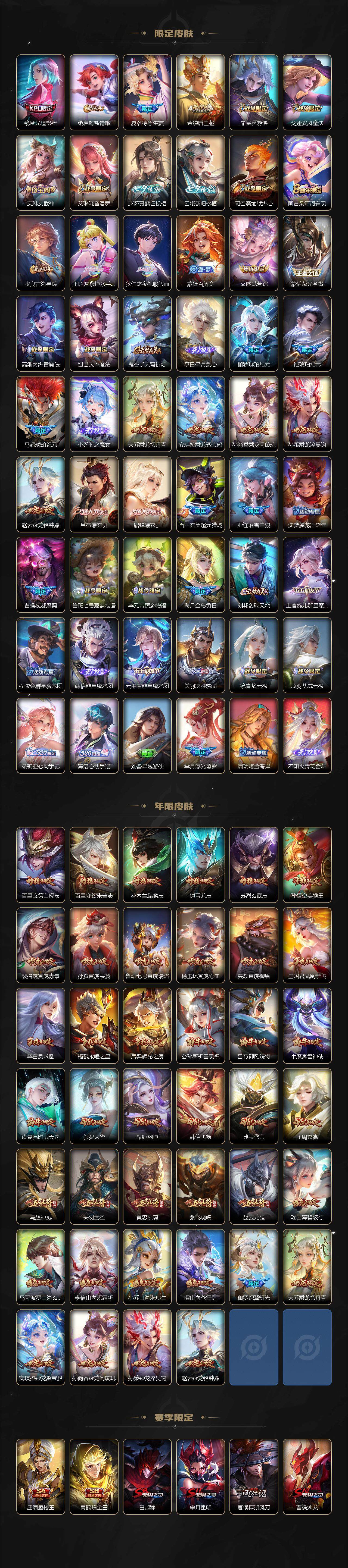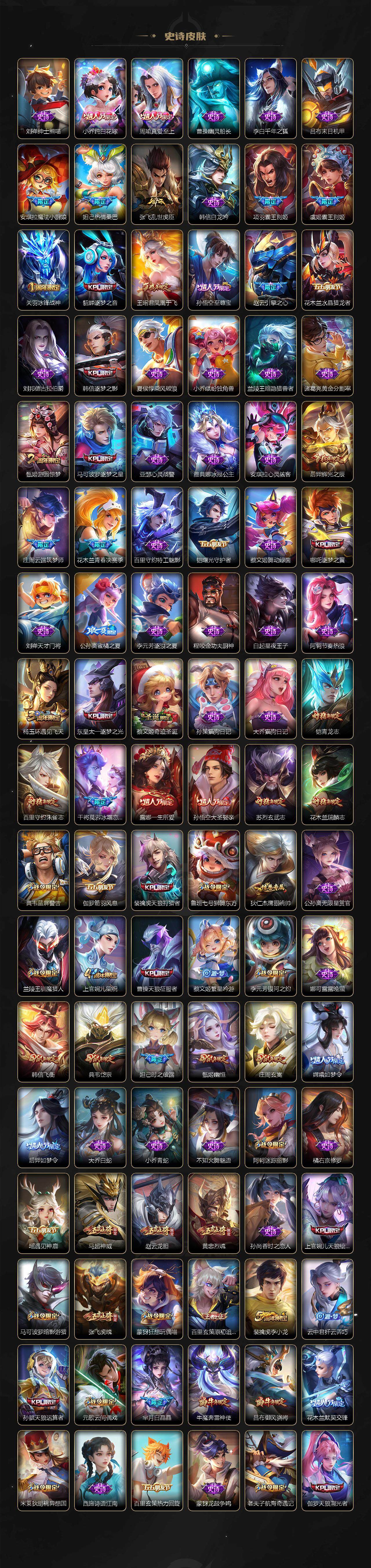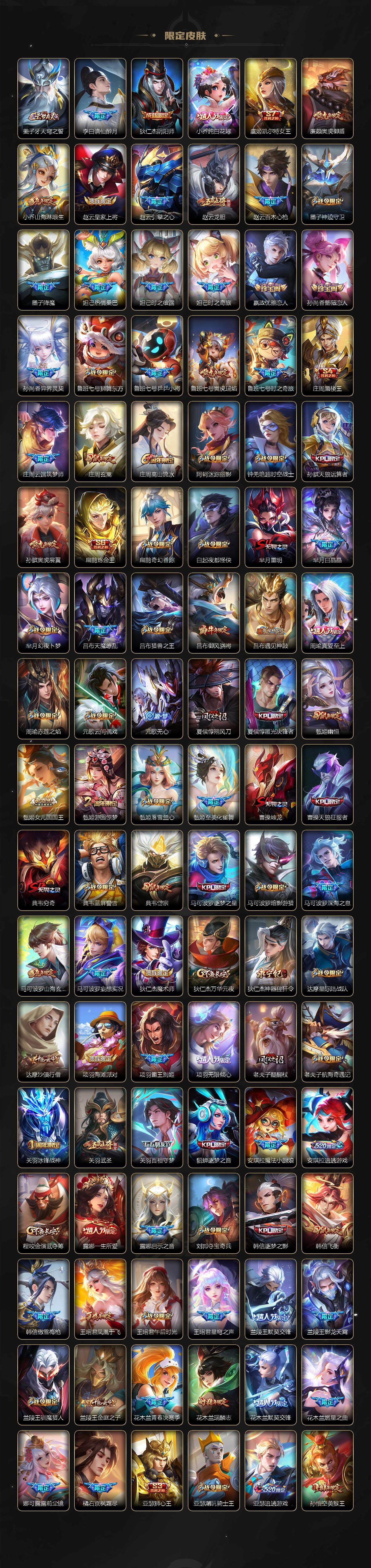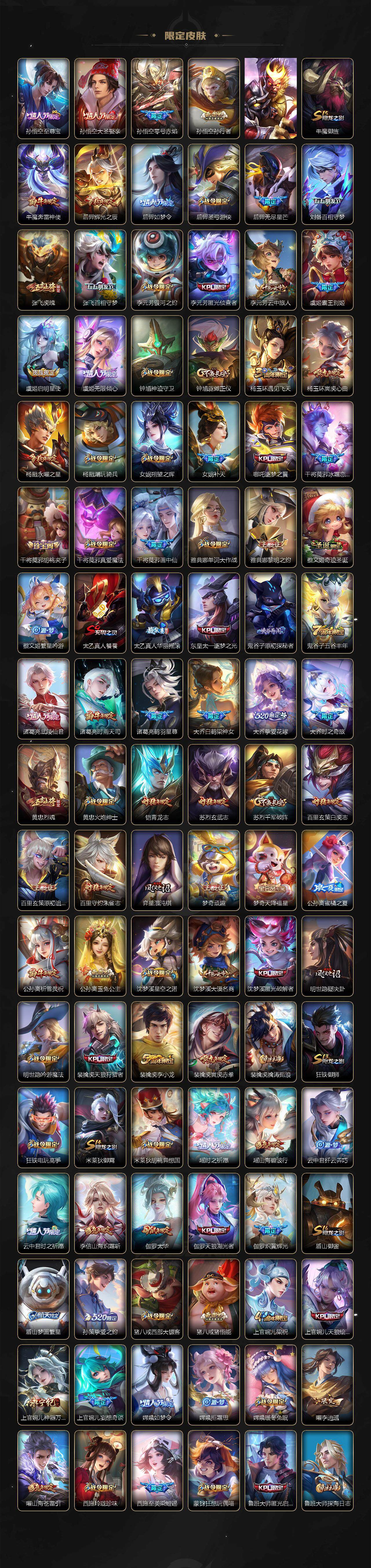 关羽冰锋战神,裴擒虎李小龙,上官婉儿梁祝,牛魔奔雷神使,貂蝉逐梦之音,公孙离祈雪灵祝,吕布御风骁将,诸葛亮时雨天司,赵云龙胆,关羽武圣,黄忠烈魂,张飞虎魄,马超神威,后羿辉光之辰,庄周玄嵩,典韦岱宗,甄姬幽恒,韩信飞衡,伽罗太华,曹操天狼征服者,裴擒虎天狼狩猎者,孙膑天狼运算者,上官婉儿天狼绘梦者,伽罗天狼溯光者,哪吒逐梦之翼,马可波罗逐梦之星,韩信逐梦之影,东皇太一逐梦之光,铠青龙志,百里玄策白虎志,花木兰瑞麟志,苏烈玄武志,百里守约朱雀志,王昭君凤凰于飞,项羽霸王别姬,虞姬霸王别姬,小乔纯白花嫁,周瑜真爱至上,孙悟空大圣娶亲,露娜一生所爱,花木兰默契交锋,兰陵王默契交锋,后羿如梦令,嫦娥如梦令,孙悟空至尊宝,雅典娜神奇女侠,妲己热情桑巴,干将莫邪冰霜恋舞曲,花木兰青春决赛季,蔡文姬奇迹圣诞,妲己时之彼端,公孙离蜜橘之夏,芈月白晶晶,安琪拉魔法小厨娘,赵云引擎之心,孙悟空美猴王,庄周云端筑梦师,鲁班七号乒乒小将,大乔白鹤梁神女,猪八戒猪悟能,廉颇寅虎·御盾,孙尚香异界灵契,孙悟空孙行者,甄姬女儿国国王,镜匿光追影者,韩信傲雪梅枪,鲁班七号寅虎·瑞焰,孙膑寅虎·展翼,杨玉环寅虎·心曲,裴擒虎寅虎·赤拳,云中君时之祈愿,瑶时之祈愿,女娲补天,赵云百木心枪,公孙离玉兔公主,露娜启示之音,夏侯惇匿光决锋者,后羿无尽星芒,马可波罗深海之息,金蝉唐三藏,娜可露露前尘镜,橘右京枫霜尽,鲁班大师匿光启智者,妲己时之奇旅,王昭君星穹之声,上官婉儿神器·万象笔,盾山梦圆繁星,墨子降魔,李白诗剑行,马可波罗山海·玄木吟,瑶山海·碧波行,兰陵王影龙天霄,西施至美·乘鲤谣,甄姬至美·化雀舞,夏侯惇霜北刀,桑启鸣野蒿,澜愿照·九州拓,虞姬愿照·岁时盈,司空震愿照·山河定,妲己愿照·众生和