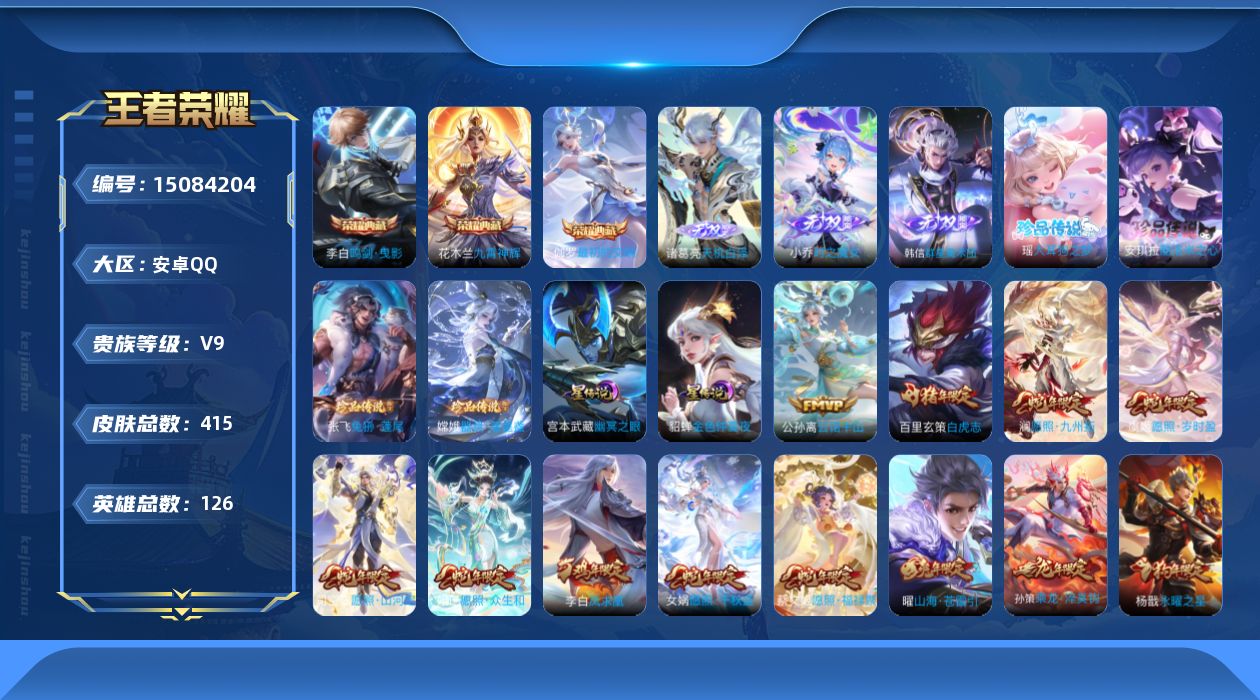 [15084204]可二次【店主推荐捡漏号!可直接换绑】安卓Q-V9-最强王者段位-126英雄-415皮肤-3典藏皮肤-3无双-4珍品传说-47传说-121史诗-3星元 【英雄全皮】:孙权全皮,钟馗全皮,鬼谷子全皮,蒙恬全皮,司空震全皮,赵怀真全皮,空空儿全皮,影全皮 【荣耀典藏】:李白鸣剑曳影,花木兰九霄神辉,伽罗最初的交响 【无双皮肤】:小乔时之魔女,韩信群星魔术团,诸葛亮天机白泽 【珍品传说】:嫦娥器灵落星盏,张飞兔狲蓬尾,瑶大耳狗之梦,安琪拉酷洛米之心 【传说皮肤】:后羿神树通天,公孙离云诺千山,西施续相思,杨玉环星之鸣奏,后羿千劫归真,司空震愿照山河定,女娲愿照千秋盛,妲己愿照众生和,澜愿照九州拓,蔡文姬愿照福禄聚,虞姬愿照岁时盈,云缨幻光神枪,裴擒虎祥瑞亨通,桑启鸣野蒿,典韦战鼓燎原,孙尚香乘龙问璇玑,孙策乘龙淬吴钩,诸葛亮鹤羽星尊,澜电玩雷克斯,公孙离记忆之芯,花木兰燃星之曲,曜山海苍雷引,吕布怒海麟威,不知火舞绯月行,百里守约碎云,马超无双飞将,女娲补天,孙策末日机甲,赵云淬星耀世,诸葛亮时雨天司,虞姬启明星使,关羽武圣,曜云鹰飞将,李信一念神魔,刘备时之恋人,干将莫邪久胜战神,虞姬云霓雀翎,达摩黄金狮子座,百里玄策白虎志,花木兰冠军飞将,后羿黄金射手座,杨戬永曜之星,诸葛亮武陵仙君,貂蝉仲夏夜之梦,李白凤求凰,宫本武藏地狱之眼,武则天海洋之心 【限定皮肤】:姜子牙天穹之誓,狄仁杰阴阳师,赵云皇家上将,嬴政白昼王子,鲁班七号狮舞东方,庄周高山流水,高渐离死亡摇滚,高渐离玩趣恶龙,钟无艳超时空战士,扁鹊奇幻香踪,白起夜都怪侠,芈月幻夜卜梦,吕布猎兽之王,周瑜赤莲之焰,元歌云间偶戏,元歌无心,夏侯惇朔风刀,甄姬游园惊梦,甄姬落雪兰心,马可波罗山海玄木吟,狄仁杰魔术师,狄仁杰万华元夜,达摩沙漠行僧,项羽海滩派对,老夫子醍醐杖,关羽武圣,程咬金演武夺筹,露娜一生所爱,韩信飞衡,韩信傲雪梅枪,兰陵王驯魔猎人,兰陵王金庭之子,花木兰青春决赛季,花木兰瑞麟志,花木兰燃星之曲,不知火舞绯月行,亚瑟潮玩骑士王,孙悟空至尊宝,牛魔御旌,后羿圣弓游侠,李元芳云中旅人,虞姬霸王别姬,虞姬启明星使,钟馗神迹守卫,钟馗驱傩正仪,杨玉环遇见飞天,杨戬永曜之星,杨戬潮玩骑兵,女娲补天,干将莫邪冰霜恋舞曲,干将莫邪胡桃夹子,干将莫邪真爱魔法,雅典娜单词大作战,雅典娜黎明之约,鬼谷子原初探秘者,鬼谷子五