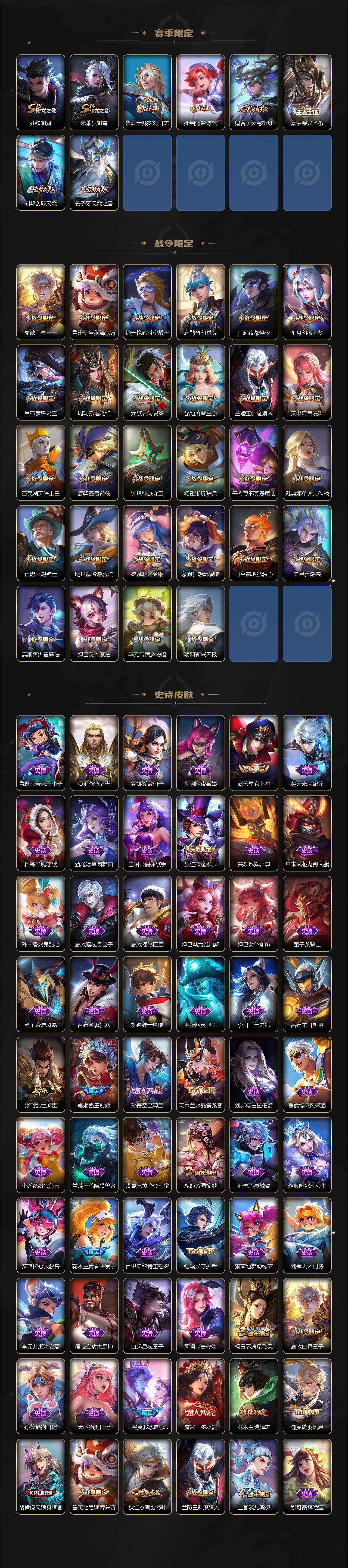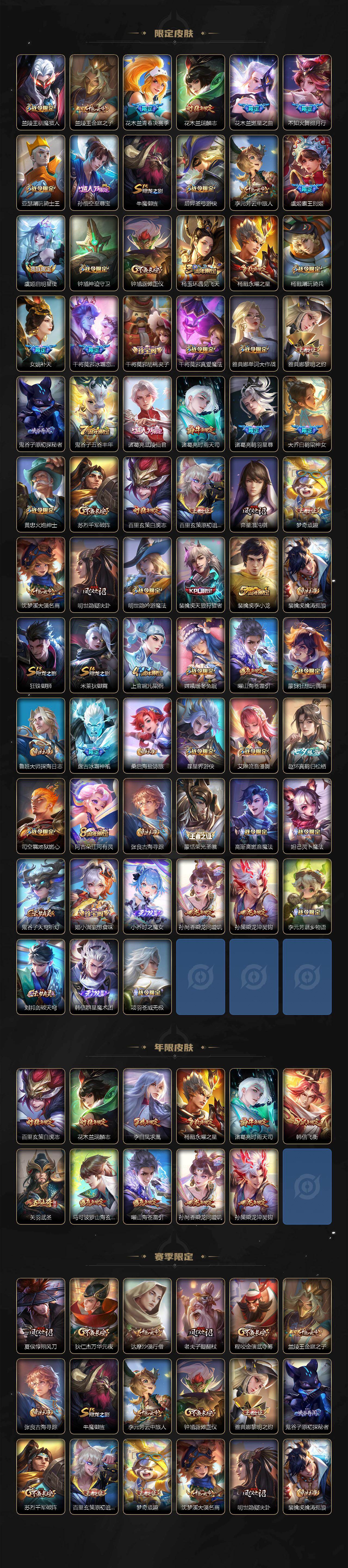 【限定皮肤】:姜子牙天穹之誓,狄仁杰阴阳师,赵云皇家上将,嬴政白昼王子,鲁班七号狮舞东方,庄周高山流水,高渐离死亡摇滚,高渐离玩趣恶龙,钟无艳超时空战士,扁鹊奇幻香踪,白起夜都怪侠,芈月幻夜卜梦,吕布猎兽之王,周瑜赤莲之焰,元歌云间偶戏,元歌无心,夏侯惇朔风刀,甄姬游园惊梦,甄姬落雪兰心,马可波罗山海玄木吟,狄仁杰魔术师,狄仁杰万华元夜,达摩沙漠行僧,项羽海滩派对,老夫子醍醐杖,关羽武圣,程咬金演武夺筹,露娜一生所爱,韩信飞衡,韩信傲雪梅枪,兰陵王驯魔猎人,兰陵王金庭之子,花木兰青春决赛季,花木兰瑞麟志,花木兰燃星之曲,不知火舞绯月行,亚瑟潮玩骑士王,孙悟空至尊宝,牛魔御旌,后羿圣弓游侠,李元芳云中旅人,虞姬霸王别姬,虞姬启明星使,钟馗神迹守卫,钟馗驱傩正仪,杨玉环遇见飞天,杨戬永曜之星,杨戬潮玩骑兵,女娲补天,干将莫邪冰霜恋舞曲,干将莫邪胡桃夹子,干将莫邪真爱魔法,雅典娜单词大作战,雅典娜黎明之约,鬼谷子原初探秘者,鬼谷子五