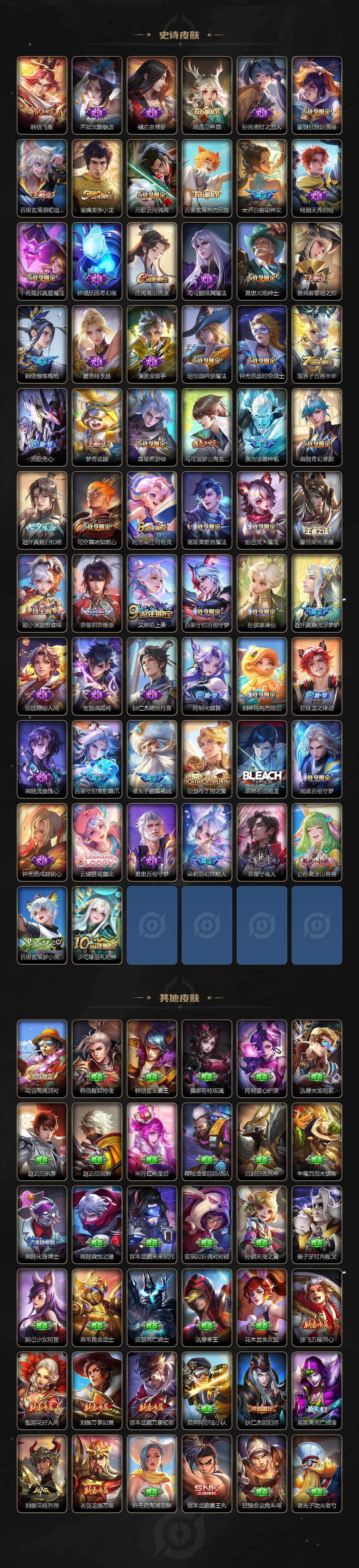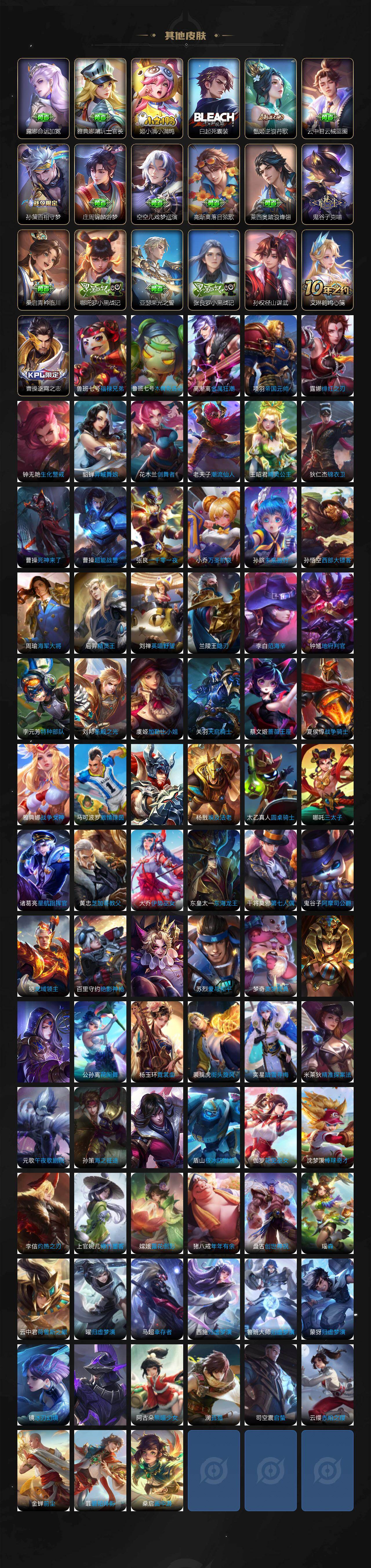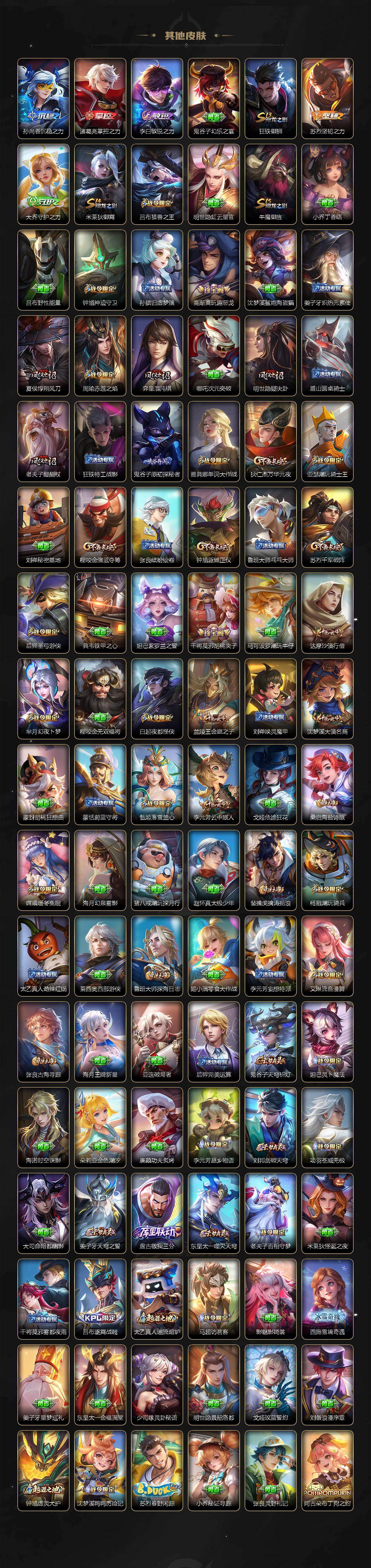 瑶遇见神鹿,娜可露露晚萤,伽罗箭羽风息,李元芳逐浪之夏,不知火舞魅语,大乔猫狗日记,孙策猫狗日记,阿轲节奏热浪,露娜紫霞仙子,诸葛亮黄金分割率,王昭君偶像歌手,项羽苍穹之光,孙尚香时之恋人,阿轲暗夜猫娘,雅典娜冰冠公主,吕布末日机甲,鲁班七号电玩小子,橘右京修罗,墨子龙骑士,嬴政摇滚巨星,刘禅绅士熊喵,刘禅天才门将,白起星夜王子,安琪拉心灵骇客,程咬金功夫厨神,刘邦德古拉伯爵,兰陵王暗隐猎兽者,曹操幽灵船长,宫本武藏鬼剑武藏,司马懿暗渊魔法,亚瑟心灵战警,钟馗乐园奇幻夜,杨戬天秀·启明,蔡文姬舞动绿茵,廉颇地狱岩魂,小乔缤纷独角兽,夏侯惇乘风破浪,花木兰水晶猎龙者,铠曙光守护者,百里玄策热力回旋,墨子金属风暴,百里玄策原初追逐者,吕布圣诞狂欢,貂蝉圣诞恋歌,百里守约特工魅影,嬴政暗夜贵公子,雅典娜黎明之约,李白千年之狐,夏洛特永昼,澜赏金猎手,赵怀真鹤归松栖,高渐离燃音魔法,赵怀真器灵·浮梦炉,亚连糖绘人间,苍狼魂孤将,狄仁杰绮世丹青