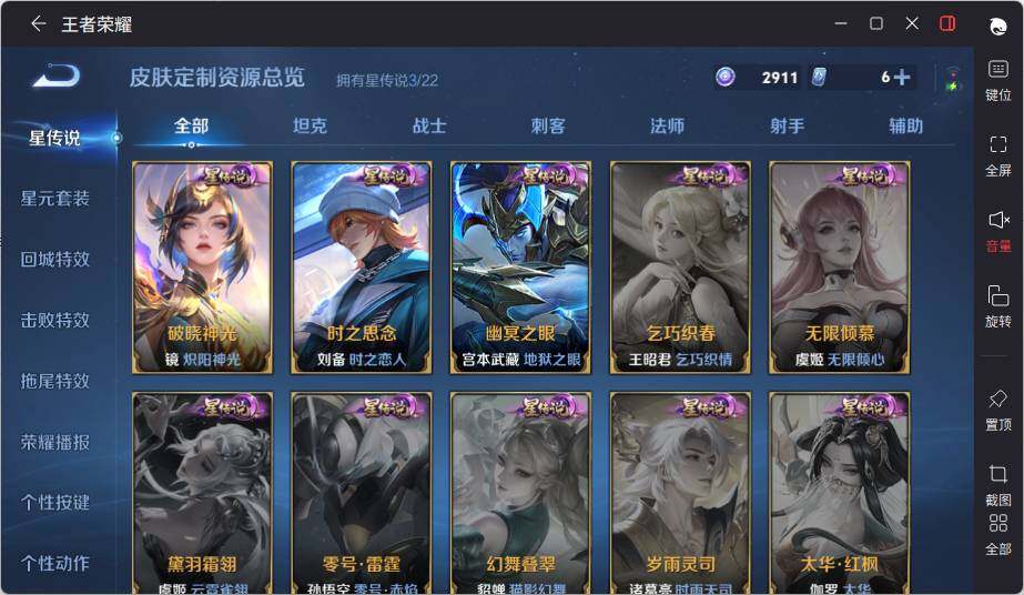 关羽冰锋战神,裴擒虎李小龙,吕布御风骁将,张飞虎魄,典韦岱宗,裴擒虎天狼狩猎者,伽罗天狼溯光者,韩信逐梦之影,铠青龙志,百里玄策白虎志,项羽霸王别姬,花木兰默契交锋,兰陵王默契交锋,孙悟空至尊宝,庄周云端筑梦师,赵云百木心枪,公孙离玉兔公主,金蝉唐三藏,上官婉儿神器·万象笔,李白诗剑行