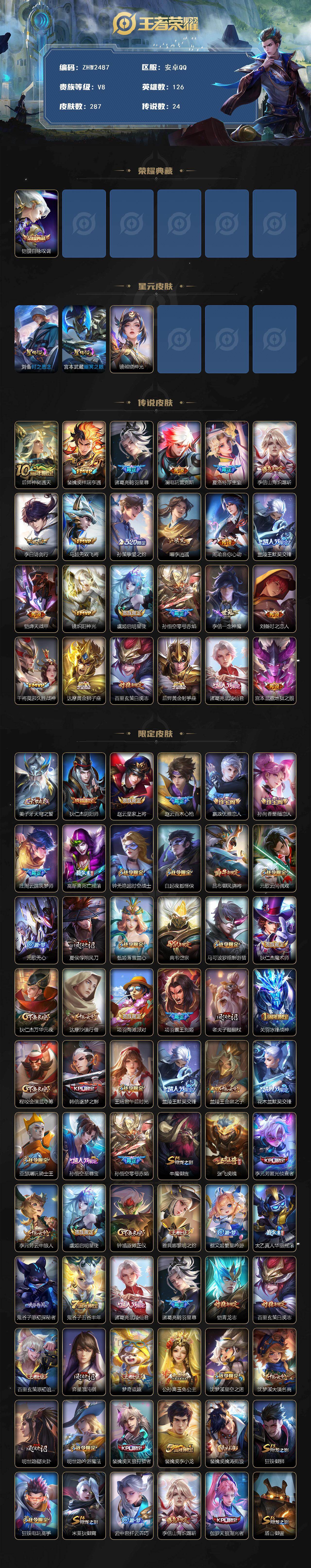 - [12851430]安卓Q-V5-尊贵铂金III段位-125英雄-204皮肤-0典藏-0珍品无双-0无双-0珍品传说-11传说-50史诗 【传说皮肤】:司空震愿照山河定,虞姬愿照岁时盈,桑启鸣野蒿,夏洛特浮生妄,虞姬无限倾心,李信山海炽霜斩,鲁班七号寅虎瑞焰,赵云淬星耀世,李信一念神魔,达摩黄金狮子座,狄仁杰超时空战士 【限定皮肤】:狄仁杰阴阳师,赵云皇家上将,墨子神迹守卫,妲己时之彼端,孙尚香蔷薇恋人,鲁班七号寅虎瑞焰,孙膑寅虎展翼,白起夜都怪侠,芈月重明,元歌云间偶戏,元歌无心,典韦穷奇,狄仁杰魔术师,狄仁杰万华元夜,达摩星际陆战队,达摩沙漠行僧,项羽海滩派对,老夫子醍醐杖,老夫子航海奇遇记,程咬金演武夺筹,韩信飞衡,韩信傲雪梅枪,兰陵王金庭之子,亚瑟潮玩骑士王,牛魔奔雷神使,后羿如梦令,李元芳云中旅人,虞姬无限倾心,钟馗驱傩正仪,鬼谷子原初探秘者,鬼谷子五谷丰年,苏烈千军破阵,弈星混沌棋,沈梦溪大漠名商,明世隐疑决卦,裴擒虎李小龙,裴擒虎擒涛扼浪,狂铁御狮,米莱狄胡桃异想国,云中君纤云弄巧,李信山海炽霜斩,伽罗天狼溯光者,盾山御銮,嫦娥拒霜思,鲁班大师探海日志,桑启海盐诗旅,夏洛特浮生妄,张良古海寻踪,高渐离燃音魔法,姬小满妄想食味,程咬金群星魔术团 【年限皮肤】:孙膑寅虎展翼,鲁班七号寅虎瑞焰,牛魔奔雷神使,韩信飞衡,李信山海炽霜斩 【赛季限定】:芈月重明,典韦穷奇,狄仁杰万华元夜,达摩沙漠行僧,老夫子醍醐杖,程咬金演武夺筹,兰陵王金庭之子,张良古海寻踪,李元芳云中旅人,钟馗驱傩正仪,鬼谷子原初探秘者,苏烈千军破阵,弈星混沌棋,沈梦溪大漠名商,明世隐疑决卦,裴擒虎擒涛扼浪,狂铁御狮,盾山御銮,鲁班大师探海日志,桑启海盐诗旅 【战令限定】:墨子神迹守卫,白起夜都怪侠,元歌云间偶戏,达摩星际陆战队,老夫子航海奇遇记,亚瑟潮玩骑士王,米莱狄胡桃异想国,高渐离燃音魔法 【史诗皮肤】:鲁班七号电玩小子,露娜紫霞仙子,赵云皇家上将,赵云未来纪元,狄仁杰魔术师,孙尚香蔷薇恋人,嬴政摇滚巨星,墨子龙骑士,吕布末日机甲,花木兰水晶猎龙者,夏侯惇乘风破浪,雅典娜冰冠公主,安琪拉心灵骇客,铠曙光守护者,刘禅天才门将,程咬金功夫厨神,伽罗箭羽风息,狄仁杰鹰眼统帅,娜可露露晚萤,韩信飞衡,妲己时之彼端,后羿如梦令,裴擒虎李小龙,云中君纤云弄巧,元歌云间偶戏,牛魔奔雷神使,米莱狄胡桃异想国,百里玄策热力