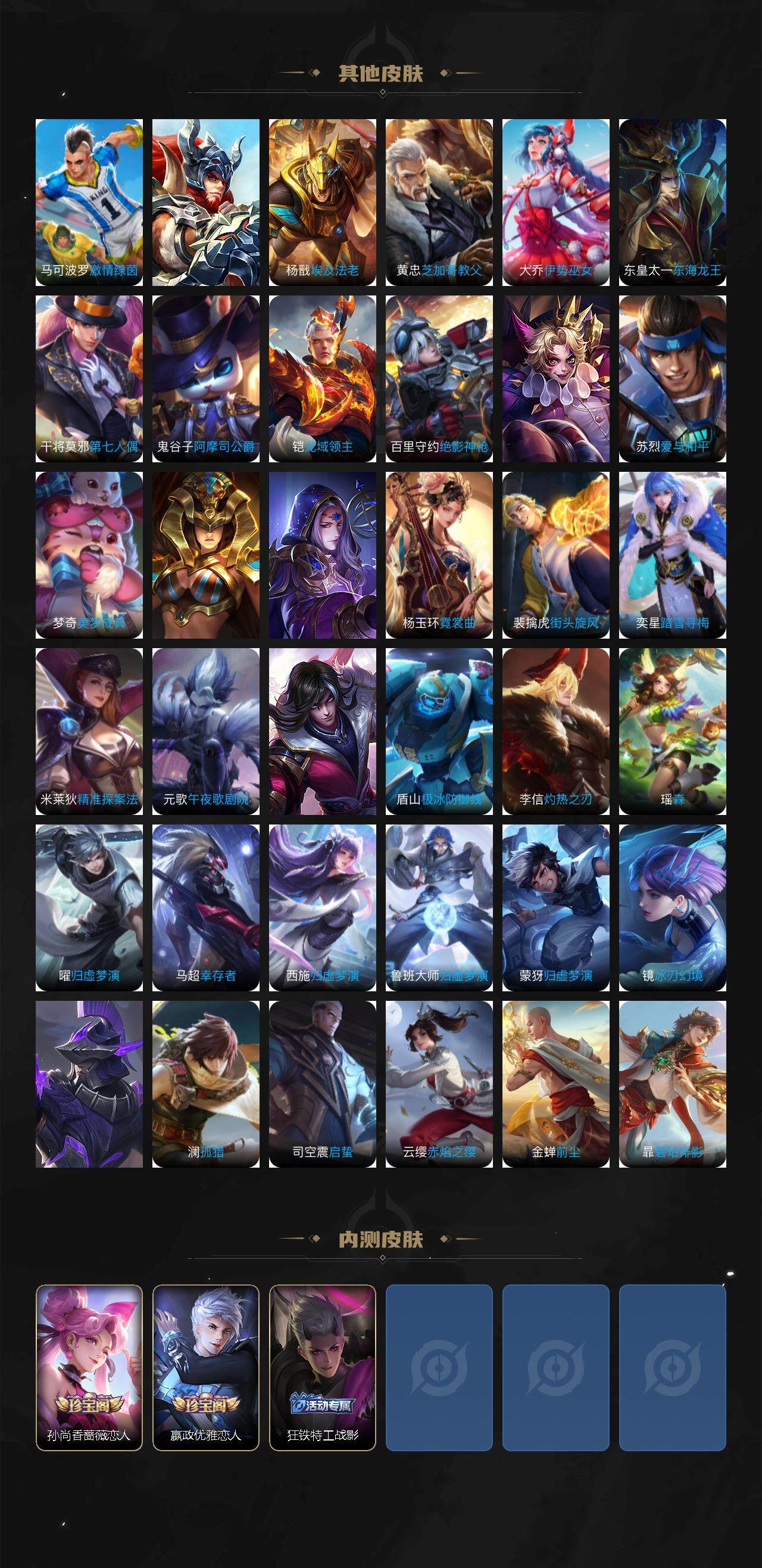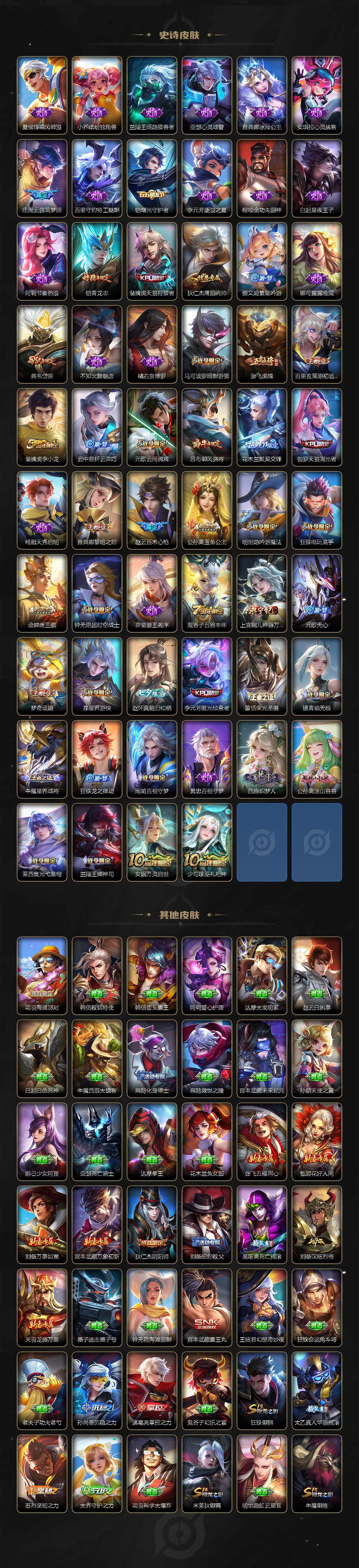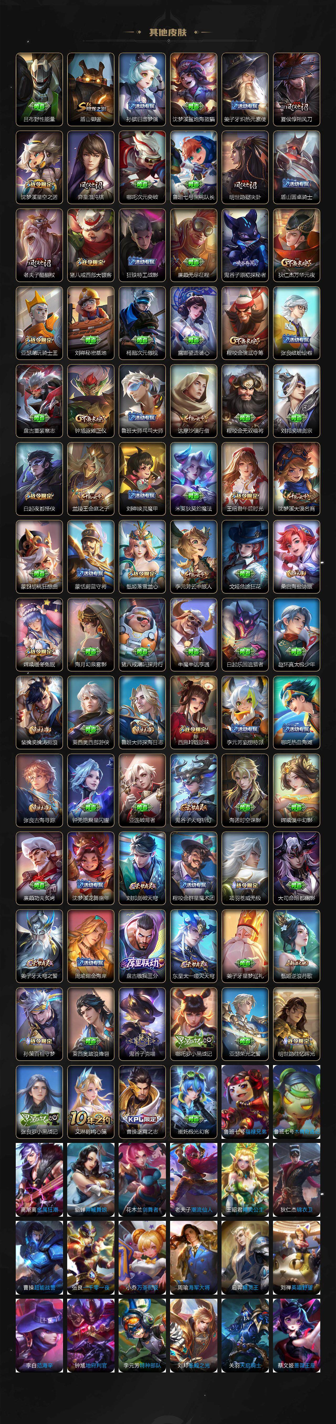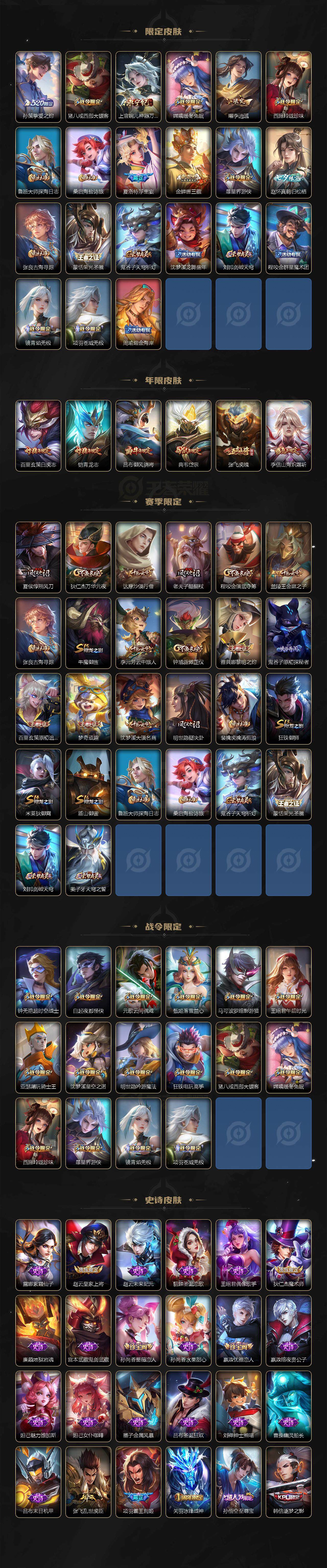 【限定皮肤】:姜子牙天穹之誓,狄仁杰阴阳师,赵云皇家上将,赵云百木心枪,嬴政优雅恋人,孙尚香蔷薇恋人,庄周云端筑梦师,高渐离死亡摇滚,钟无艳超时空战士,白起夜都怪侠,吕布御风骁将,元歌云间偶戏,元歌无心,夏侯惇朔风刀,甄姬落雪兰心,典韦岱宗,马可波罗暗影游猎,狄仁杰魔术师,狄仁杰万华元夜,达摩沙漠行僧,项羽海滩派对,项羽霸王别姬,老夫子醍醐杖,关羽冰锋战神,程咬金演武夺筹,韩信逐梦之影,王昭君午后时光,兰陵王默契交锋,兰陵王金庭之子,花木兰默契交锋,亚瑟潮玩骑士王,孙悟空至尊宝,孙悟空零号赤焰,牛魔御旌,张飞虎魄,李元芳匿光侦查者,李元芳云中旅人,虞姬启明星使,钟馗驱傩正仪,雅典娜黎明之约,蔡文姬繁星吟游,太乙真人华丽摇滚,鬼谷子原初探秘者,鬼谷子五谷丰年,诸葛亮武陵仙君,诸葛亮鹤羽星尊,铠青龙志,百里玄策白虎志,百里玄策原初追逐者,弈星混沌棋,梦奇顽趣,公孙离玉兔公主,沈梦溪星空之诺,沈梦溪大漠名商,明世隐疑决卦,明世隐吟游魔法,裴擒虎天狼狩猎者,裴擒虎李小龙,裴擒虎擒涛扼浪,狂铁御狮,狂铁电玩高手,米莱狄御霄,云中君纤云弄巧,李信山海炽霜斩,伽罗天狼溯光者,盾山御銮,孙策挚爱之约,猪八戒西部大镖客,上官婉儿神器万象笔,嫦娥暖冬兔眠,曜李逍遥 ,西施玲珑珍味,鲁班大师探海日志,桑启海盐诗旅,夏洛特浮生妄,金蝉唐三藏,暃星界游侠,赵怀真鹤归松栖,张良古海寻踪,蒙恬荣光圣徽,鬼谷子天穹祈灯,沈梦溪龙舞盛年,刘邦剑破天穹,程咬金群星魔术团,镜青焰无极,项羽苍威无极,周瑜熔金海岸