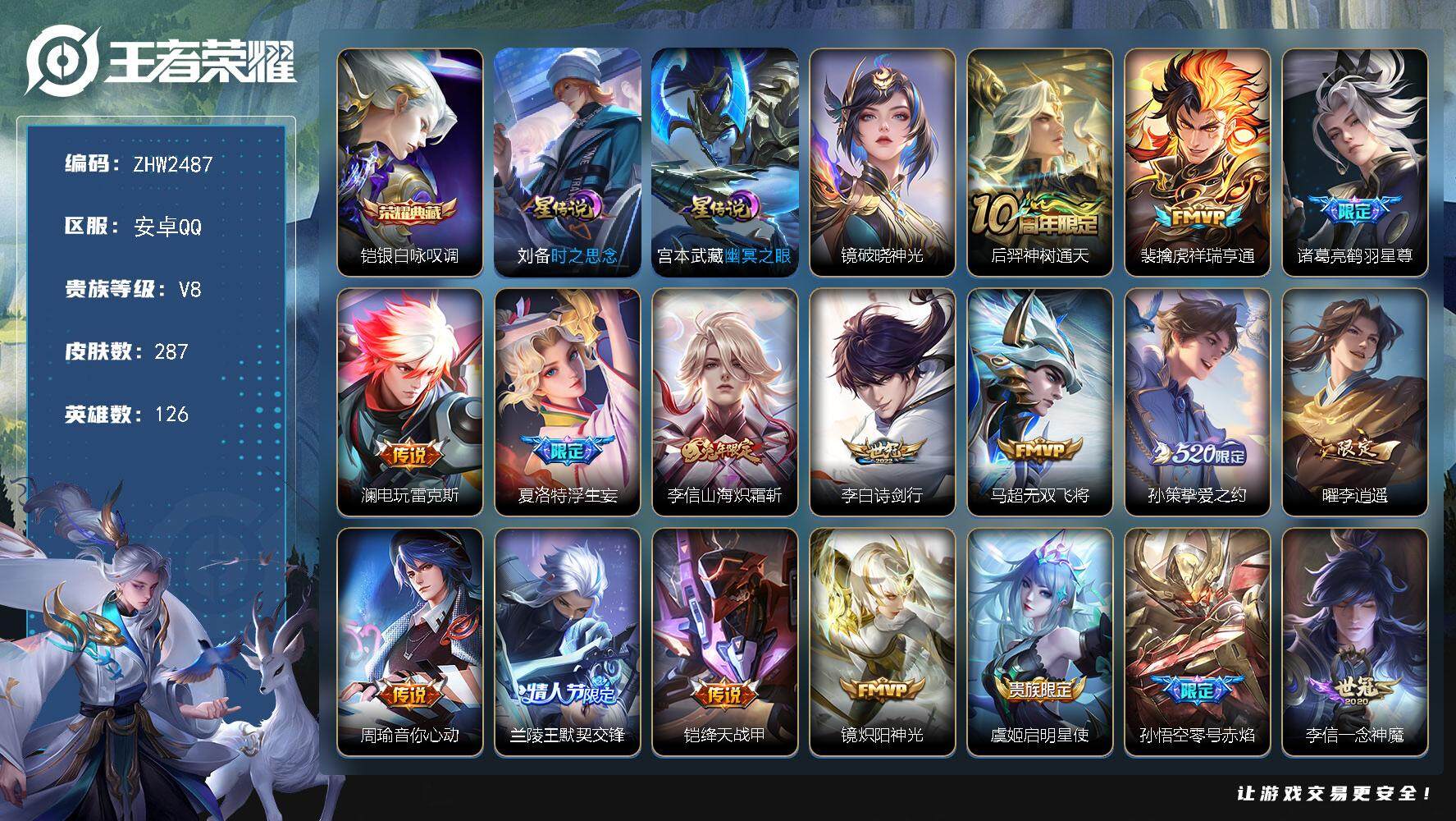 [15084658]【店主推荐捡漏号!可直接换绑】安卓Q-V8-最强王者段位41段打野-126英雄-287皮肤-1典藏皮肤-24传说-82史诗-3星元 【英雄全皮】:鬼谷子全皮,狂铁全皮,李信全皮,蒙恬全皮,金蝉全皮 【荣耀典藏】:铠银白咏叹调 【传说皮肤】:后羿神树通天,裴擒虎祥瑞亨通,诸葛亮鹤羽星尊,澜电玩雷克斯,夏洛特浮生妄,李信山海炽霜斩,李白诗剑行,马超无双飞将,孙策挚爱之约,曜李逍遥 ,周瑜音你心动,兰陵王默契交锋,铠绛天战甲,镜炽阳神光,虞姬启明星使,孙悟空零号赤焰,李信一念神魔,刘备时之恋人,干将莫邪久胜战神,达摩黄金狮子座,百里玄策白虎志,后羿黄金射手座,诸葛亮武陵仙君,宫本武藏地狱之眼 【限定皮肤】:姜子牙天穹之誓,狄仁杰阴阳师,赵云皇家上将,赵云百木心枪,嬴政优雅恋人,孙尚香蔷薇恋人,庄周云端筑梦师,高渐离死亡摇滚,钟无艳超时空战士,白起夜都怪侠,吕布御风骁将,元歌云间偶戏,元歌无心,夏侯惇朔风刀,甄姬落雪兰心,典韦岱宗,马可波罗暗影游猎,狄仁杰魔术师,狄仁杰万华元夜,达摩沙漠行僧,项羽海滩派对,项羽霸王别姬,老夫子醍醐杖,关羽冰锋战神,程咬金演武夺筹,韩信逐梦之影,王昭君午后时光,兰陵王默契交锋,兰陵王金庭之子,花木兰默契交锋,亚瑟潮玩骑士王,孙悟空至尊宝,孙悟空零号赤焰,牛魔御旌,张飞虎魄,李元芳匿光侦查者,李元芳云中旅人,虞姬启明星使,钟馗驱傩正仪,雅典娜黎明之约,蔡文姬繁星吟游,太乙真人华丽摇滚,鬼谷子原初探秘者,鬼谷子五谷丰年,诸葛亮武陵仙君,诸葛亮鹤羽星尊,铠青龙志,百里玄策白虎志,百里玄策原初追逐者,弈星混沌棋,梦奇顽趣,公孙离玉兔公主,沈梦溪星空之诺,沈梦溪大漠名商,明世隐疑决卦,明世隐吟游魔法,裴擒虎天狼狩猎者,裴擒虎李小龙,裴擒虎擒涛扼浪,狂铁御狮,狂铁电玩高手,米莱狄御霄,云中君纤云弄巧,李信山海炽霜斩,伽罗天狼溯光者,盾山御銮,孙策挚爱之约,猪八戒西部大镖客,上官婉儿神器万象笔,嫦娥暖冬兔眠,曜李逍遥 ,西施玲珑珍味,鲁班大师探海日志,桑启海盐诗旅,夏洛特浮生妄,金蝉唐三藏,暃星界游侠,赵怀真鹤归松栖,张良古海寻踪,蒙恬荣光圣徽,鬼谷子天穹祈灯,沈梦溪龙舞盛年,刘邦剑破天穹,程咬金群星魔术团,镜青焰无极,项羽苍威无极,周瑜熔金海岸 【年限皮肤】:百里玄策白虎志,铠青龙志,吕布御风骁将,典韦岱宗,张飞虎魄,李信山海炽霜斩 【赛季限定】:夏侯