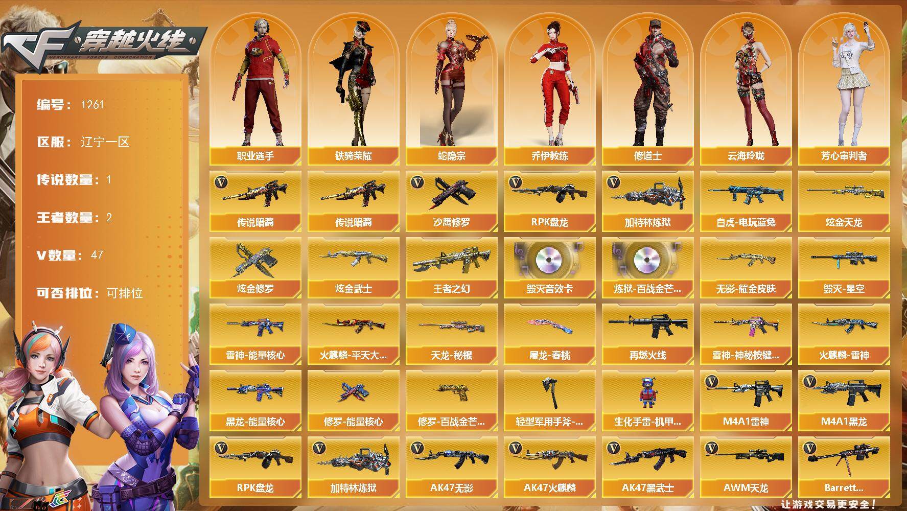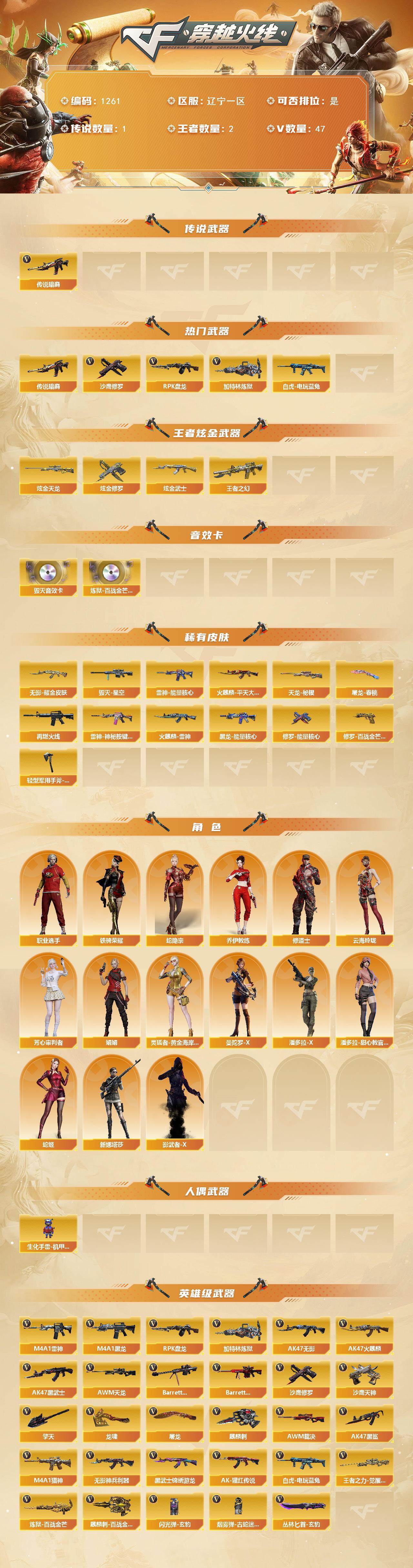[15089324]辽宁一区-47V-2王者-4炫金 【传说武器】:传说暗裔 【热门武器】:传说暗裔,白虎-电玩蓝兔,RPK-盘龙,加特林-炼狱*3,沙鹰-修罗*2 【王者炫金武器】:王者之幻,炫金武士*2,炫金天龙,炫金修罗 【音效卡】:Barrett-毁灭音效卡,炼狱-百战金芒-庆典舞曲音效卡 【皮肤】:雷神-能量核心,M4A1-再燃火线,雷神-神秘按键 皮肤,火麒麟-雷神,火麒麟-平天大圣,毁灭-星空,黑龙