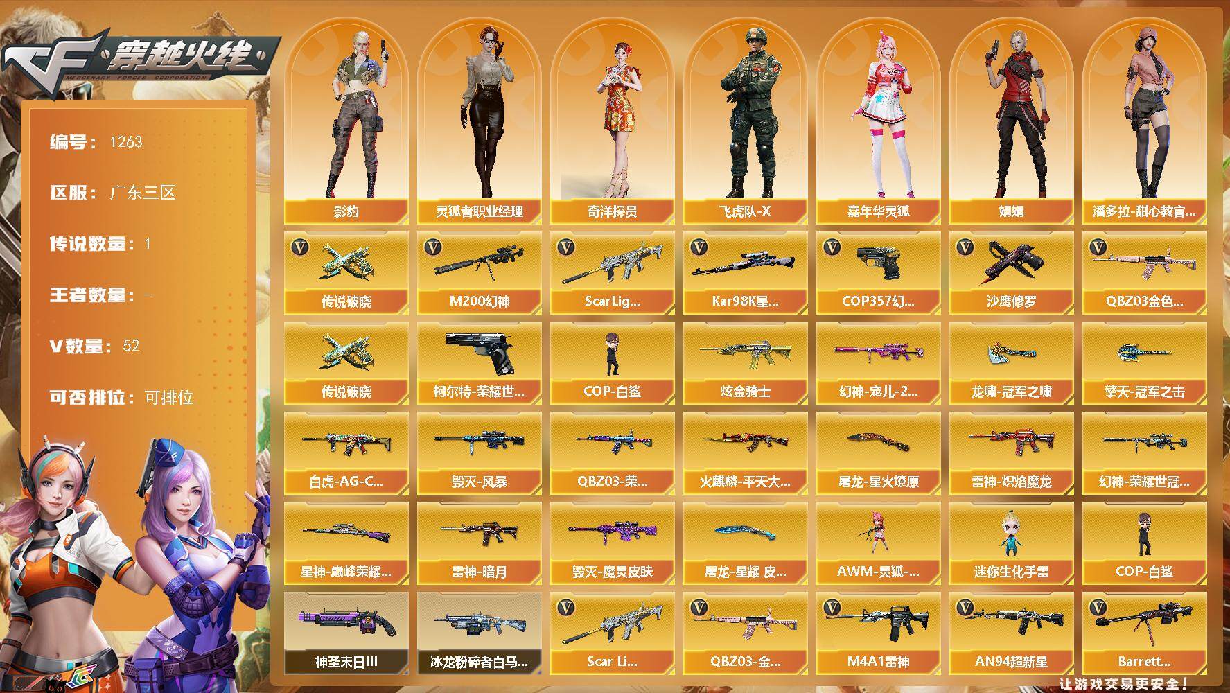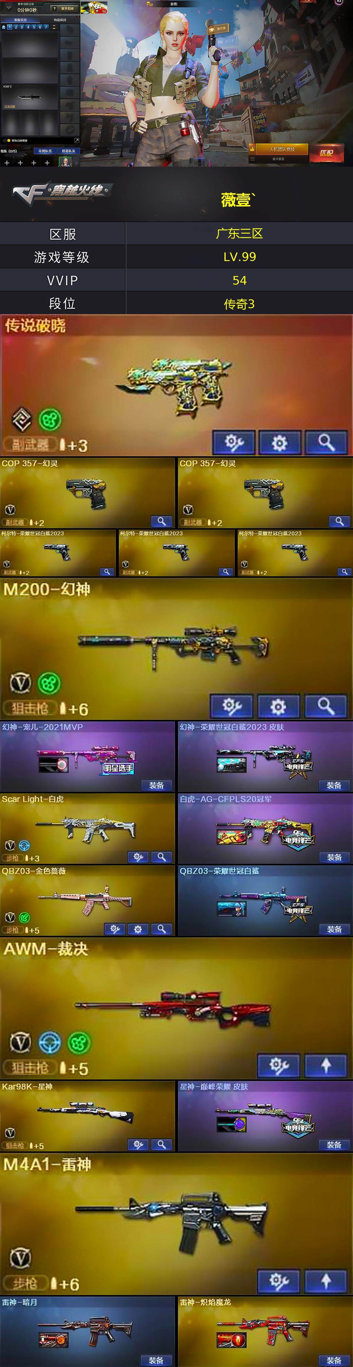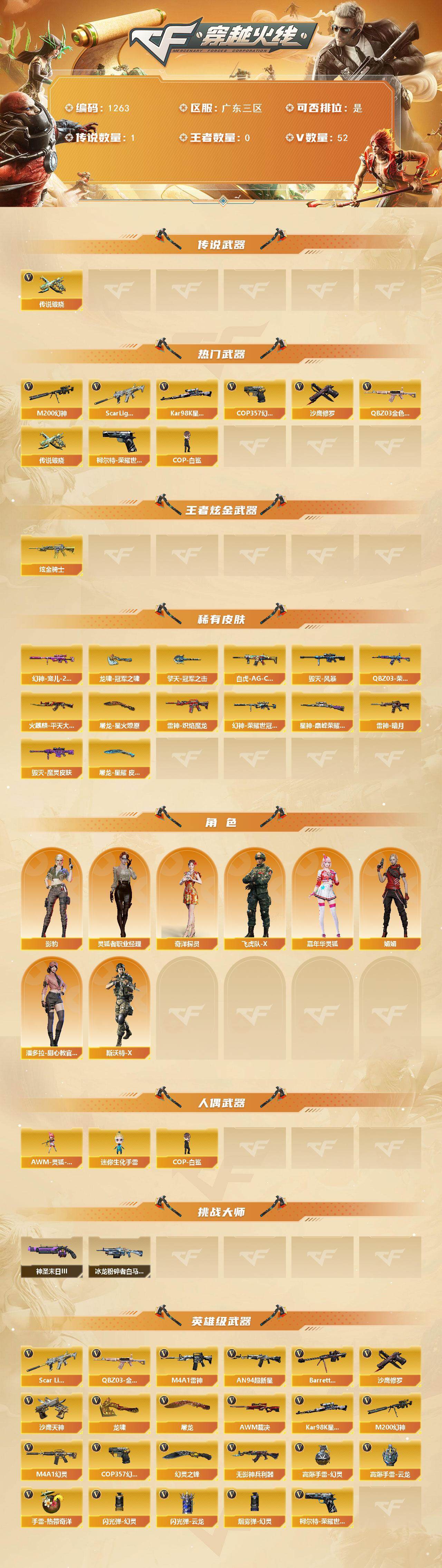 [15089673]广东三区-52V-0王者-1炫金 【传说武器】:传说破晓 【热门武器】:传说破晓,QBZ03-金色蔷薇,Scar Light-白虎,M200-幻神,柯尔特-荣耀世冠白鲨2023*3,Kar98K-星神,COP-白鲨,COP 357-幻灵*2,沙鹰-修罗*3 【王者炫金武器】:炫金骑士 【皮肤】:幻神-宠儿-2021MVP,幻神-荣耀世冠白鲨2023 皮肤,白虎-AG-CFPLS20冠军,QBZ