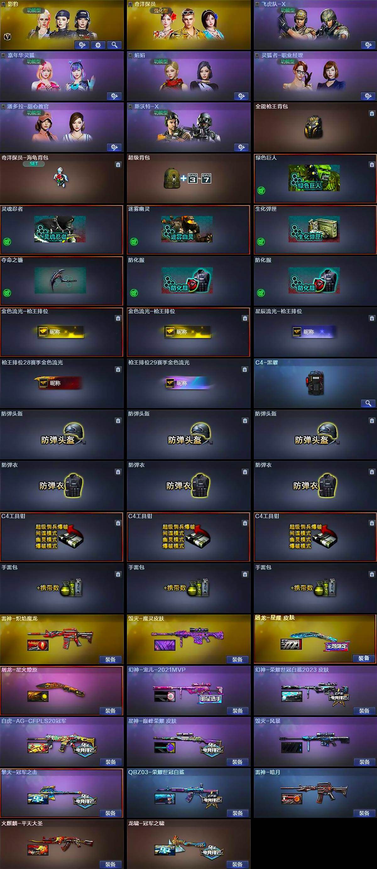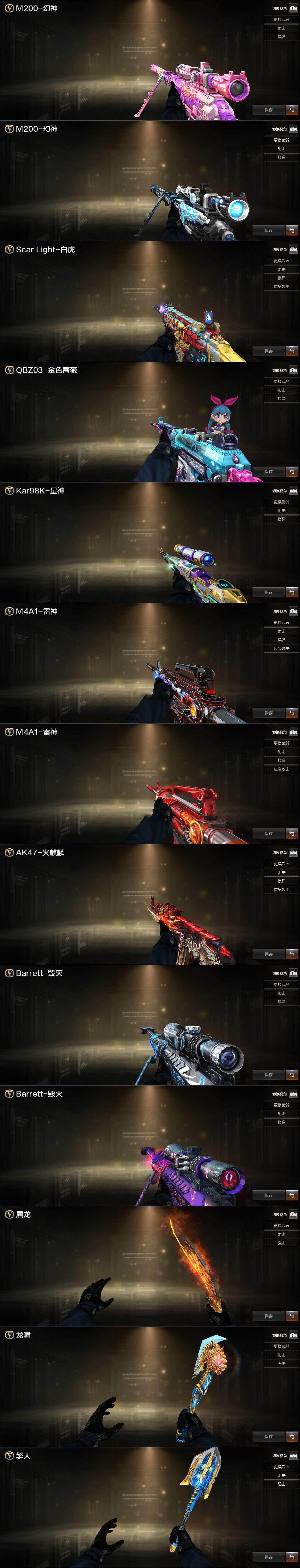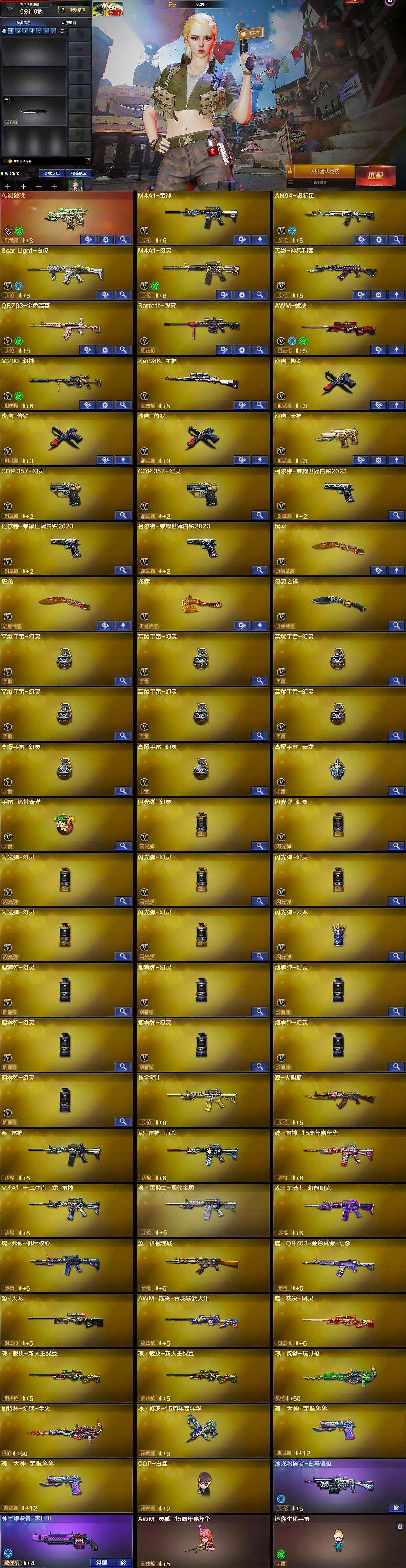 【热门武器】:传说破晓,QBZ03-金色蔷薇,Scar Light-白虎,M200-幻神,柯尔特-荣耀世冠白鲨2023*3,Kar98K-星神,COP-白鲨,COP 357-幻灵*2,沙鹰-修罗*3