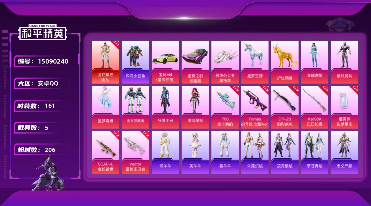 [15090240]素材身法号/地铁满天赋 安卓 手Q-1神装-6粉装-7特效枪-5载具-8粉色飞行器-6.9w热力值-13王牌印记-161套装-206枪皮【红色神装等级】:金蛇镇世-烛九(一级)【热门品类】:套装-深海小丑鱼,角色-忠义严颜,套装-龟仙人,角色-8号机,角色-Mark.06【粉色载具】:宝马M4(圣保罗黄),虚妄之影(炫耀紫),最终圣卫者摩托车,星梦玉骢,护世瑞兽【粉色套装】:角色-紫钛骑兵,角色-星梦奇缘,粉装-未来领航者,角色-狂魇小丑,角色-绯穹魔姬,角色-异瞳寒姬【粉色枪皮等级】:SCAR-L-金蛇镇世(三级),Famas-初号机 觉醒Ver.(六级),Vector-最终圣卫者(三级),P90-金丰海韵(七级),Kar98K-巳巳如意(五级),DP-28-豹影疾电(五级),烟雾弹-甜梦果泡(五级)【粉色飞行器】:酣梦熊熊飞行器,星梦奇缘飞行器,凤舞九天飞行器,万象金身飞行器,圣域金龙飞行器,圣辉之星飞行器,双重狂想飞行器,终晖之翼飞行器