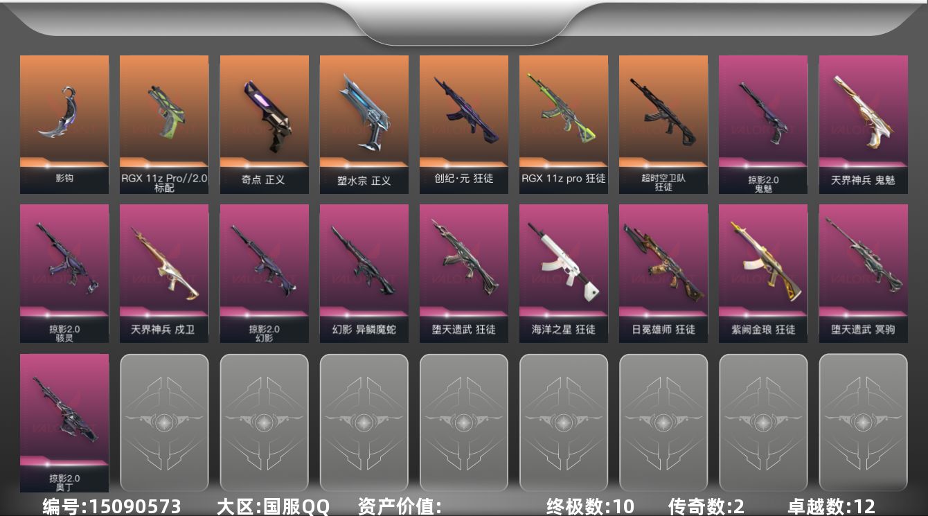 [15090573]【套装】:掠影//2.0套装 【英雄】:幻棱,炼狱,维斯,暮蝶,钛狐,壹决,铁臂,捷风,雷兹,幽影,不死鸟,贤者,猎枭,蝰蛇,零,芮娜,奇乐,尚勃勒,霓虹,斯凯,夜露,星礈,K/O,盖可,黑梦,钢锁 【近战武器】:近战武器-影钩,近战武器-日耀风暴 遗器,近战武器-阿特拉斯指挥部 甩棍,近战武器-星际猎兵 短剑 【狂徒】:狂徒-超时空卫队,狂徒-创·纪元,狂徒-RGX 11z Pro,狂徒-堕天遗武,狂徒-海洋之星,狂徒-日冕雄师,狂徒-紫阙金琅 【幻影】:幻影-异鳞魔蛇,幻影-掠影//2.0 【戍卫】:戍卫-天界神兵 【冥驹】:冥驹-堕天遗武 【奥丁】:奥丁-掠影//2.0 【骇灵】:骇灵-掠影//2.0,骇灵-无限竞技 【标配】:标配-RGX 11z Pro//2.0 【正义】:正义-奇点,正义-塑水宗,正义-ORA x 颗秒 【鬼魅】:鬼魅-天界神兵,鬼魅-掠影//2.0 【卡面】:无畏契约:暮蝶 卡面,树懒大作战 卡面,无畏契约GO!第一卷:芮娜 卡面,无畏契约GO!第一卷:零 卡面,无垠星环 卡面,代号红色 卡面,冰淇淋店 卡面,新兵报到 卡面,V契约 卡面,无畏契约 卡面 【喷漆】:伤心心 喷漆,买装还是存钱 喷漆,无畏契约GO!第一卷:贤者 喷漆,胜利属于无畏契约 喷漆,GLHF 喷漆,无畏契约 喷漆 【挂饰】:薰衣草之心 挂饰,天外飞客 挂饰,无畏契约 纪念币 挂饰