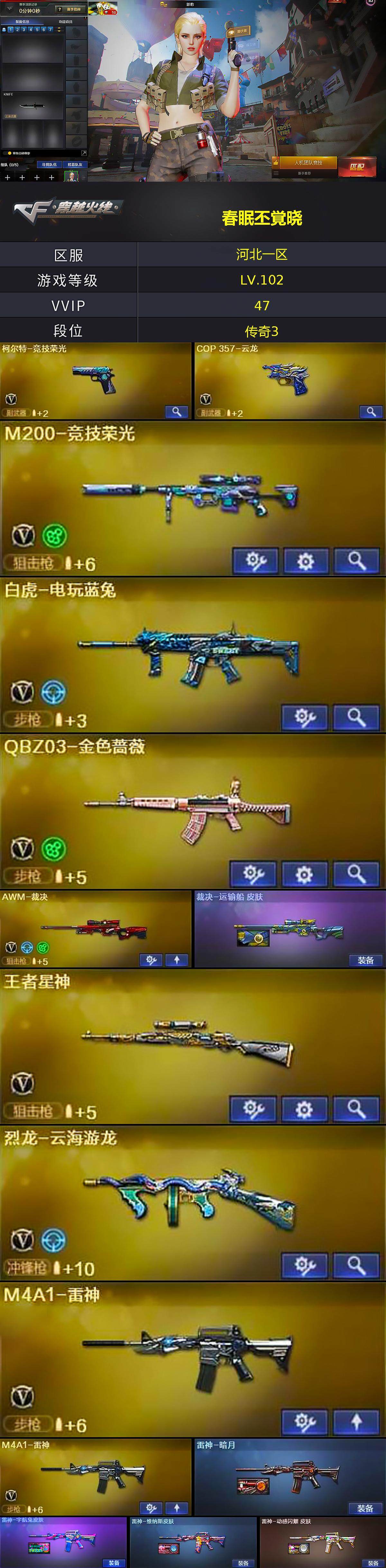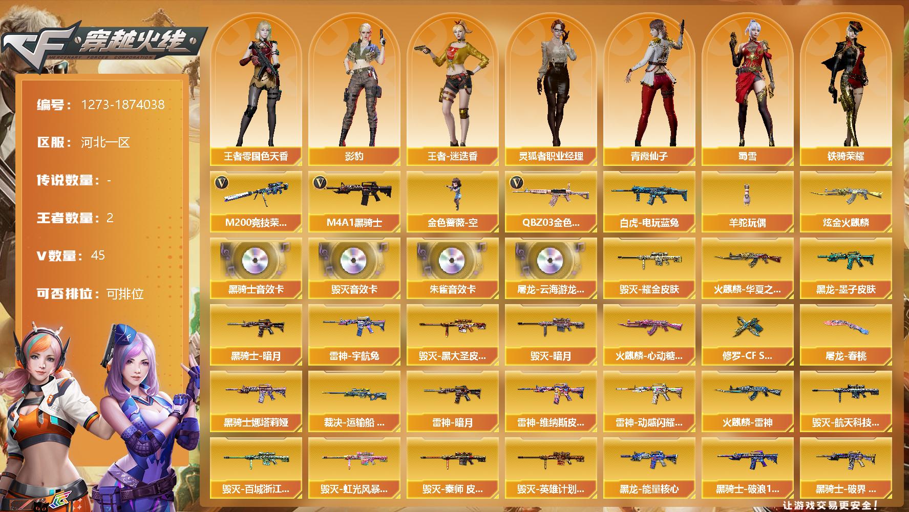 [15091750]河北一区-45V-2王者-1炫金 【热门武器】:QBZ03-金色蔷薇,M200-竞技荣光,白虎-电玩蓝兔,M4A1-黑骑士,金色蔷薇-空,羊驼玩偶 【王者炫金武器】:炫金火麒麟 【音效卡】:屠龙-云海游龙音效卡,M4A1-黑骑士音效卡,Barrett-毁灭音效卡,HK417-朱雀音效卡 【皮肤】:裁决-运输船 皮肤,雷神-暗月,雷神-宇航兔皮肤,雷神-维纳斯皮肤,雷神-动感闪耀 皮肤,火麒麟-