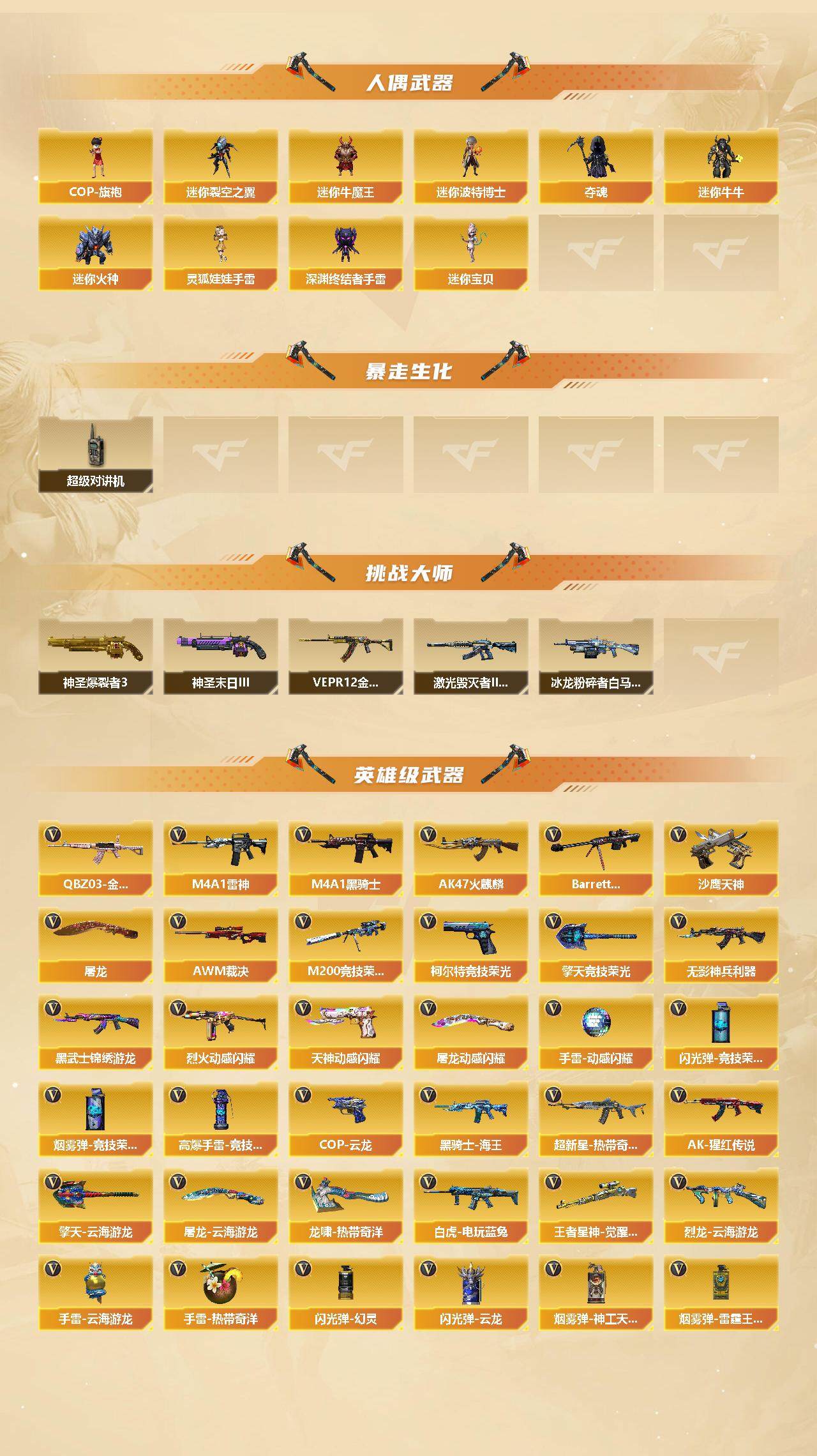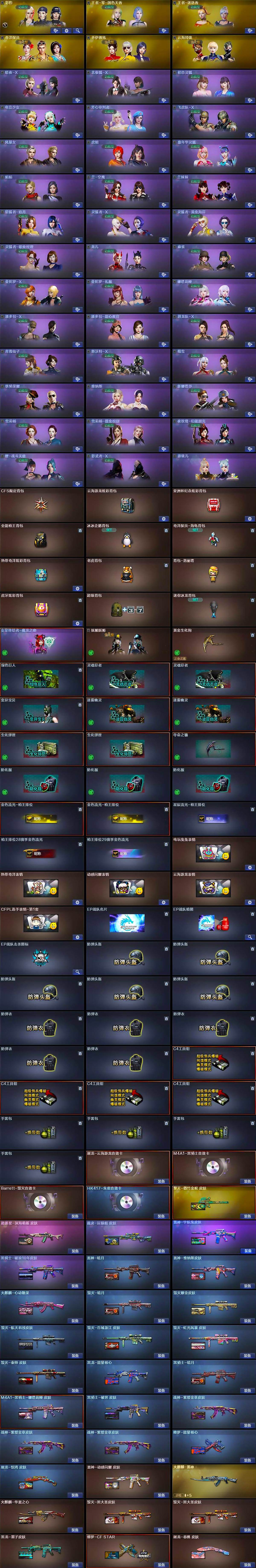 - [13654375]广西一区-34V-4王者-0炫金 【传说武器】:传说幽冥 【传说角色】:传说影煞 【热门武器】:传说幽冥,M14EBR-玄武,八面凌龙,Cat-刀锋,毒蜂,牛牛-AK47,M4A1-黑骑士,汤姆逊-烈龙*6,加特林-炼狱,羊驼玩偶 【音效卡】:M4A1-黑骑士音效卡,枪娘语音包-阿敏,M14EBR-玄武音效卡,炼狱-百战金芒-庆典舞曲音效卡,死神-雪域霜狐-怀旧音效卡 【皮肤】:裁决-流光秘银,裁决-运输船 皮肤,M4A1-再燃火线,火麒麟-大唐荣光,M4A1-千变-孔明皮肤*2,黑骑士-冠军之势,屠龙-破浪逐光 皮肤,屠龙-惊鸿 皮肤,轻型军用手斧-再燃火线 【角色】:王者潘多拉,雪域霜狐,奇洋探员,暗夜-X,北极狐-X,初恋灵狐,飞虎队-X,风暴女,嘉年华灵狐,兰-海滩派对,兰妹妹,龙儿-小淘气,萌儿,青霞仙子,斯沃特-X,蜀雪,铁骑荣耀,兔囡囡,维纳斯,夜玫瑰-宠粉,影武者-X 【人偶武器】:天龙-乔伊教练,Scar Light-马枪,斯泰尔-枪娘暗刃,加特林-机械猎手,AWM-灵狐-15周年嘉年华*2,海滩汪汪-巴雷特,Cat-刀锋,牛牛-AK47,迷你深渊冰龙,迷你裂空之翼,夺魂,迷你生化手雷,生化手雷-机甲核心*3,迷你巨石泰坦-魔花研究所,烟雾弹-迷雾幽灵 【暴走生化】:毒蜂,超级对讲机 【挑战大师】:冰龙粉碎者-白马银枪*3,激光毁灭者III-白马银枪,激光毁灭者III,试炼破坏者III 【英雄级武器】:AK47-火麒麟*2,M4A1-雷神,M4A1-黑骑士,AN94-超新星,M4A1-龙血,M14EBR-玄武,黑武士-锦绣游龙,八面凌龙,M4A1-玫瑰精灵,王者芳薇-觉醒版,Barrett-毁灭,AWM-裁决,王者之怒-觉醒版,加特林-炼狱,炼狱-百战金芒,汤姆逊-烈龙*6,沙鹰-天神,屠龙*3,龙啸,擎天,麒麟刺,麒麟刺-百战金芒,高爆手雷-幻灵,手雷-热带奇洋,M4A1-赤狱骑士 【道具】:BS战队炫彩背包,CFS限定背包,云山科技背包,云海游龙炫彩背包,奇洋探员-海龟背包,战舰背包,机械魔影背包-红色,炫彩背包-诺拉,百战金芒炫彩背包,老虎背包,背包-洛丽塔,超级背包,雪域霜狐炫彩背包,圣拳猎手-炽雪,虚空终结者-暗域熔岩,女皇终结者-魔龙之吻,救世主-黑桃战神,黄金生化钩,绿色巨人,灵魂忍者*2,变异宝贝,迷雾幽灵*2,生化弹匣,夺命之镰