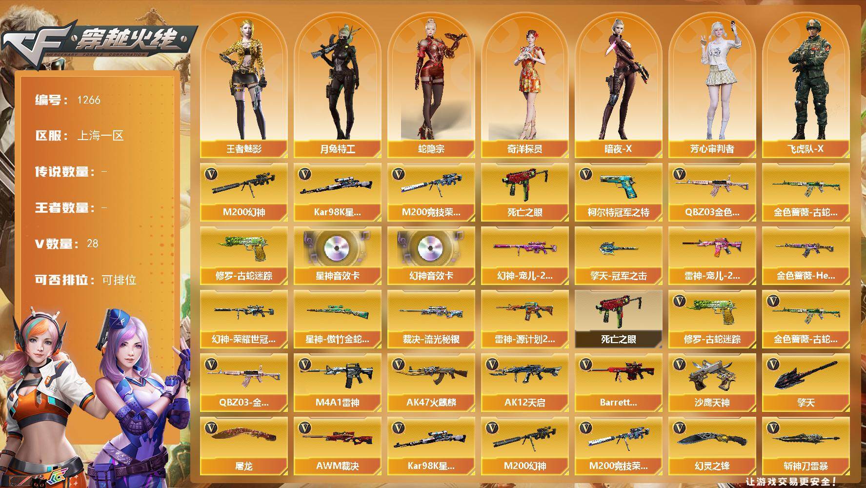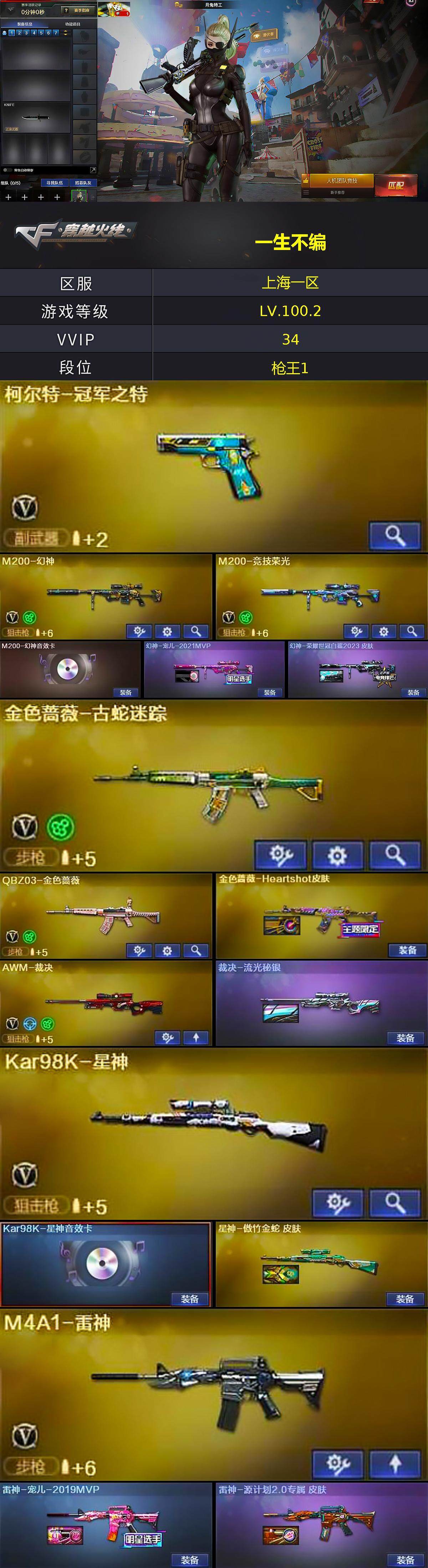 [15092851]上海一区-28V-0王者-0炫金 【热门武器】:QBZ03-金色蔷薇,M200-幻神,金色蔷薇-古蛇迷踪,修罗-古蛇迷踪,M200-竞技荣光,死亡之眼,柯尔特-冠军之特,Kar98K-星神 【音效卡】:M200-幻神音效卡,Kar98K-星神音效卡 【皮肤】:幻神-宠儿-2021MVP,幻神-荣耀世冠白鲨2023 皮肤,金色蔷薇-Heartshot皮肤,裁决-流光秘银,星神-傲竹金蛇 皮肤,雷