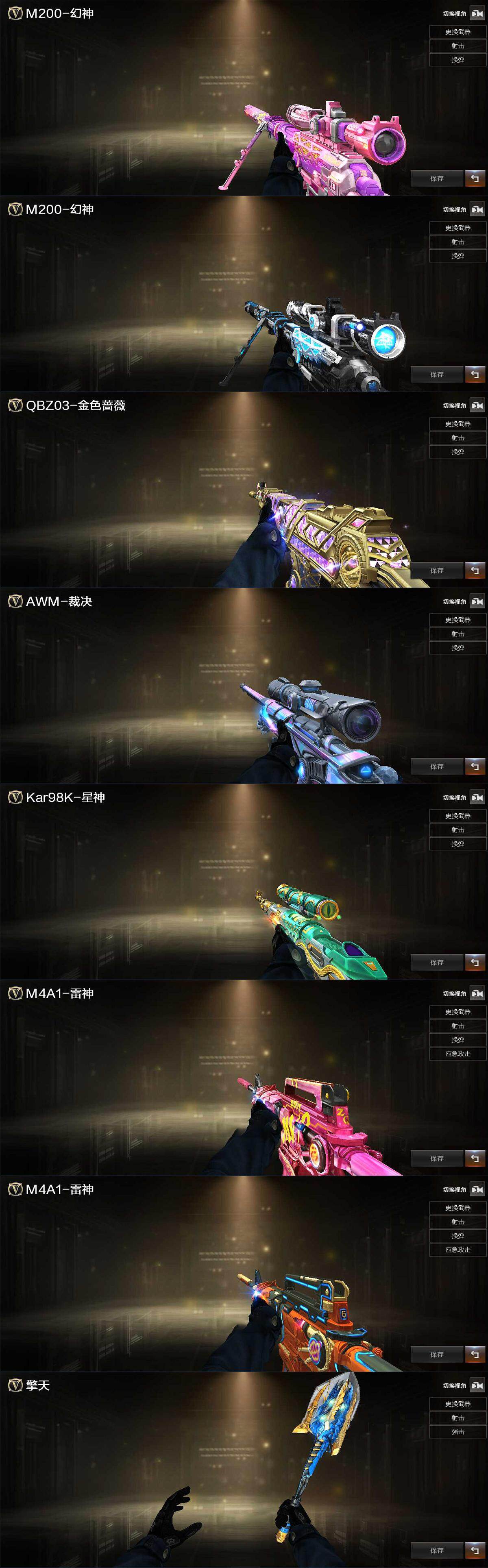 【热门武器】:QBZ03-金色蔷薇,M200-幻神,金色蔷薇-古蛇迷踪,修罗-古蛇迷踪,M200-竞技荣光,死亡之眼,柯尔特-冠军之特,Kar98K-星神